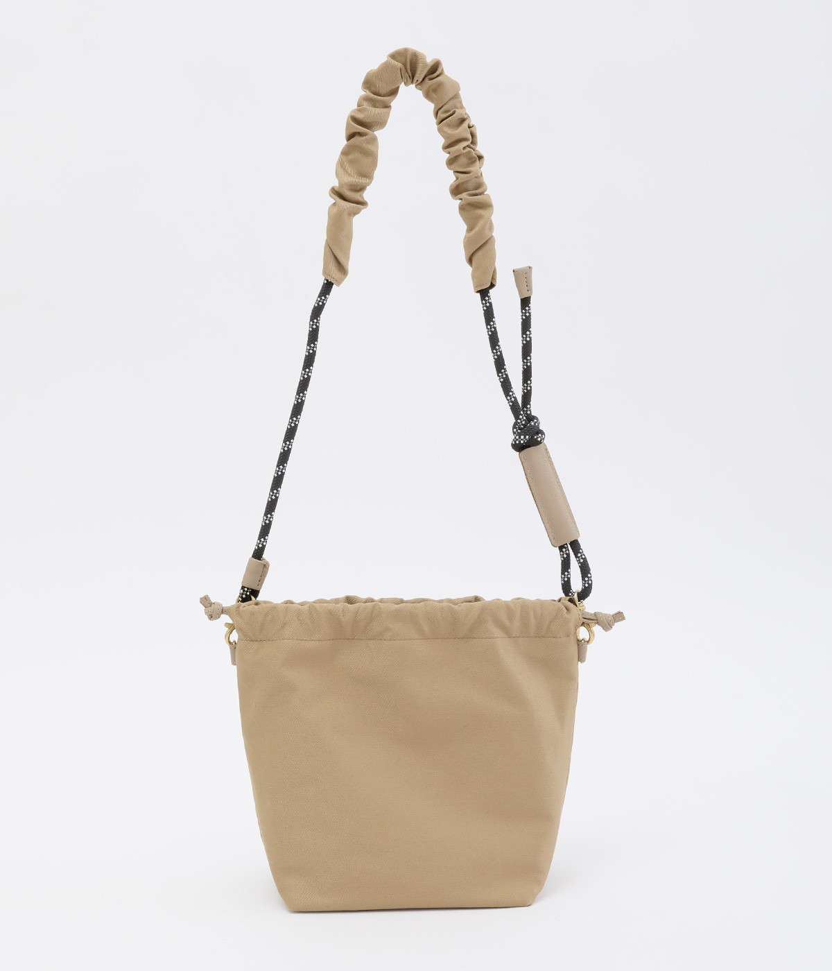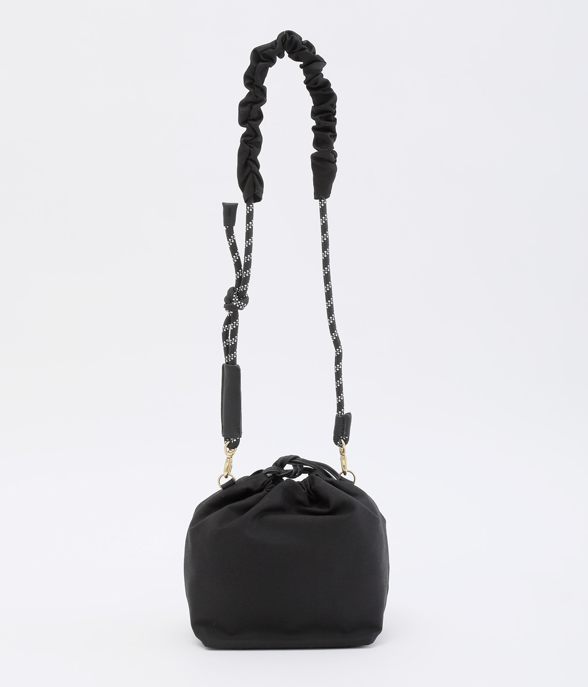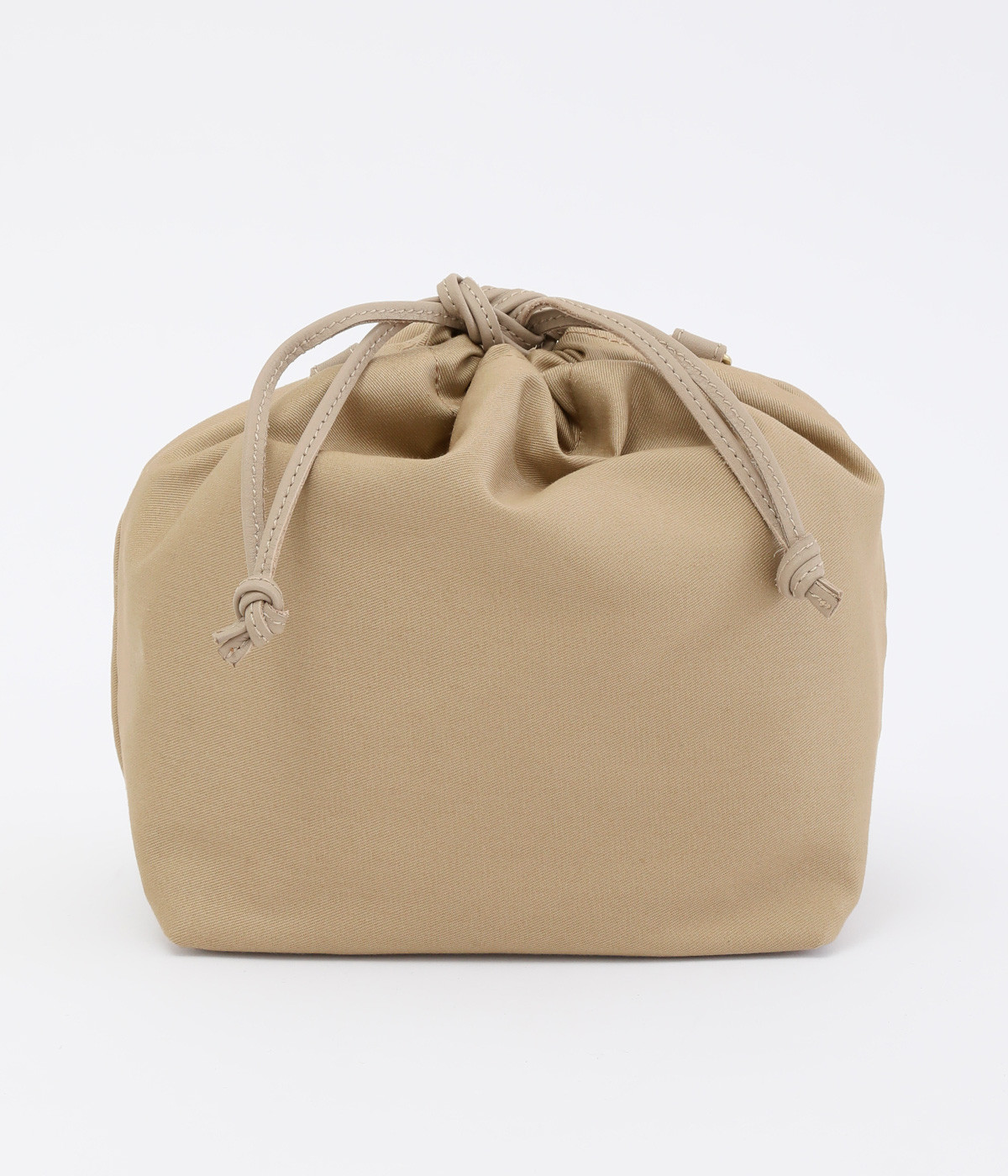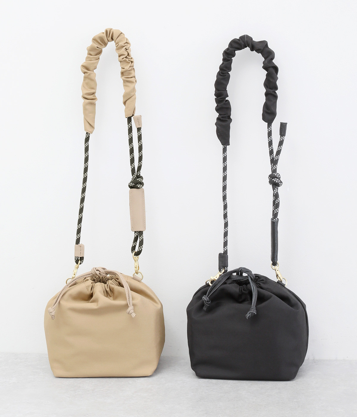手提げの巾着としても、ショルダーバッグとしても使える2way仕様です。ころんとしたフォルムが着こなしのポイントにも。取り外し可能なショルダーは、コードの一部を布で覆って肩への負担を軽減しつつアクセントになっています。