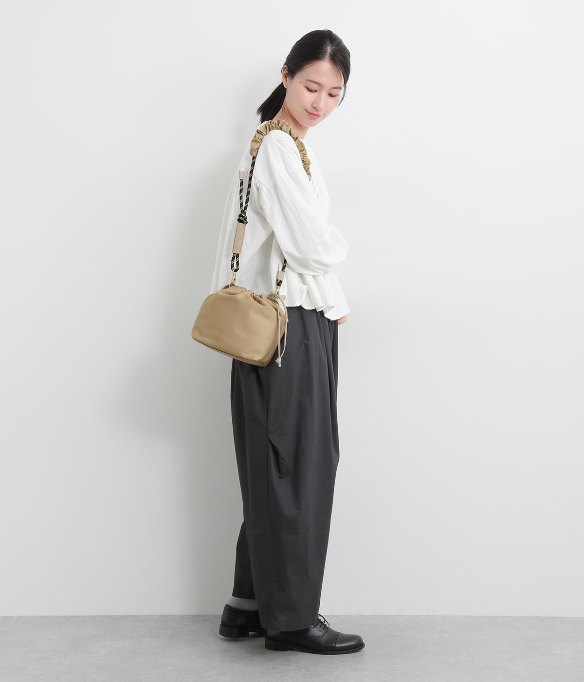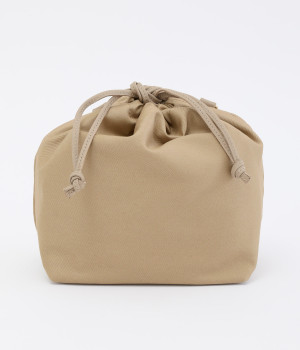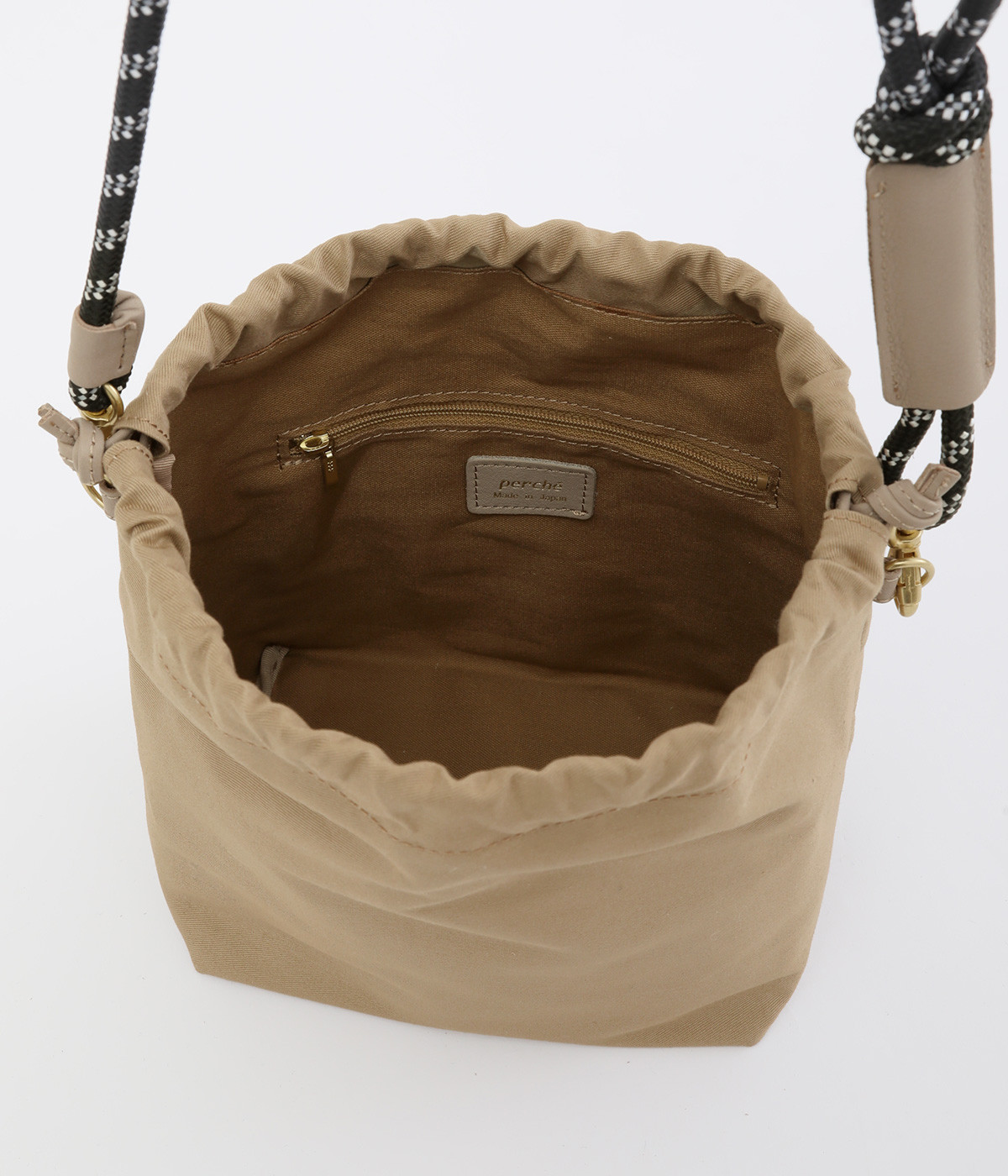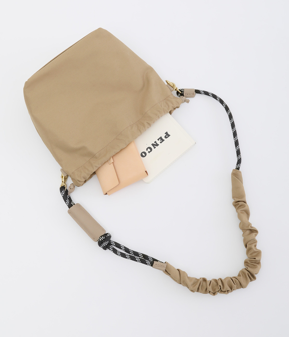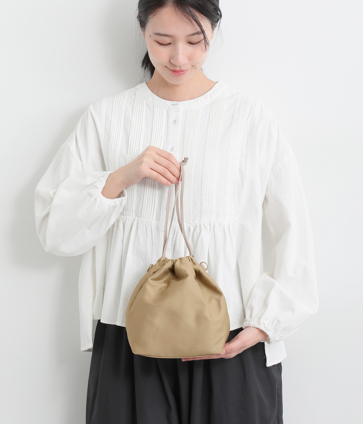 手提げの巾着としても、ショルダーバッグとしても使える2way仕様です。ころんとしたフォルムが着こなしのポイントにも。取り外し可能なショルダーは、コードの一部を布で覆って肩への負担を軽減しつつアクセントになっています。