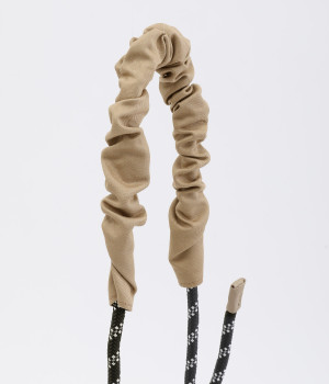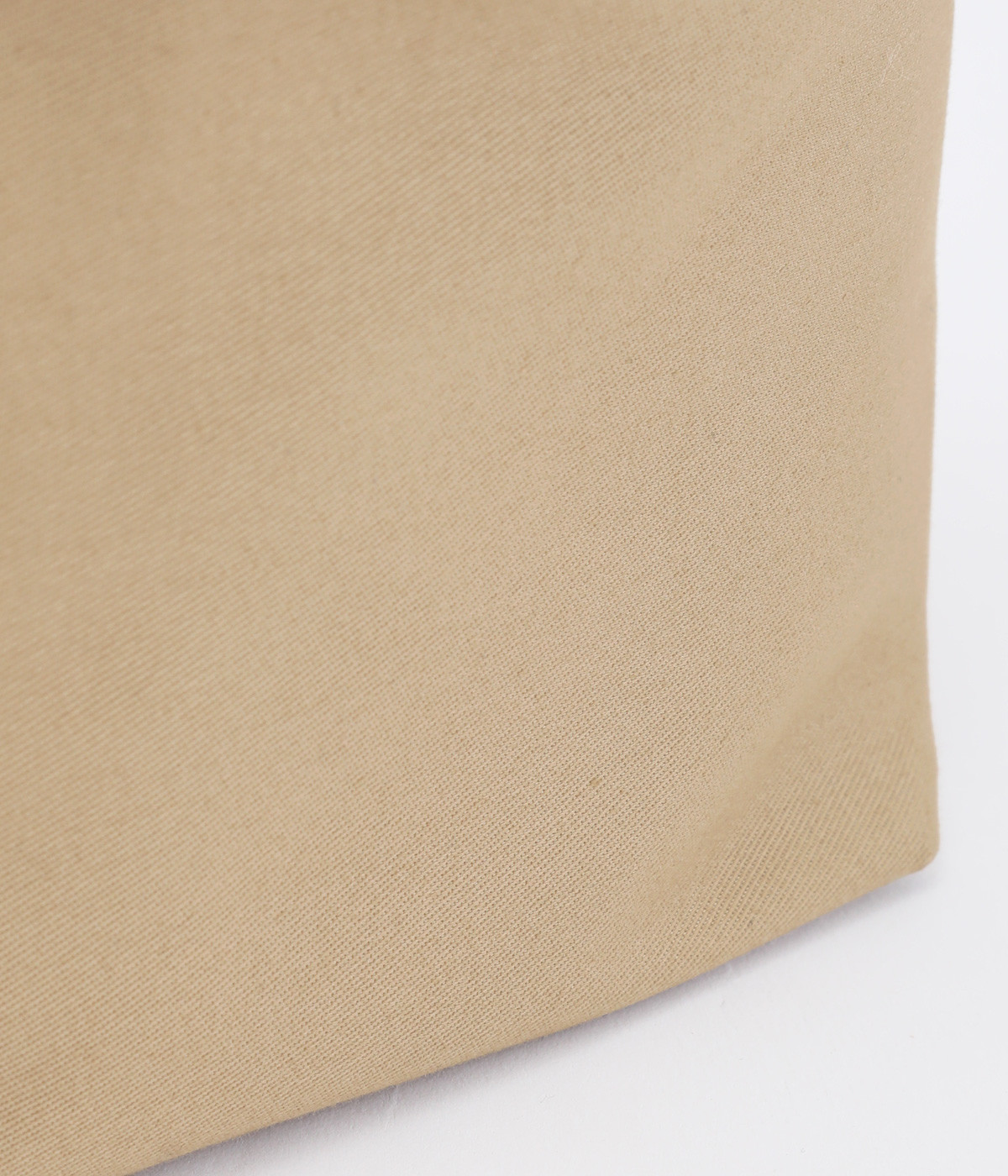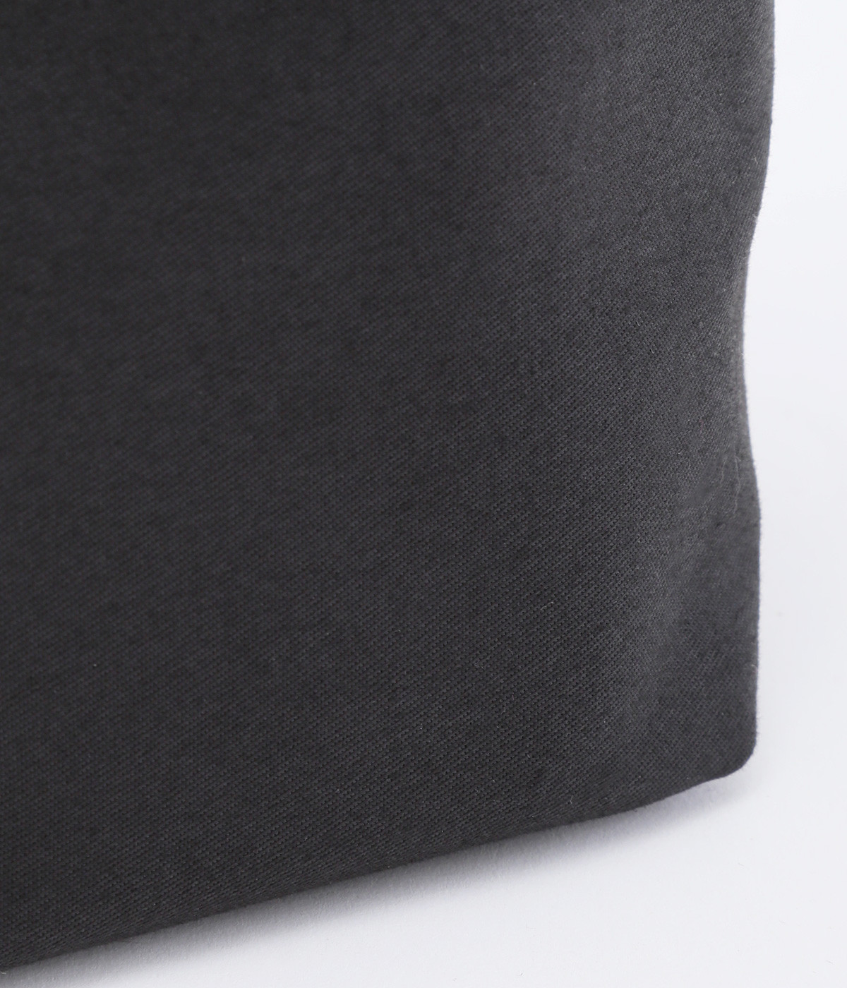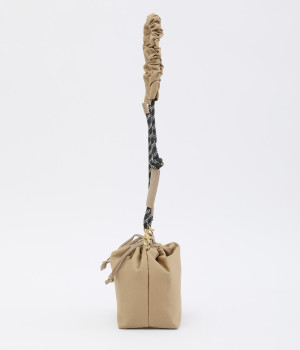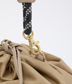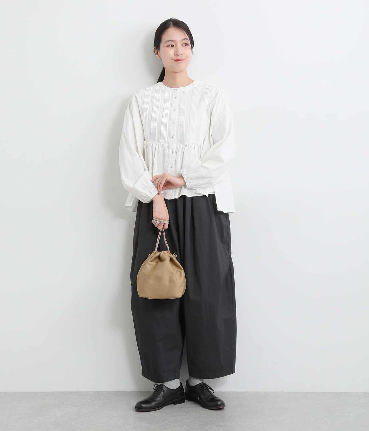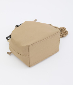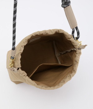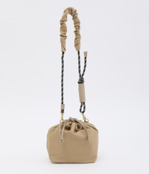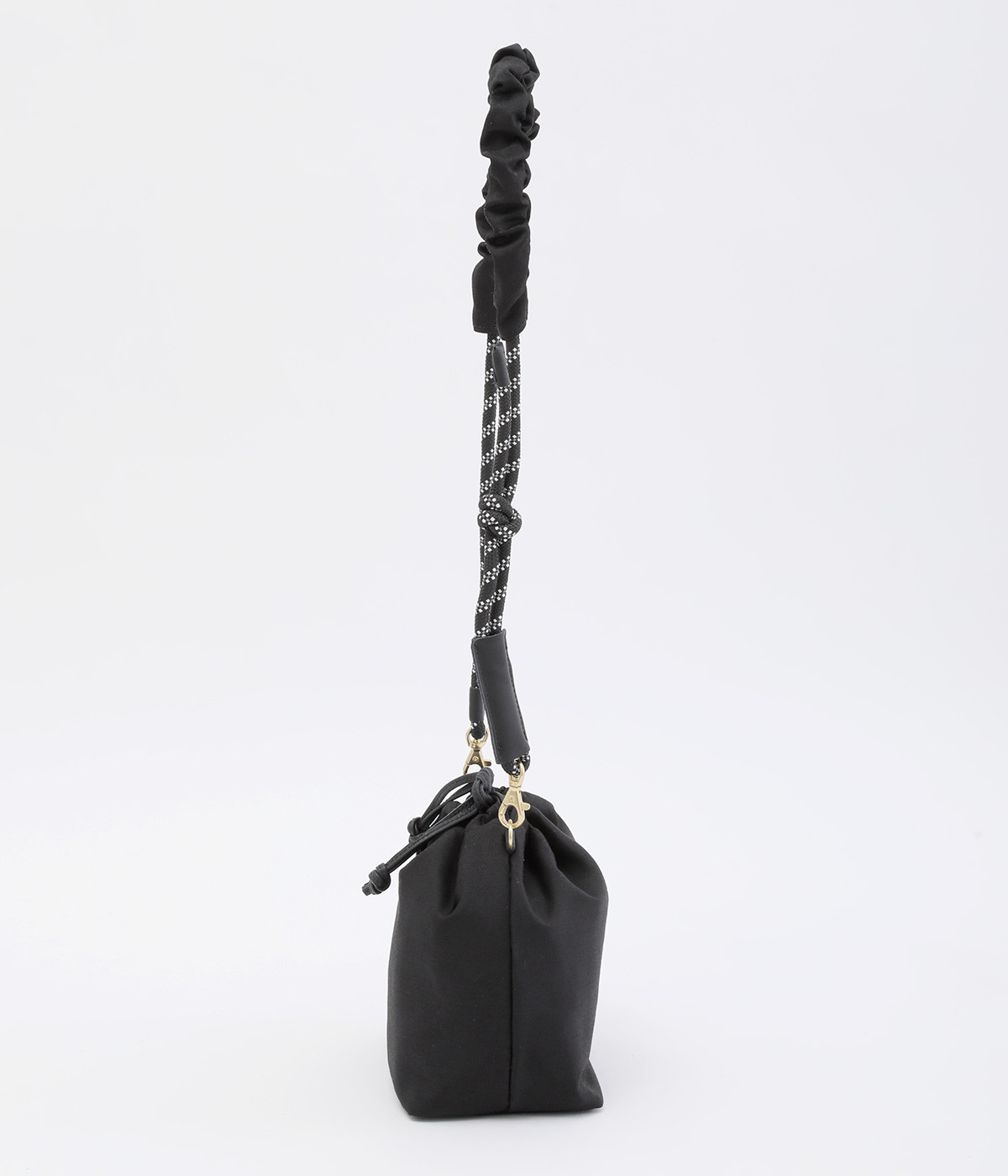 手提げの巾着としても、ショルダーバッグとしても使える2way仕様です。ころんとしたフォルムが着こなしのポイントにも。取り外し可能なショルダーは、コードの一部を布で覆って肩への負担を軽減しつつアクセントになっています。
