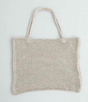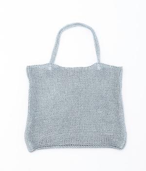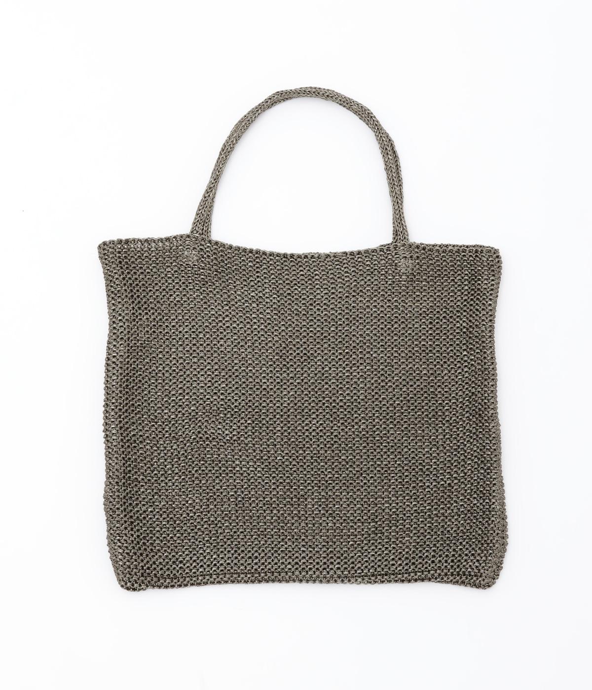 ざっくりとした編み地にラメ糸のきらめきが映える、表情ゆたかなトートバッグです。荷物を入れると生地が縦に伸びて落ち感が出るので、こなれた雰囲気が出ます。長財布や500mlのボトルがきれいに収まるサイズ感も◎。折りたたんで持ち運べるので、サブバッグとして使うのもおすすめです。