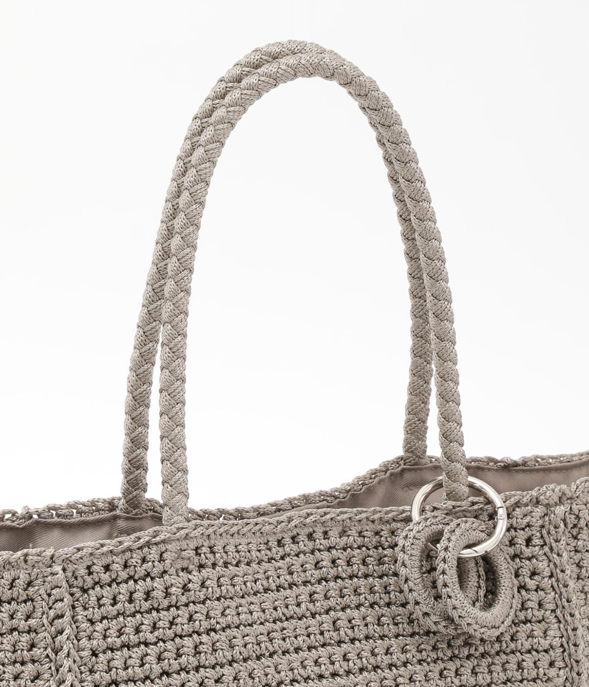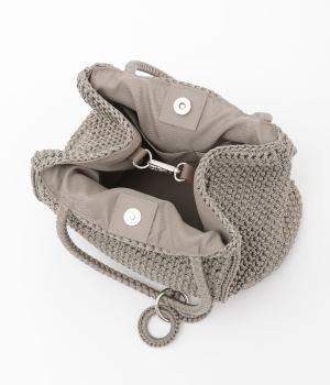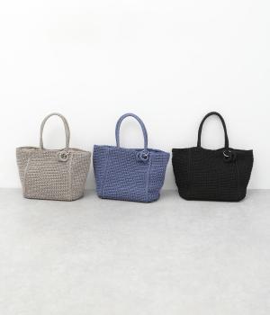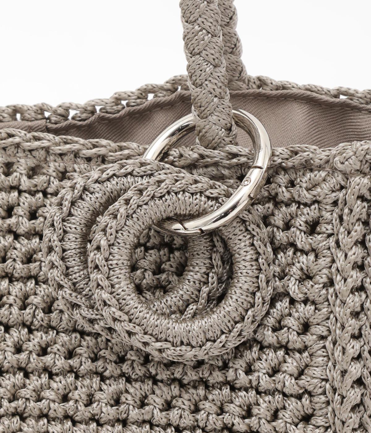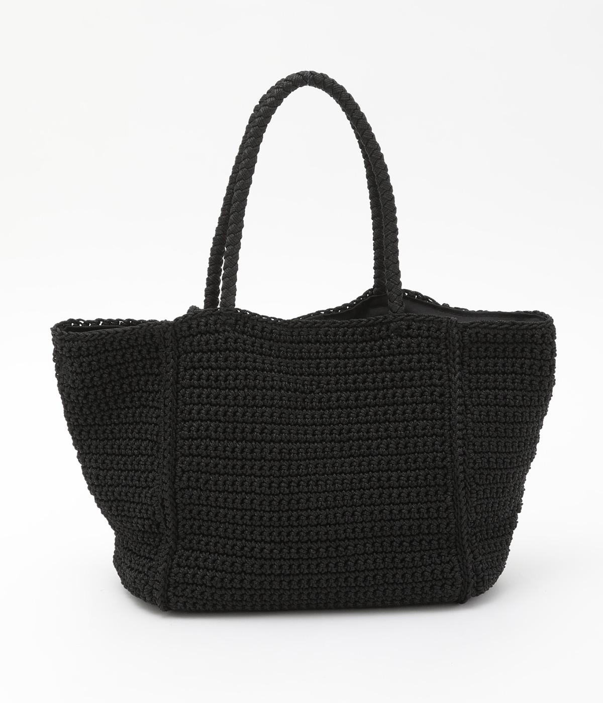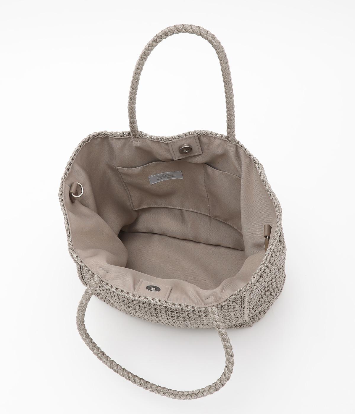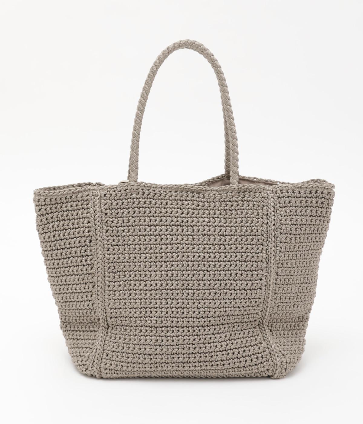 ほどよい光沢でナチュラル感とスタイリッシュさを併せ持ったポリエステル製のクロシェトート。やわらかく丁寧に編みこみ、内布付きで耐久性もアップ。