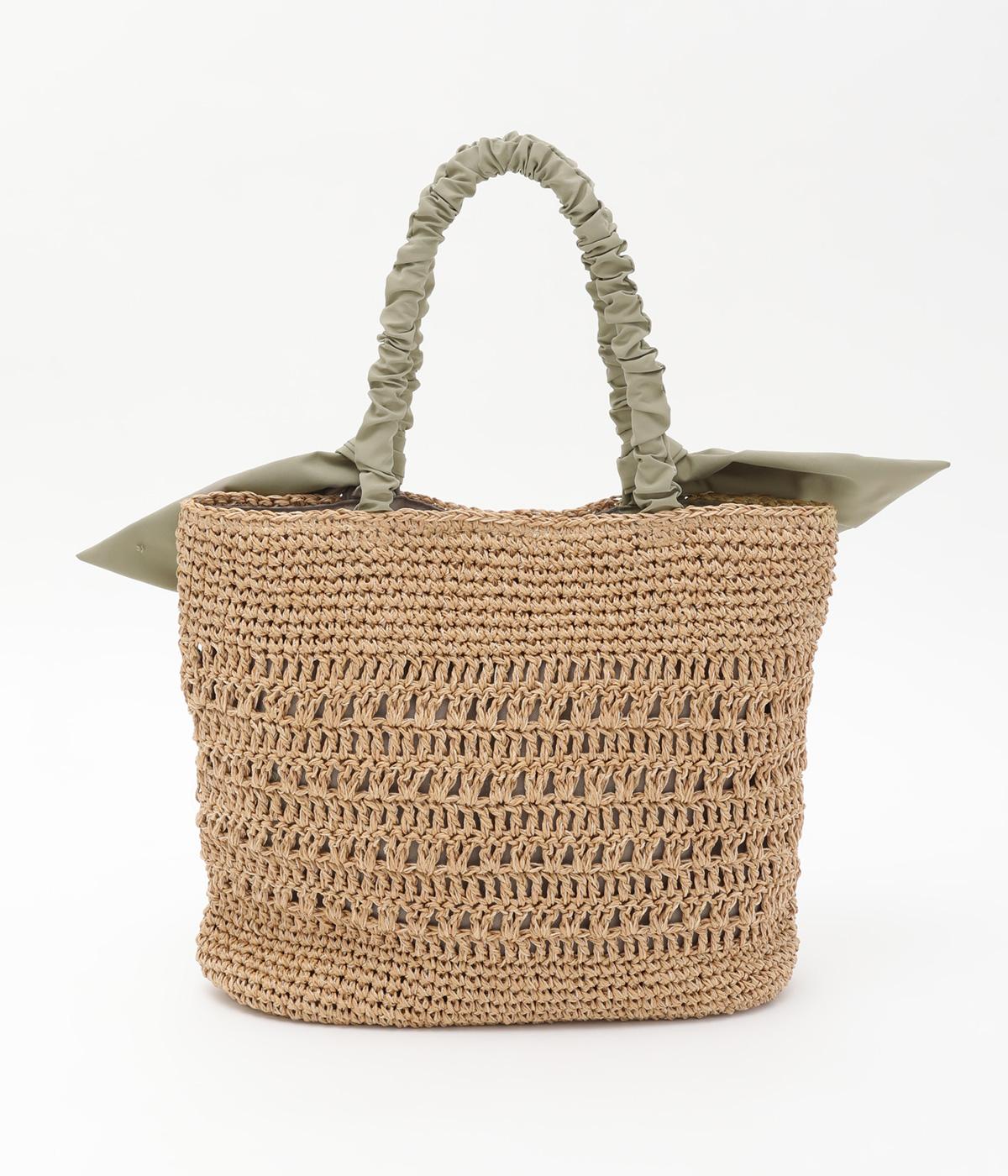 ペーパー素材を用いて軽やかに編み上げたトートバッグ。ハンドルやリボンにはシャリ感のあるタフな素材を配置し、内布つきで強度も◎。