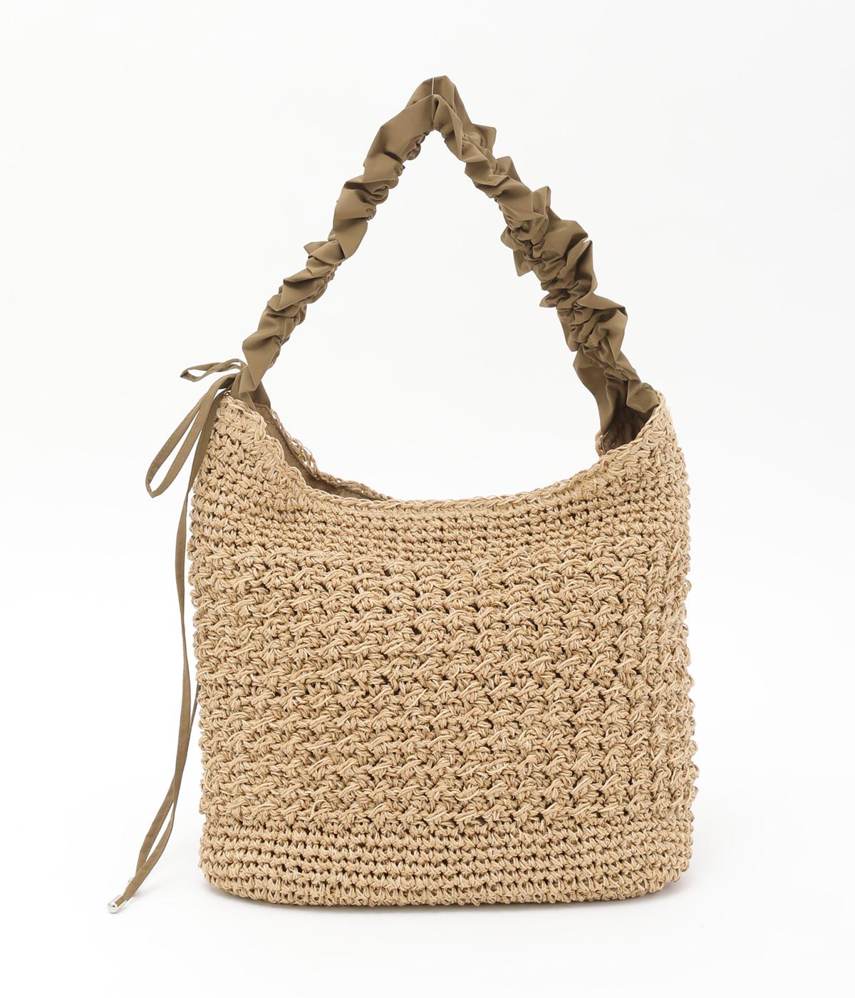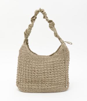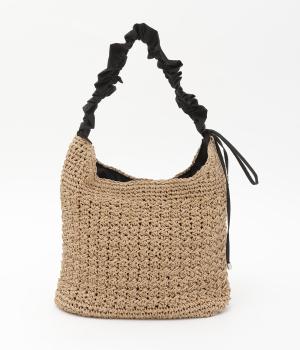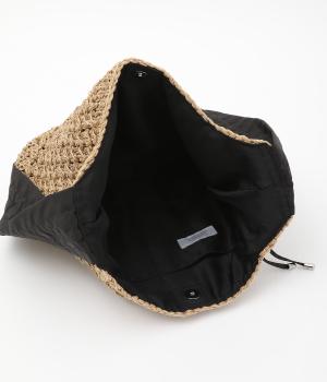 地柄編みで表情をもたせたカゴバッグにハリのある異素材を配してシティライクに仕上げました。ドロストコードをしぼることでハンドルの長さやギャザー感をアレンジできます。マグネットボタン開閉や内ポケットで実用性もアップ。