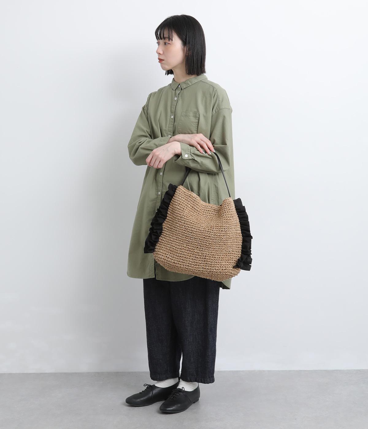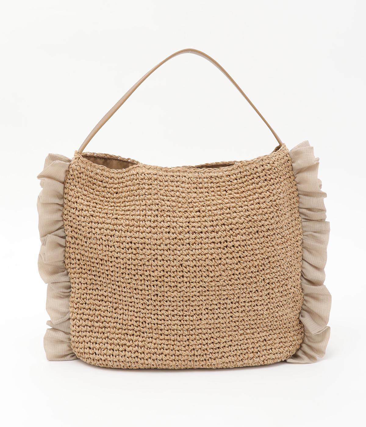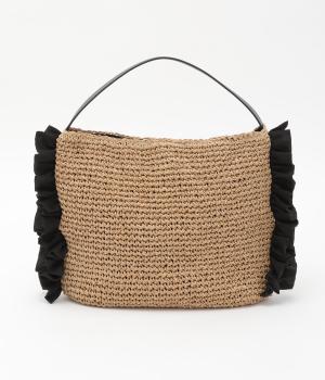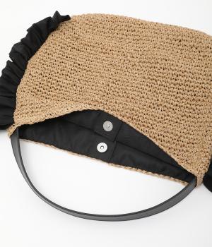 すっきりと編み上げたカゴバッグのサイドにフリルをほどこして可愛らしい要素をトッピング。フェイクレザーのハンドルが甘さを中和し、カジュアルからガーリーまで幅広く活躍。マグネットボタンや内ポケットを配して使い勝手も◎。