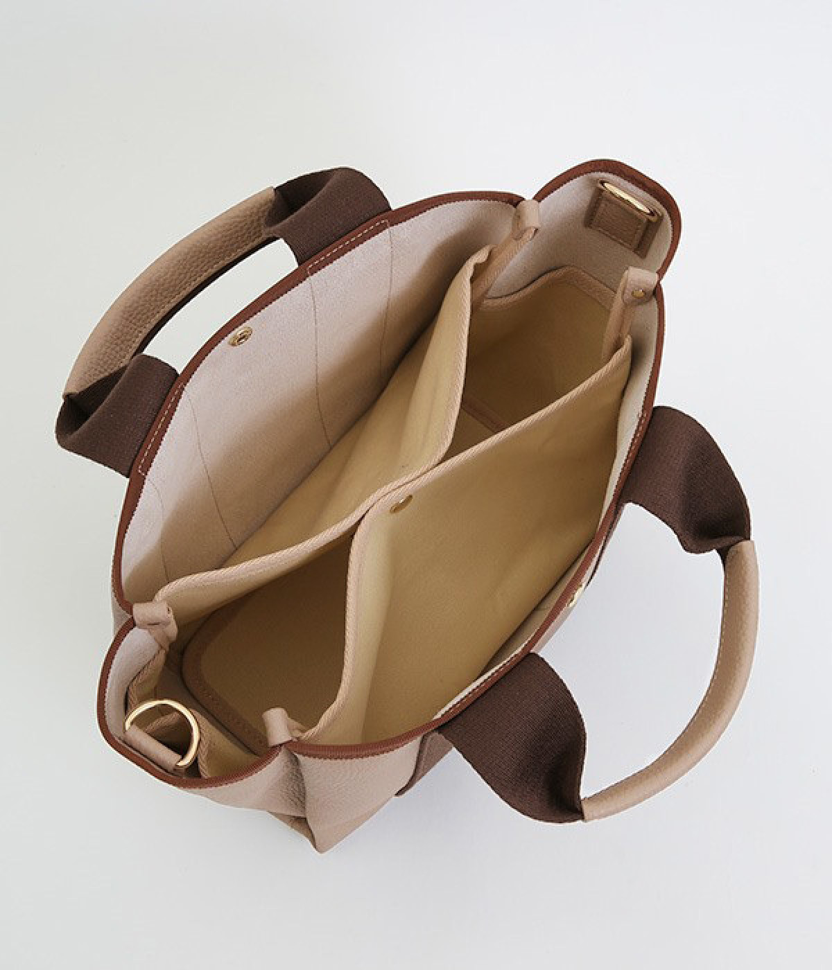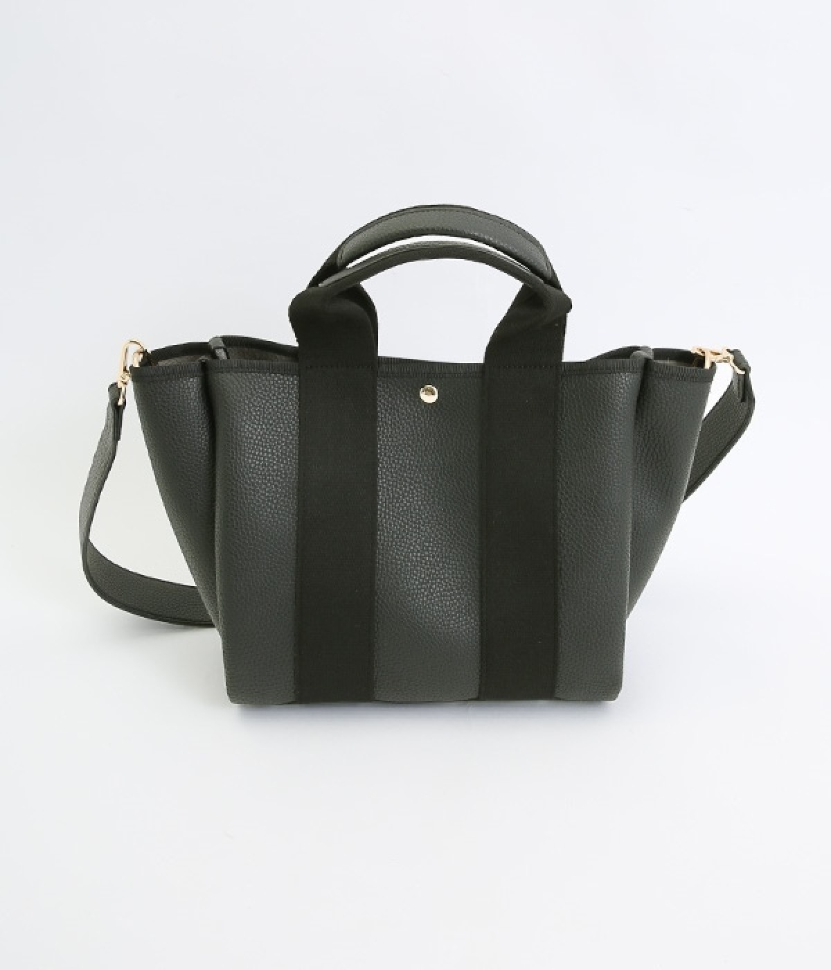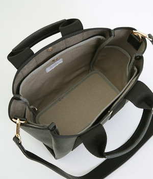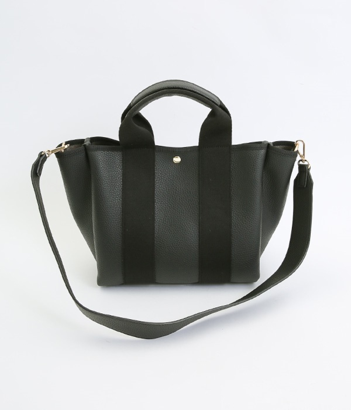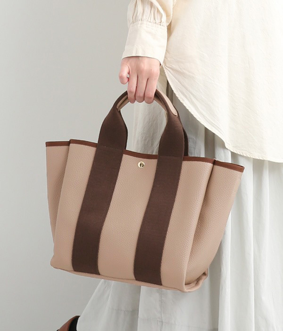 軽さがあり、お手入れもしやすい合皮のバッグにテープハンドルをプラスした大人カジュアルなトートバッグです。取り外し可能の肩掛けできる太ショルダーが今年らしい雰囲気。内側をぐるりと囲むように大きめのポケット×2、小さ目のポケット×2で配した高い機能性も◎。マチも広くデイリーユースにぴったりなアイテムです。