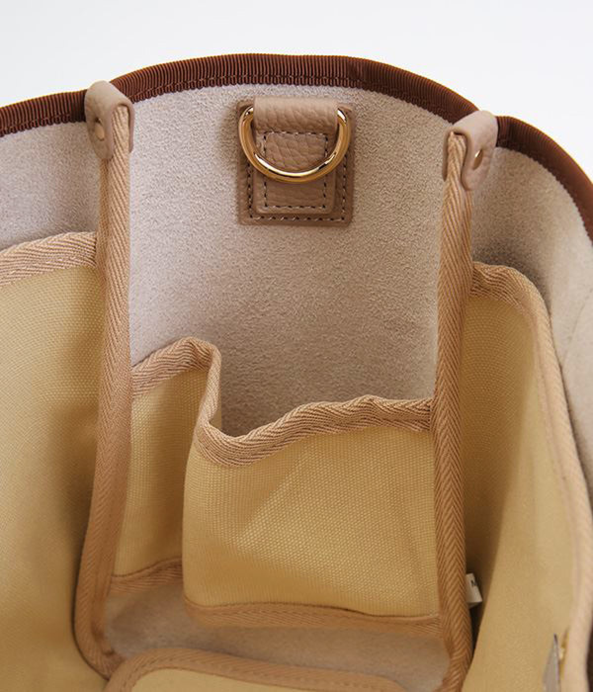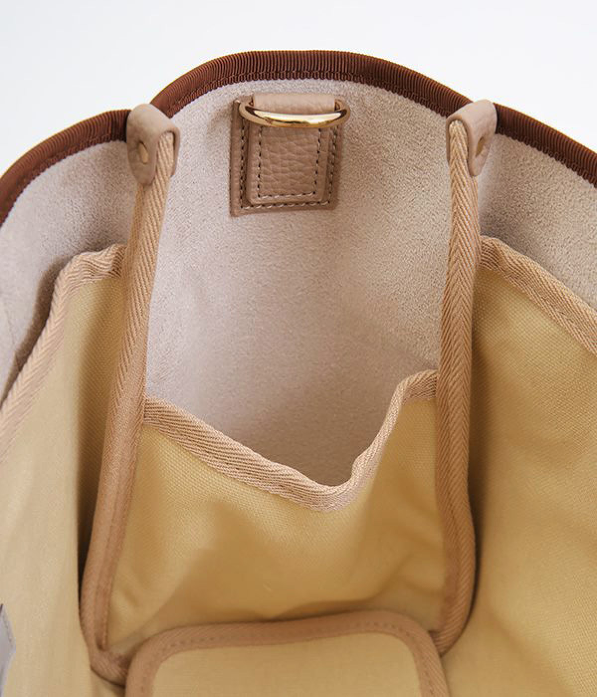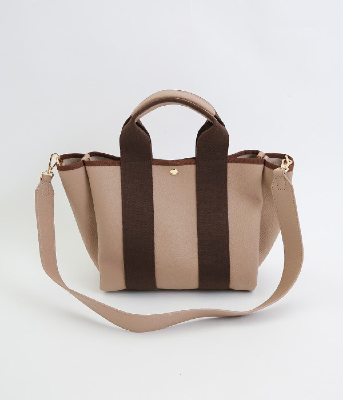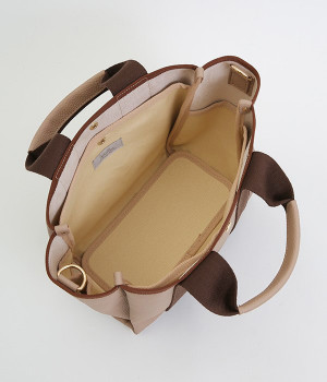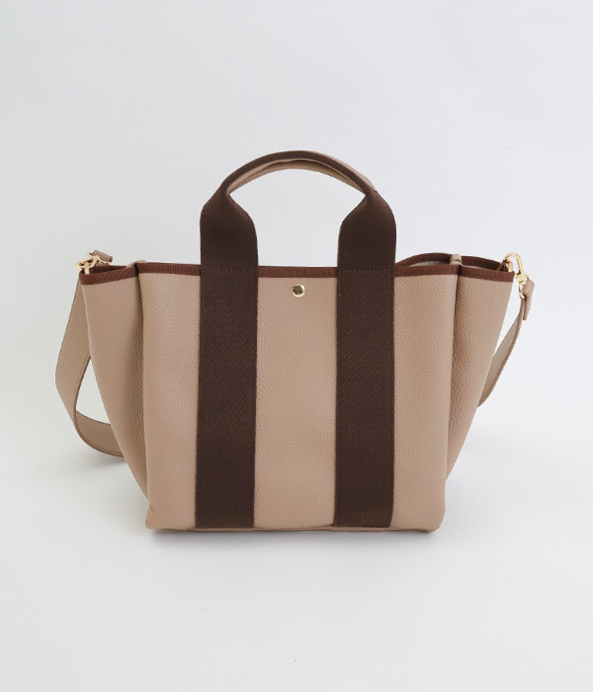 軽さがあり、お手入れもしやすい合皮のバッグにテープハンドルをプラスした大人カジュアルなトートバッグです。取り外し可能の肩掛けできる太ショルダーが今年らしい雰囲気。内側をぐるりと囲むように大きめのポケット×2、小さ目のポケット×2で配した高い機能性も◎。マチも広くデイリーユースにぴったりなアイテムです。