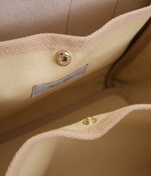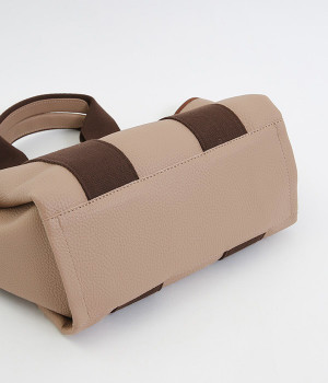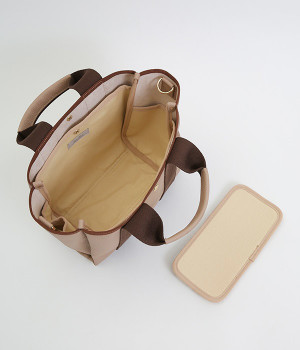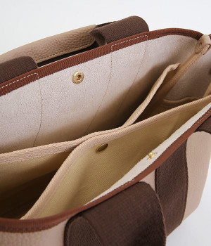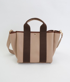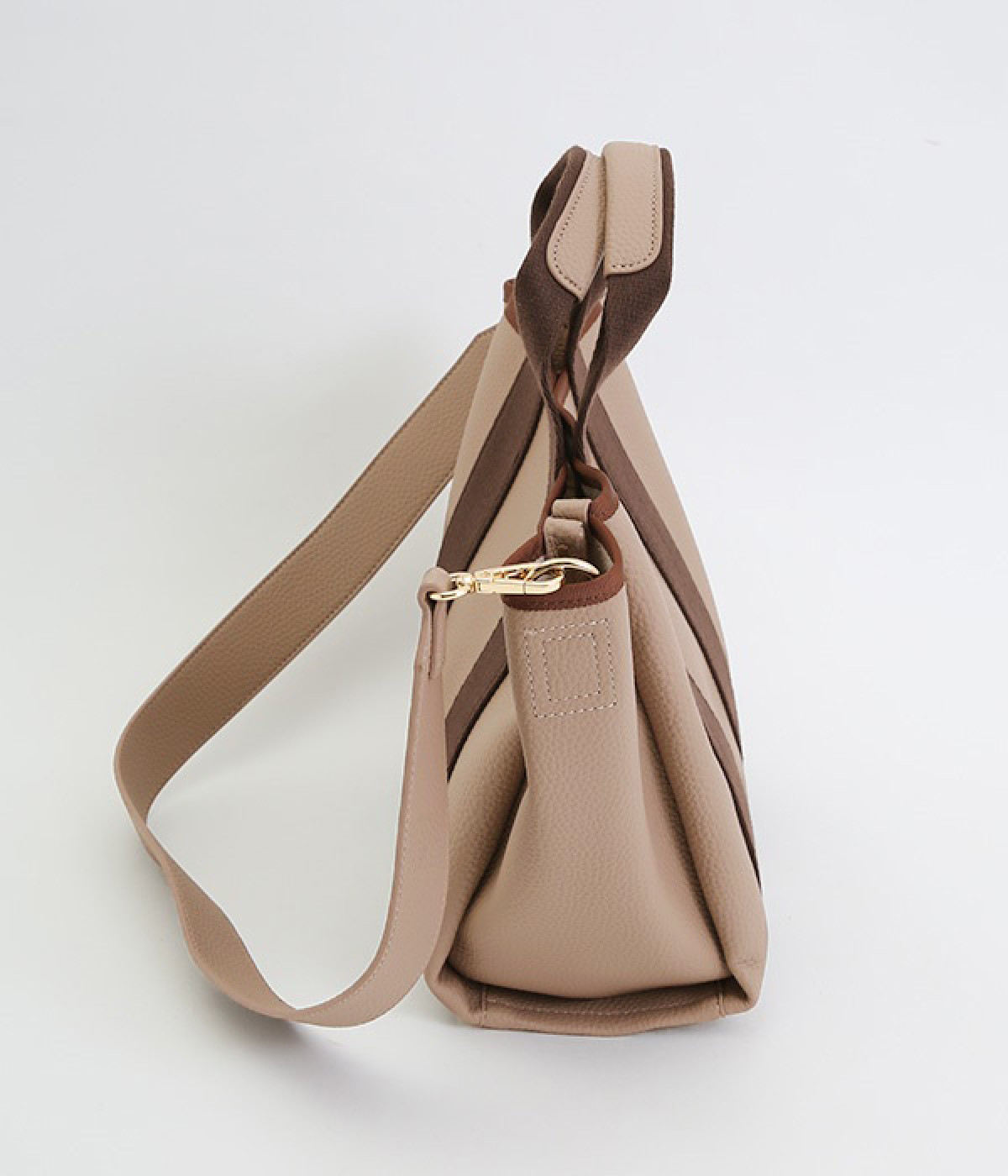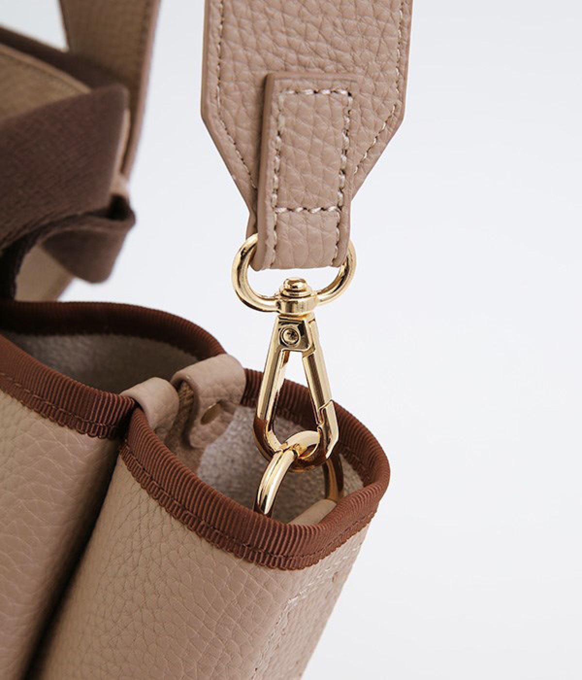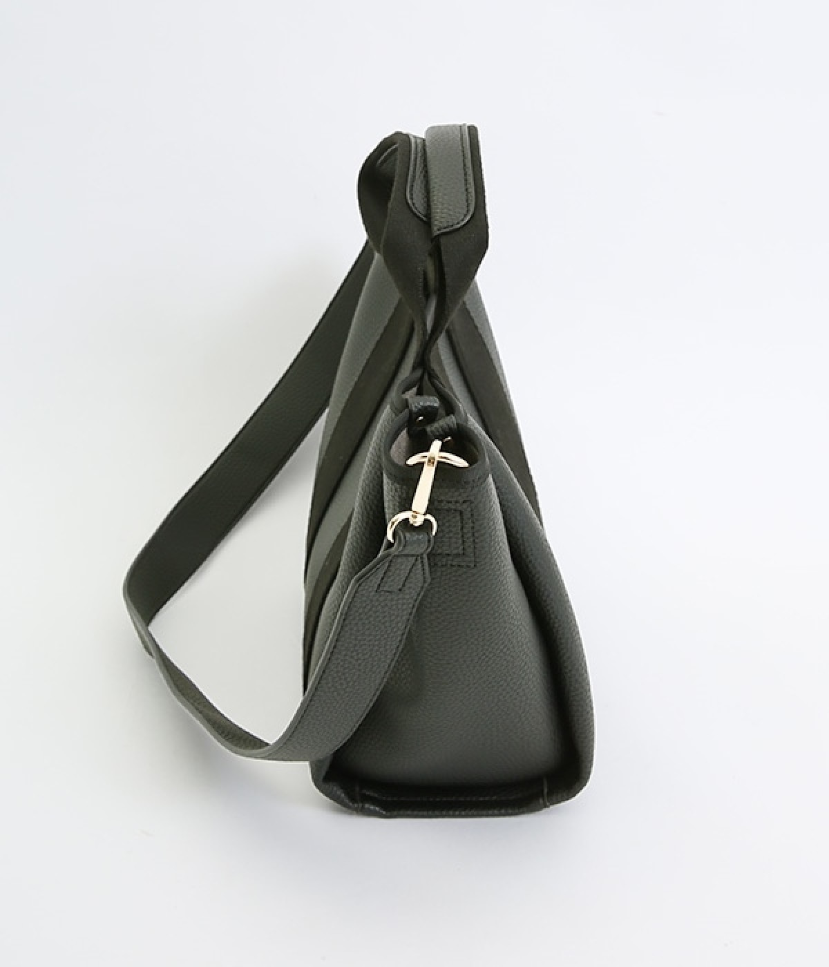 軽さがあり、お手入れもしやすい合皮のバッグにテープハンドルをプラスした大人カジュアルなトートバッグです。取り外し可能の肩掛けできる太ショルダーが今年らしい雰囲気。内側をぐるりと囲むように大きめのポケット×2、小さ目のポケット×2で配した高い機能性も◎。マチも広くデイリーユースにぴったりなアイテムです。