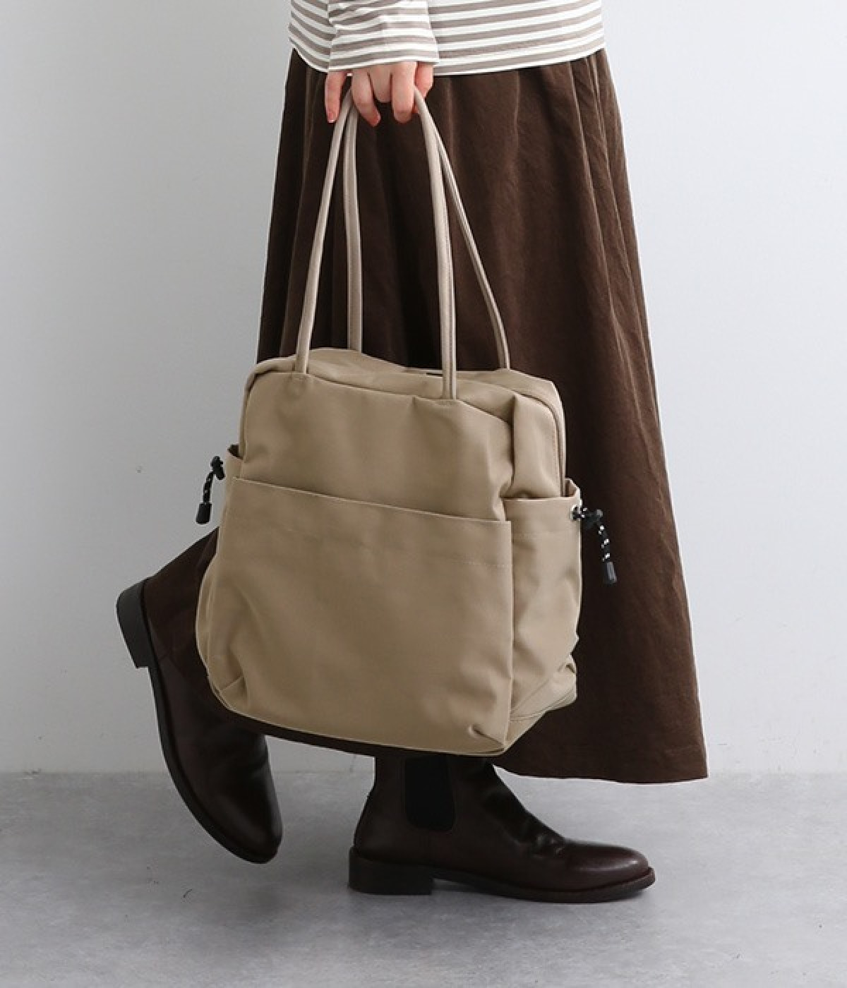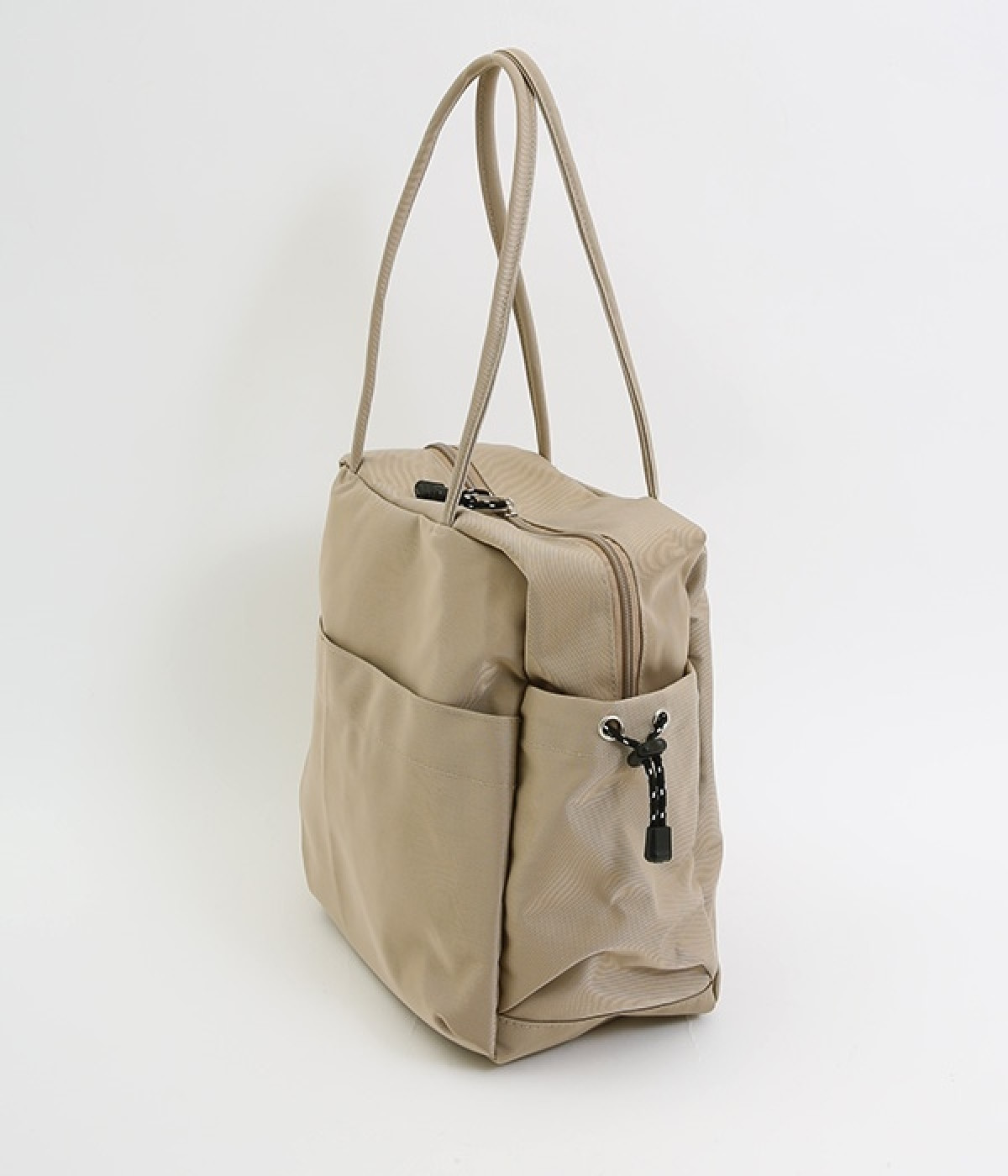 スクエア型が新鮮なナイロン製のトートバッグ。サイドポケット部分にアジャスターコードを用い、アウトドア風のテイストを盛り込みました。B5サイズのノート類が入り、マチも広く設定されていてデイリーユースにぴったりな容量。さっと肩に掛けられるハンドルの長さや、開閉の方向が自由なダブルファスナー方式も、機能性を高めるポイントです。