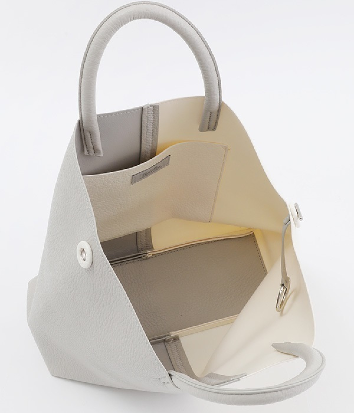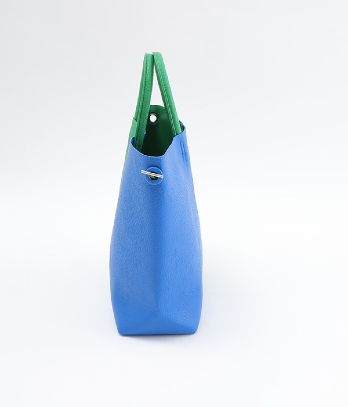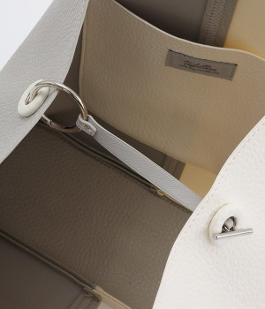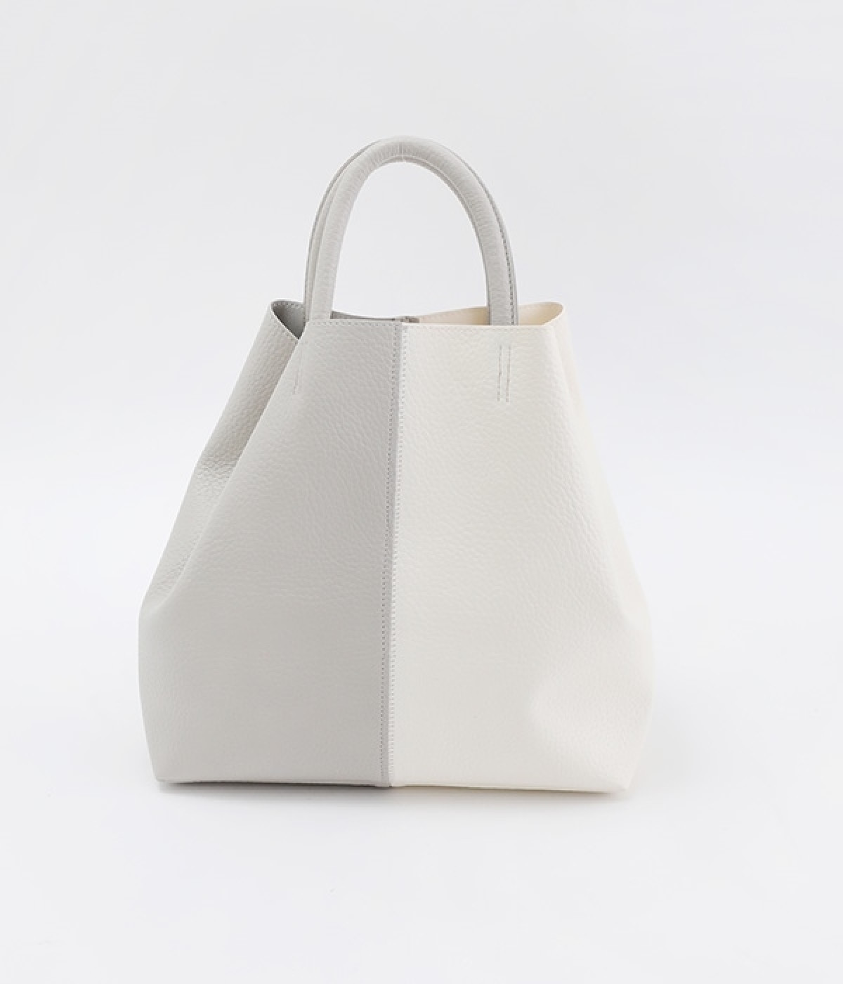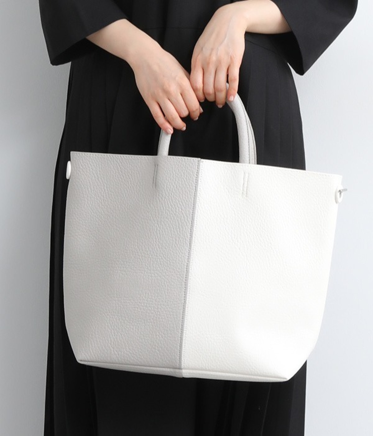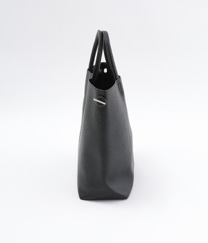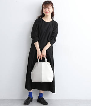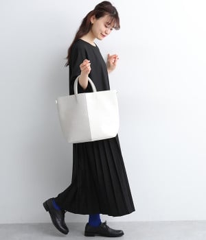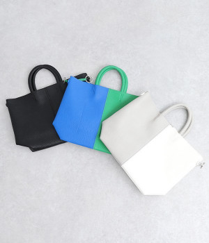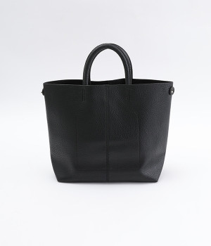 付属のチャームでフォルムを大きく変えられるフレキシブルなトートバッグ。サイドの丸いホールにチャームを引っかけると台形型に、チャームを垂らしたままだとスクエア型にと容量に応じた使い分けが可能です。長財布や500mlペットボトル、ポーチなどの必需品がしっかりとおさまるサイズ感でデイリー向き。ハンドルにはソフトな弾力があるため、手にやさしくなじみ握りやすいつくりです。細かなシボが出ているフェイクレザーのくったりとした風合いが、いつもの着こなしにこなれ感を出してくれます。