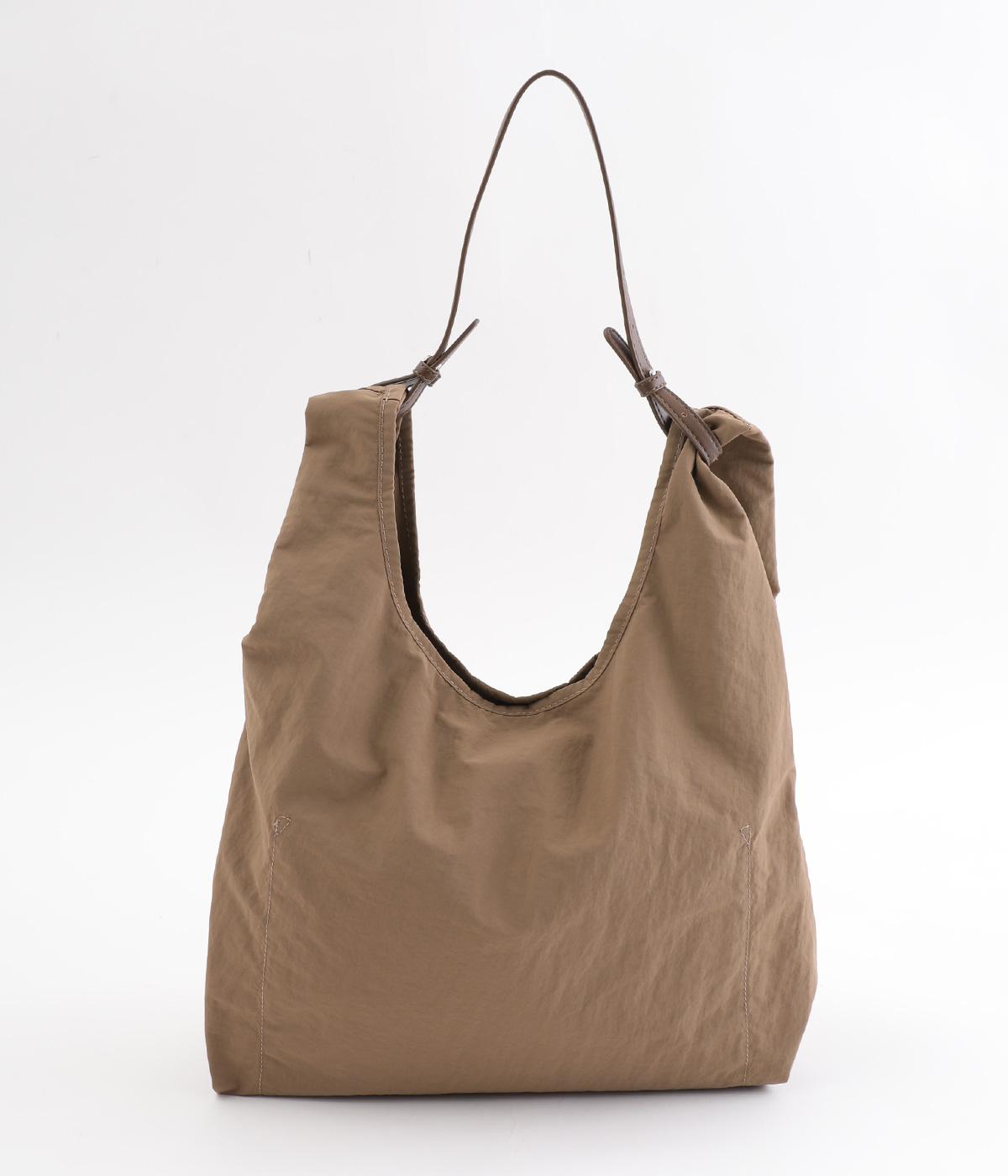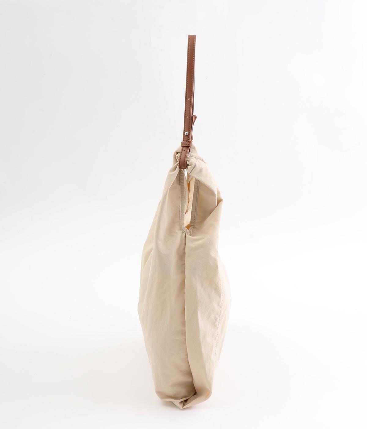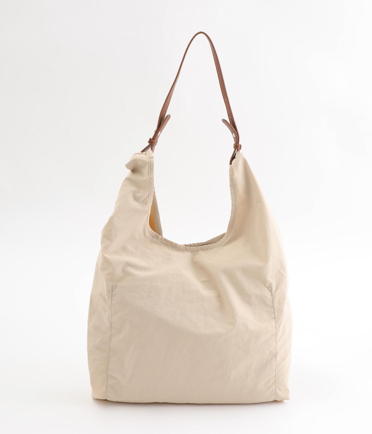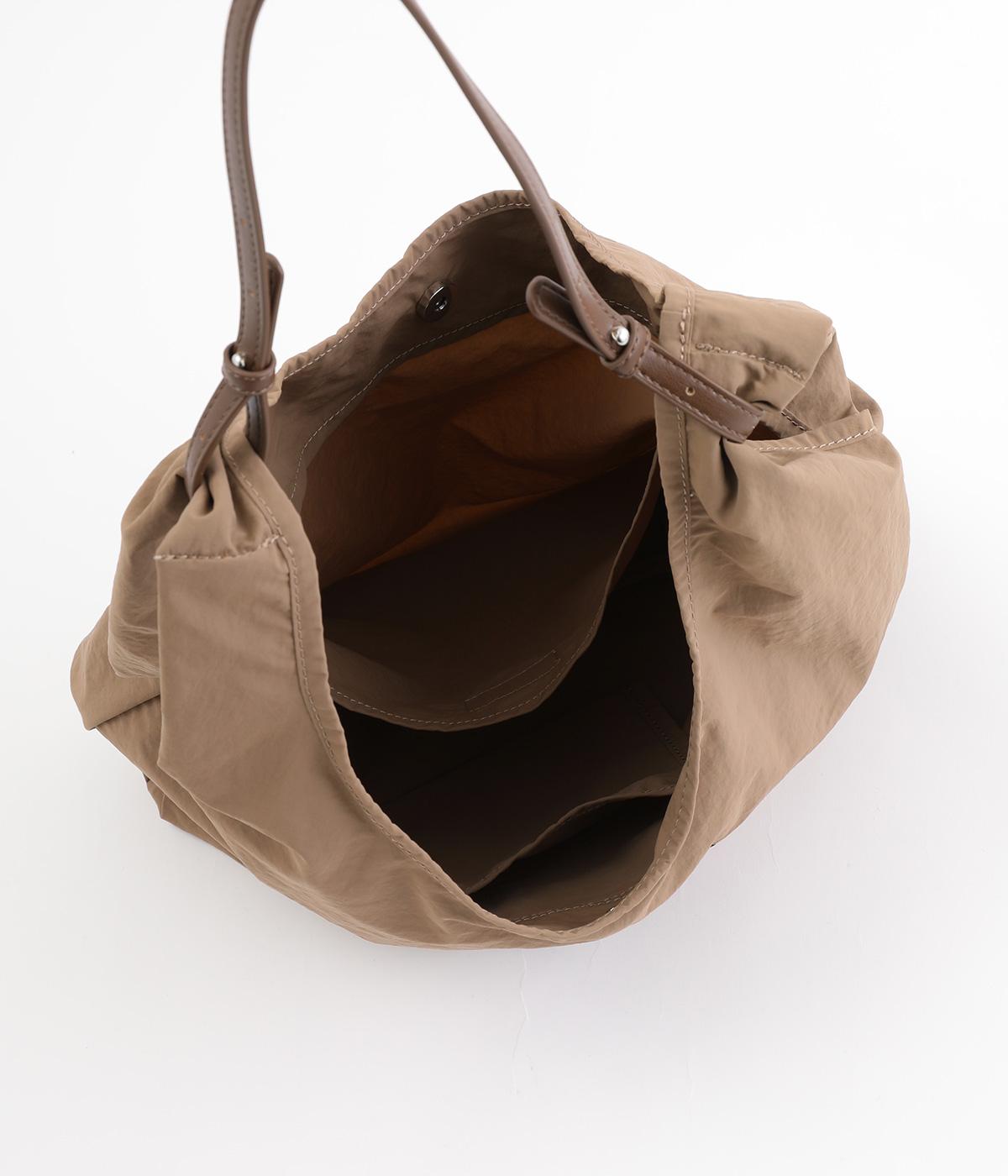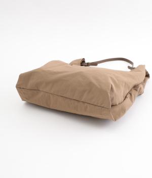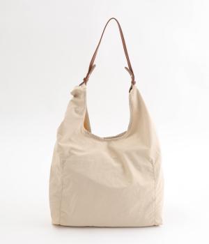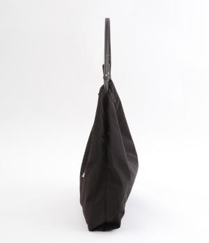 さらりとしていてやや光沢のあるポリエステル生地を使用しています。とても軽く丈夫で、デイリー使いにぴったり。上品なムードを添えるレザー調のハンドルつきです。