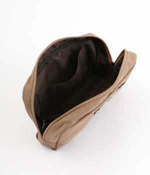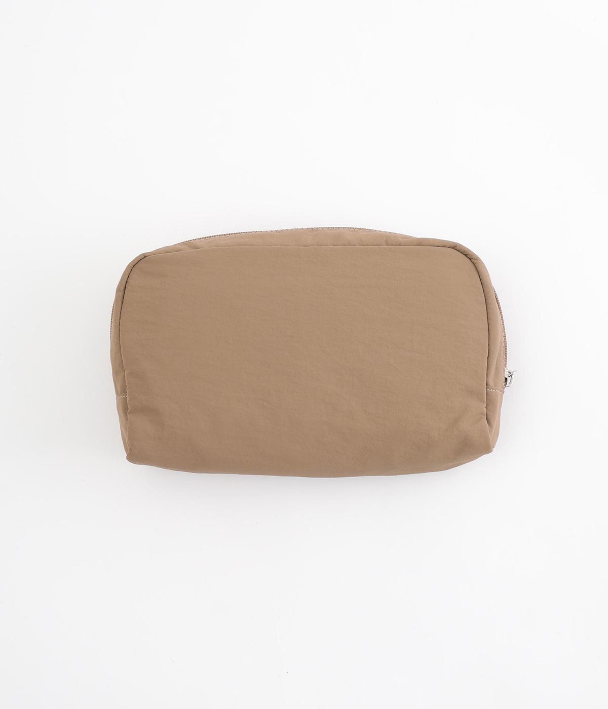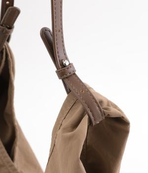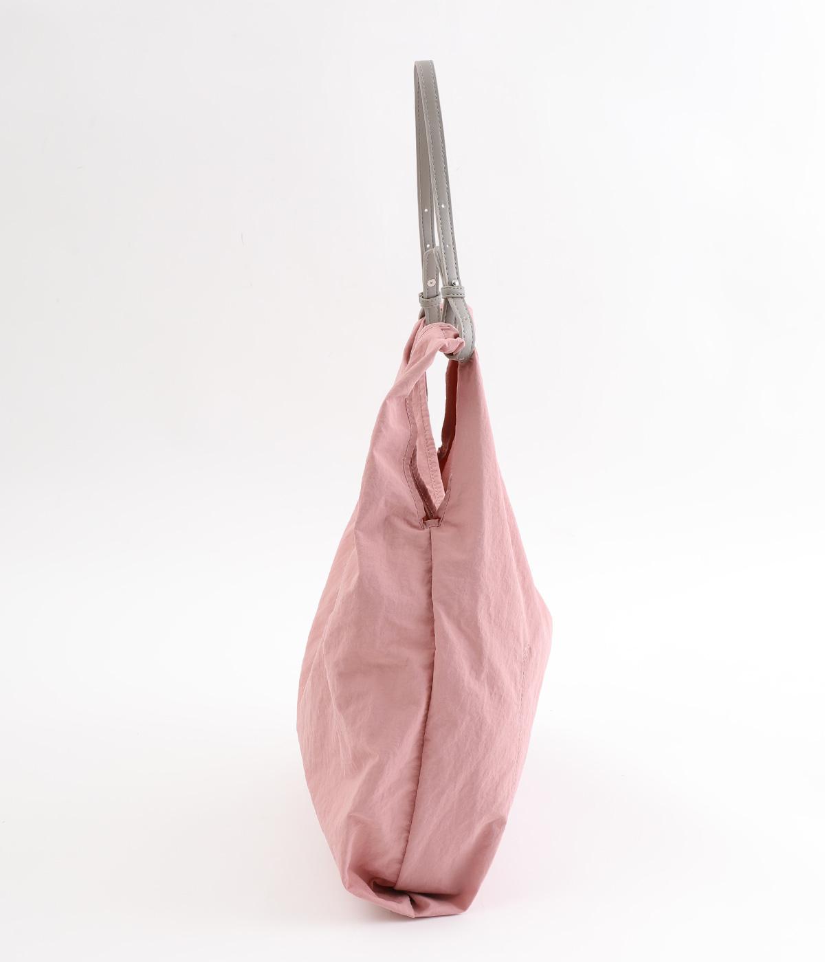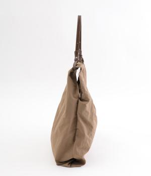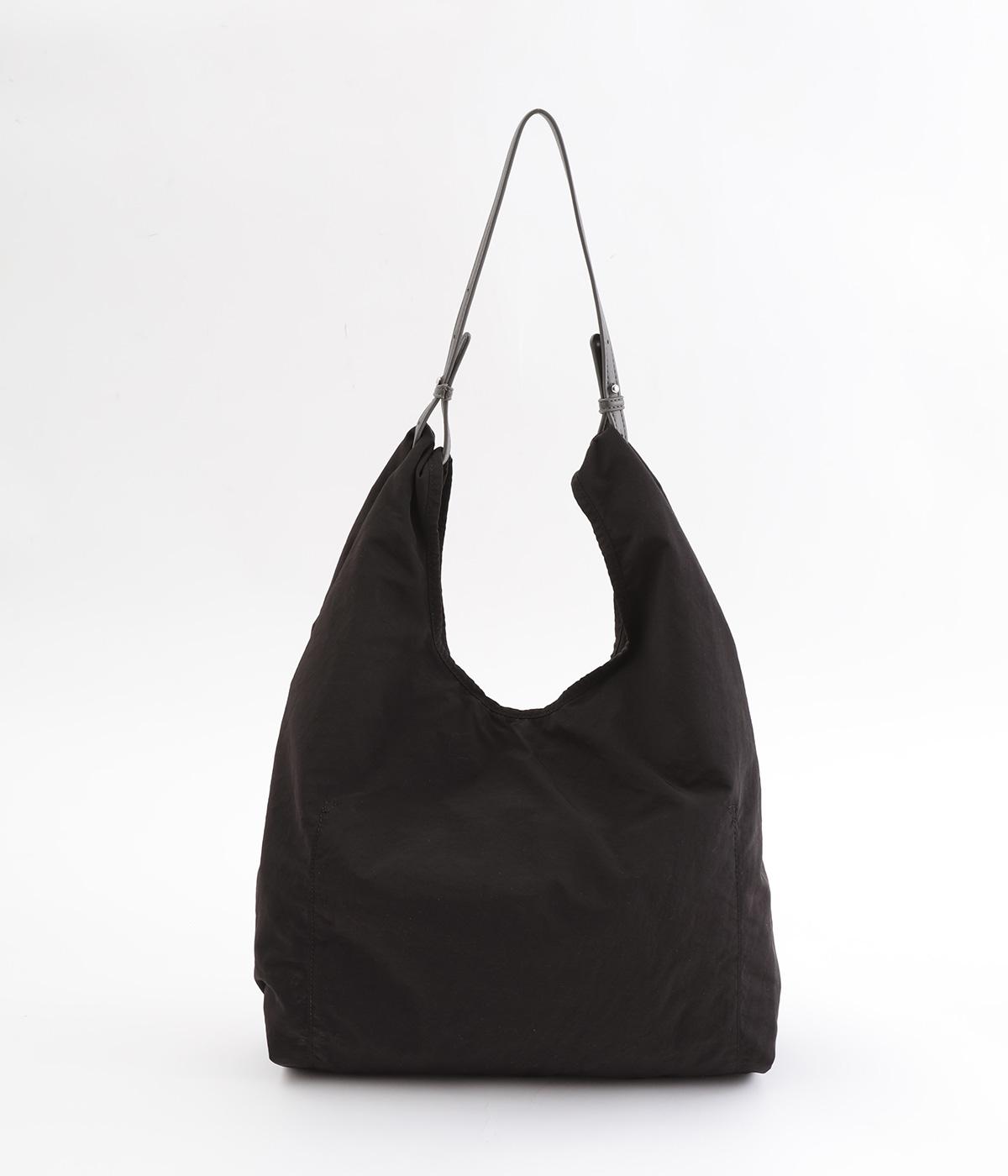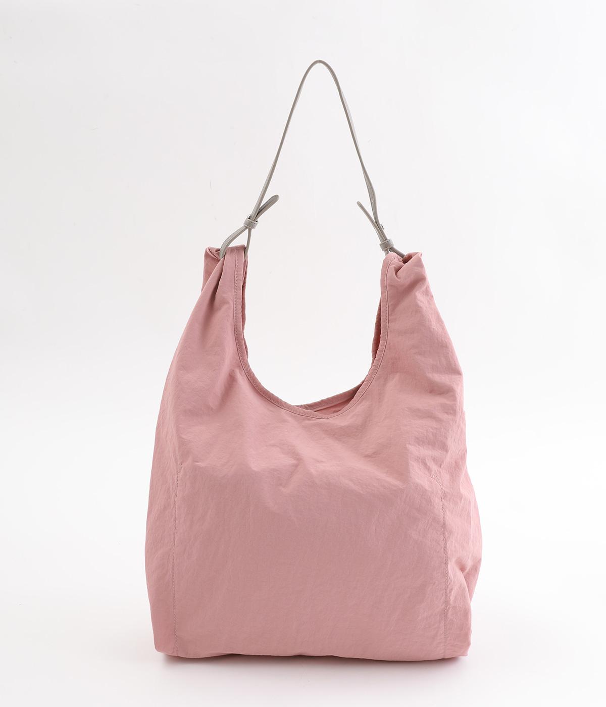 さらりとしていてやや光沢のあるポリエステル生地を使用しています。とても軽く丈夫で、デイリー使いにぴったり。上品なムードを添えるレザー調のハンドルつきです。
