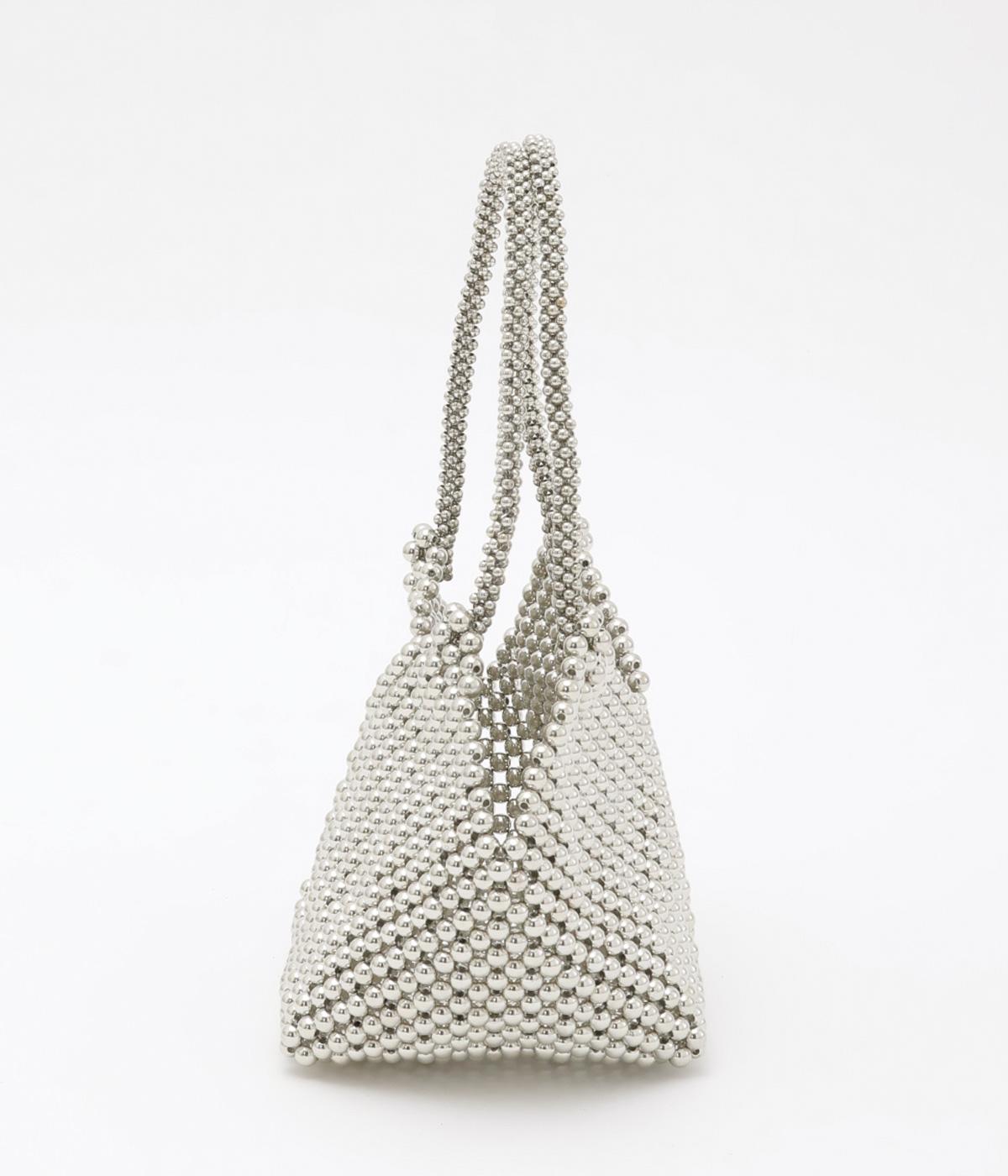 シルバーカラーのメタルビーズと、やわらかい光を放つパールビーズを贅沢にあしらった華やかな素材です。手に取るとほどよい重みがあり、きらきらと光を受けて上品に輝きます。