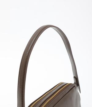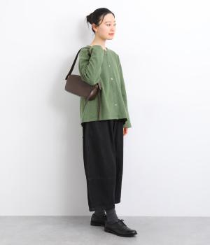 ひかえめな光沢としっとりとした手ざわりが魅力の素材を使用しました。自然なシワがほどよいニュアンスを生み、持つだけで落ち着いた雰囲気に。アンティーク調の金具がアクセントとなり、上品な表情をつくります。