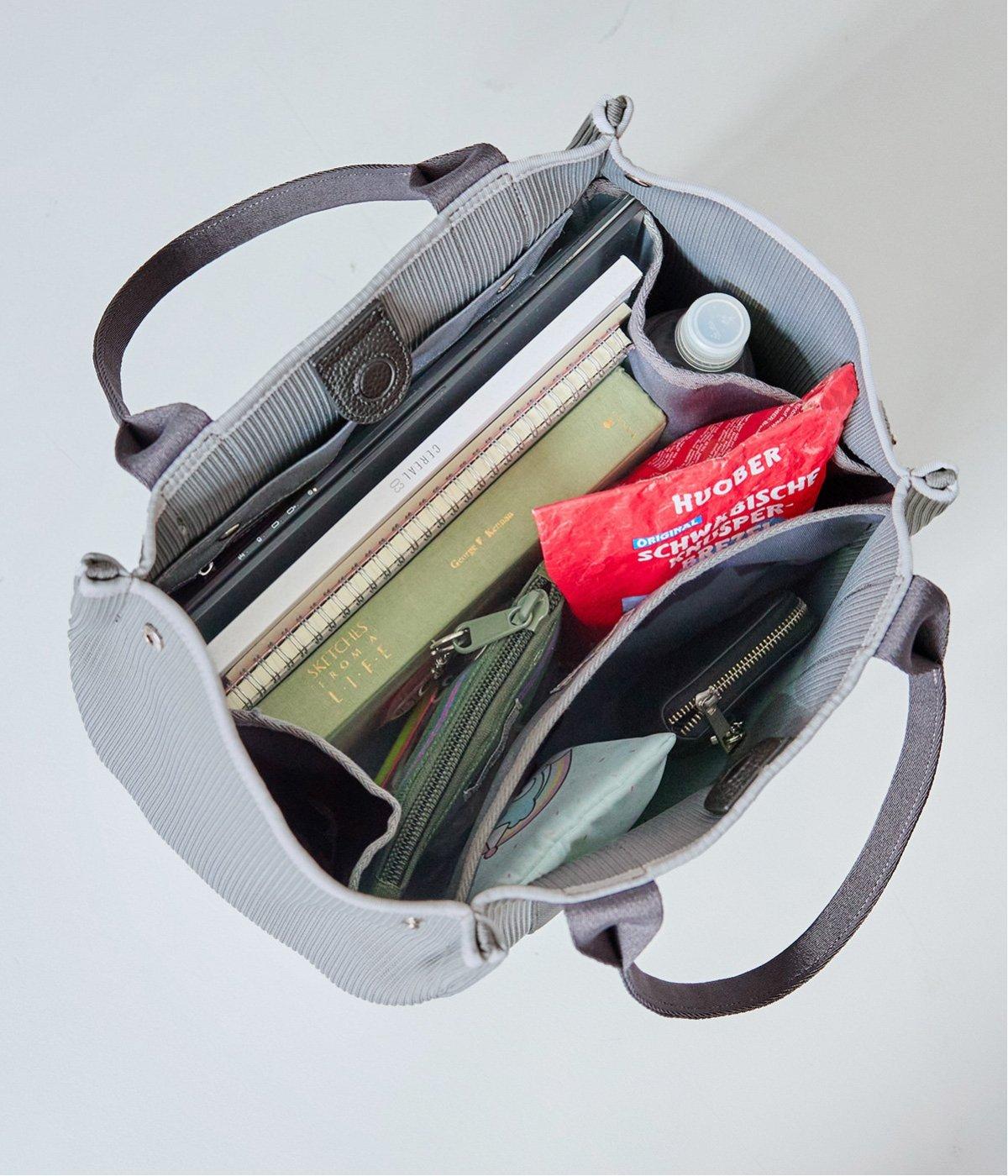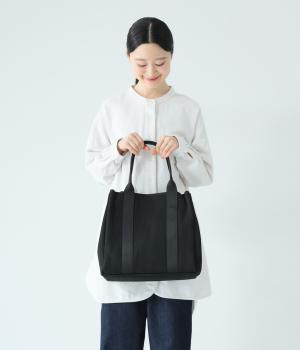 広めのマチでたっぷりの収納力を備え、オンオフ問わず活躍するトートバッグ。両サイド外側のドットボタンで上部のシルエットを調整できます。内側にはボトルや折りたたみ傘を固定可能なホルダーつき。ファスナーポケットも配しており使い勝手抜群です。