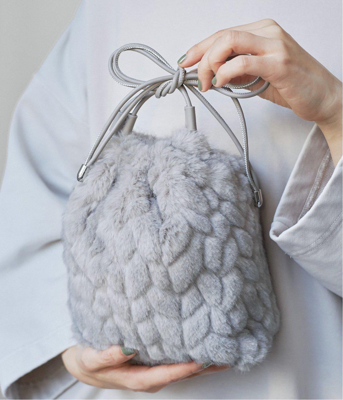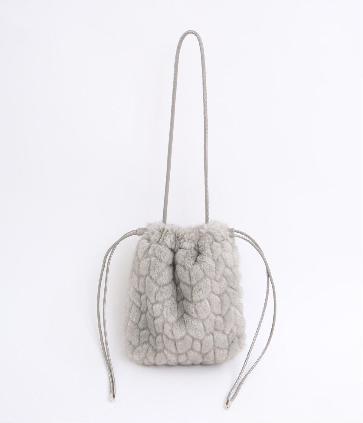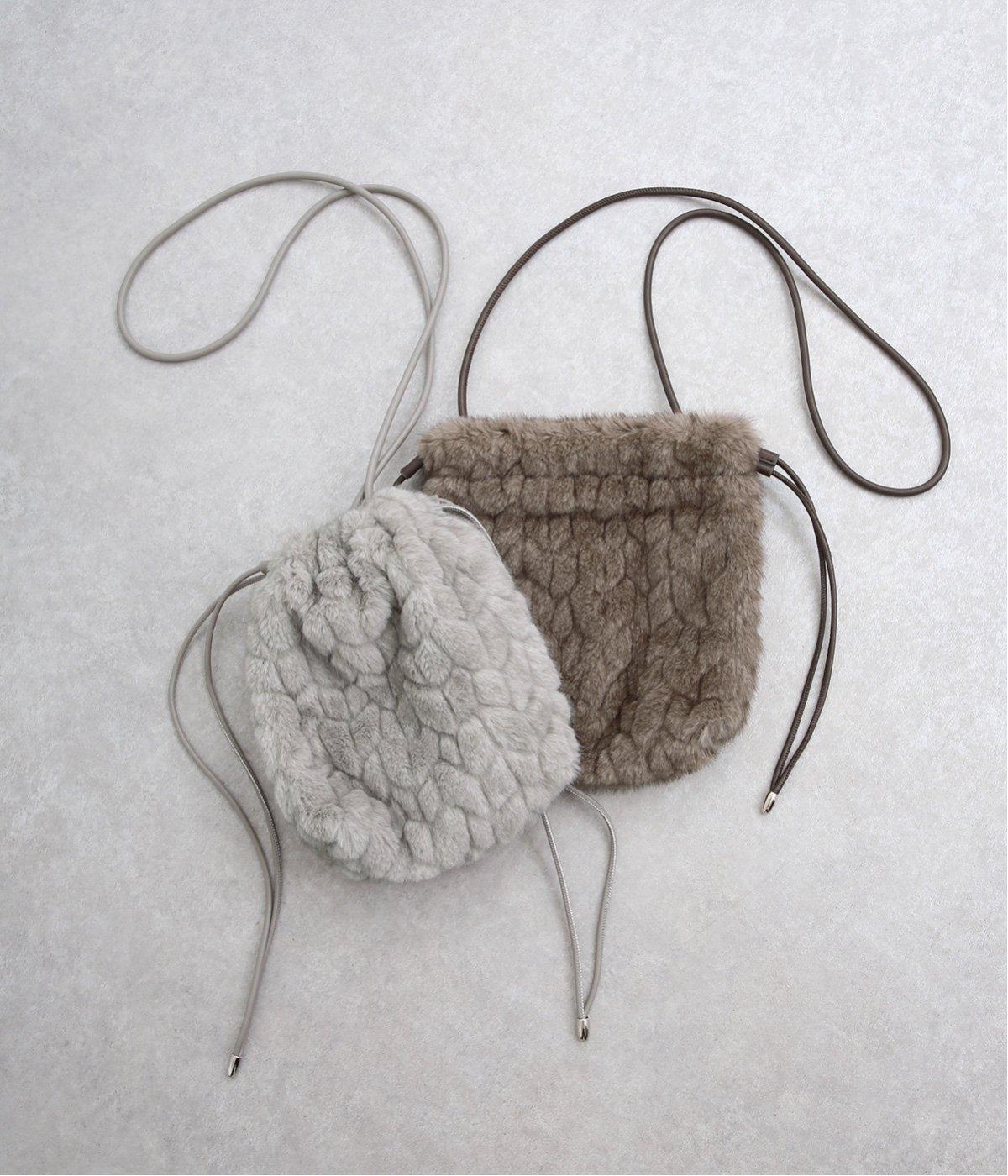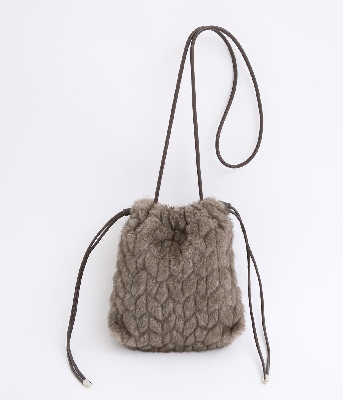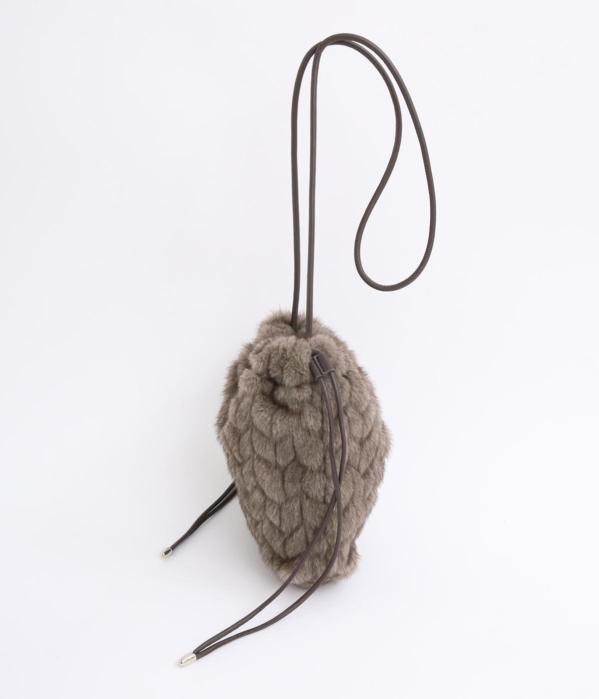 形はシンプルながらファーにカット加工を入れて、ヘリンボーン風の柄を表現し、高級感のある仕上がりです。ショルダーの長さは内側の結び目部分で微調整ができます。巾着タイプでころんとしたフォルムも◎。ショルダーも丸コードも品のいい印象です。