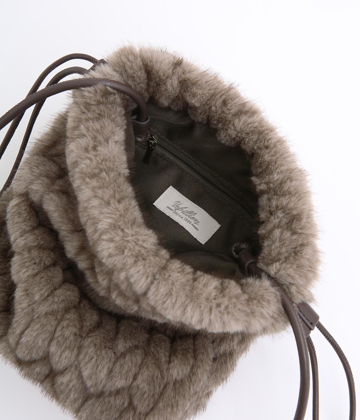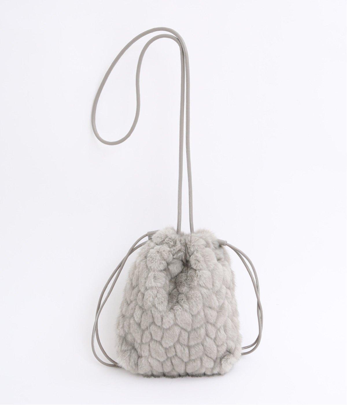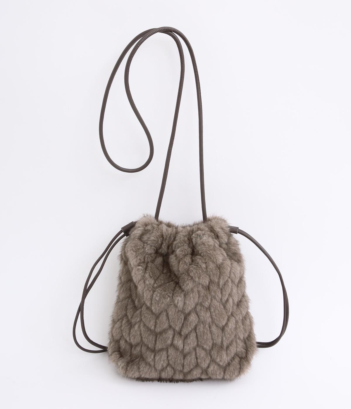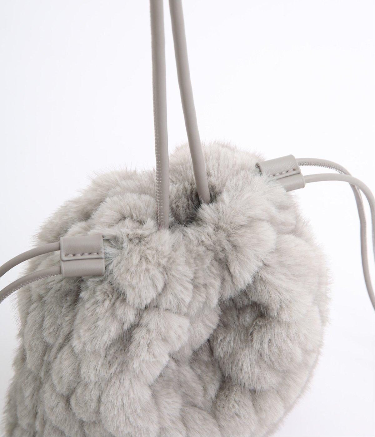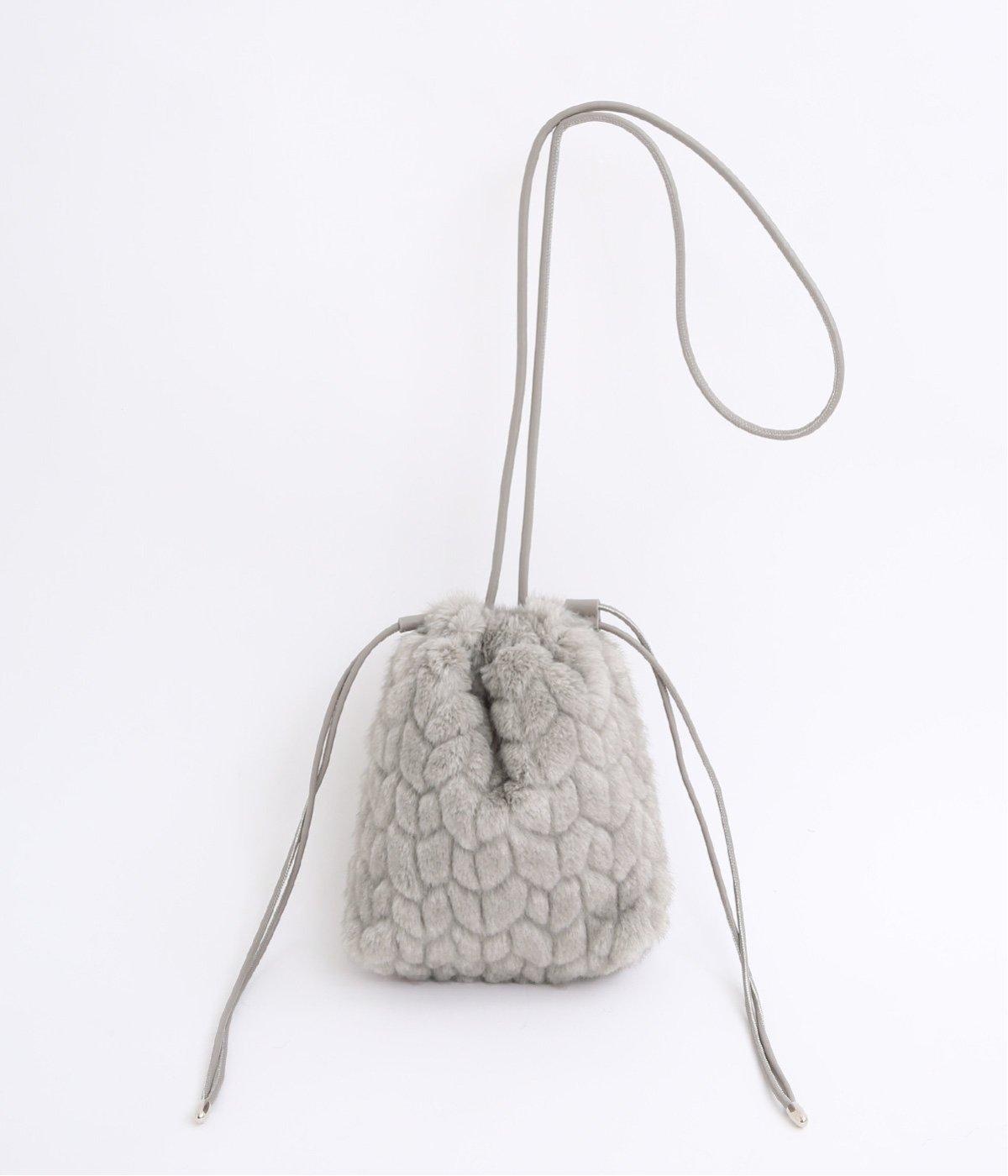 形はシンプルながらファーにカット加工を入れて、ヘリンボーン風の柄を表現し、高級感のある仕上がりです。ショルダーの長さは内側の結び目部分で微調整ができます。巾着タイプでころんとしたフォルムも◎。ショルダーも丸コードも品のいい印象です。