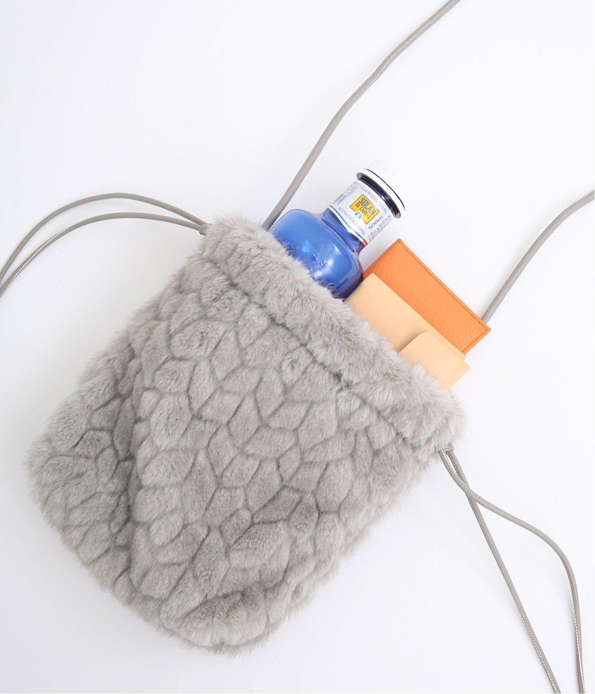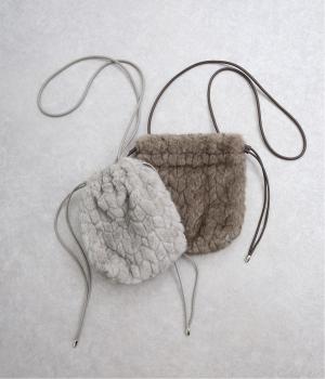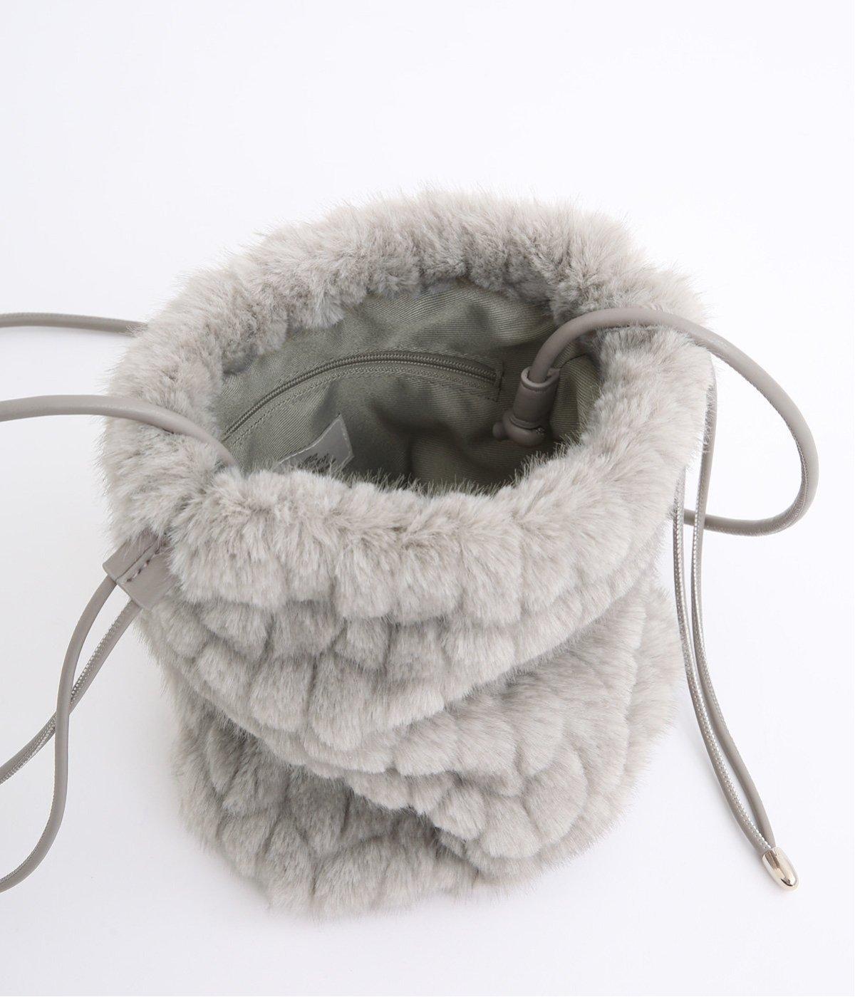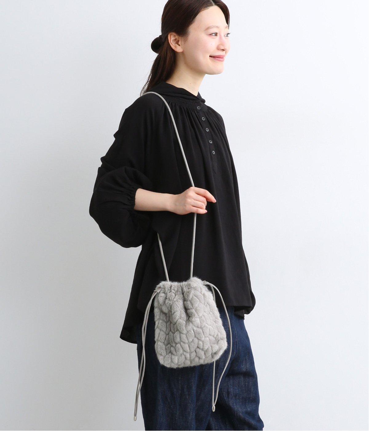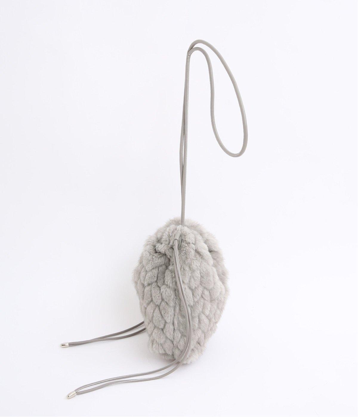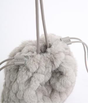 形はシンプルながらファーにカット加工を入れて、ヘリンボーン風の柄を表現し、高級感のある仕上がりです。ショルダーの長さは内側の結び目部分で微調整ができます。巾着タイプでころんとしたフォルムも◎。ショルダーも丸コードも品のいい印象です。