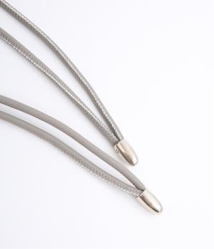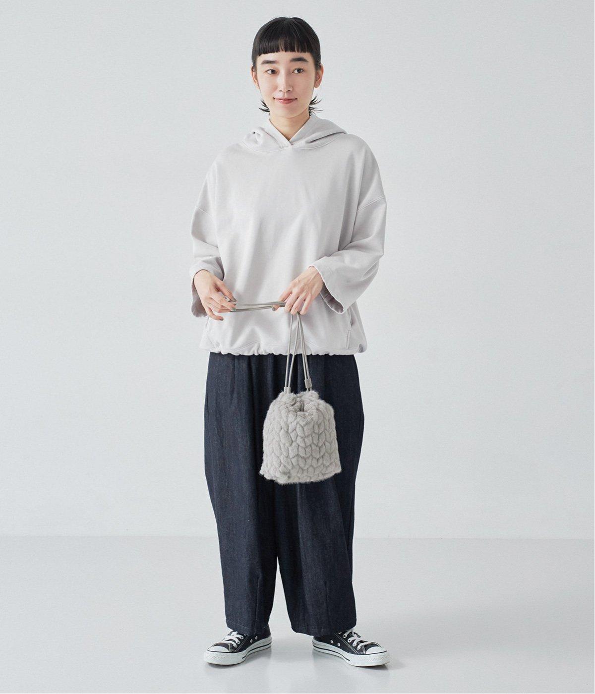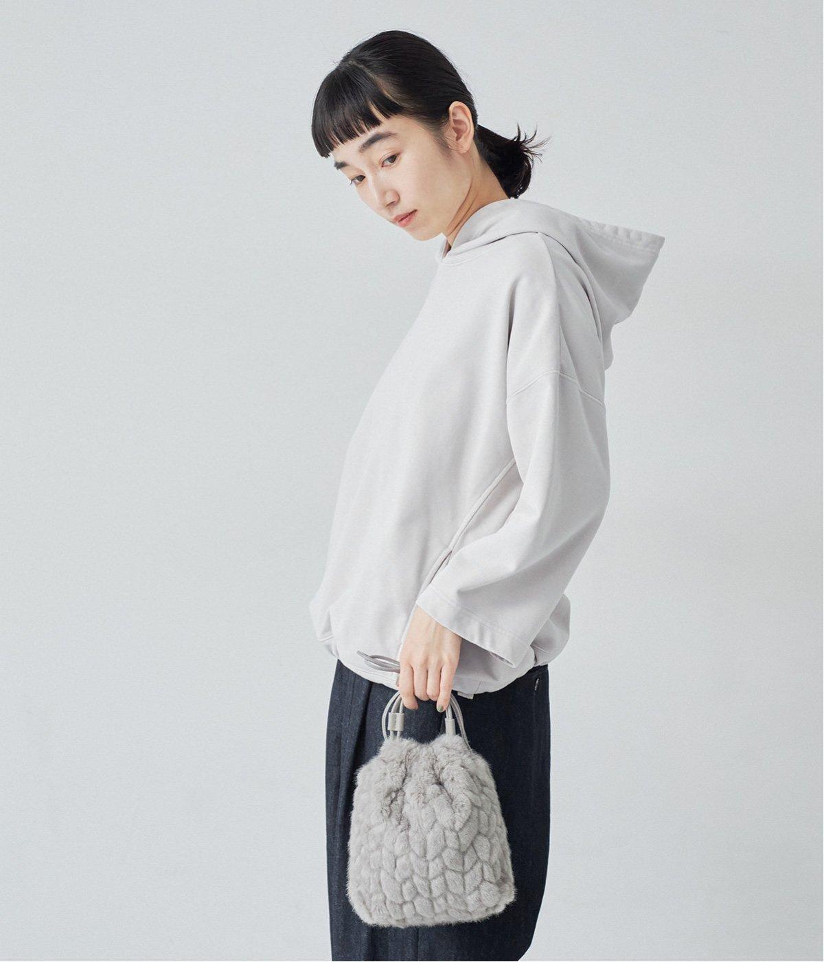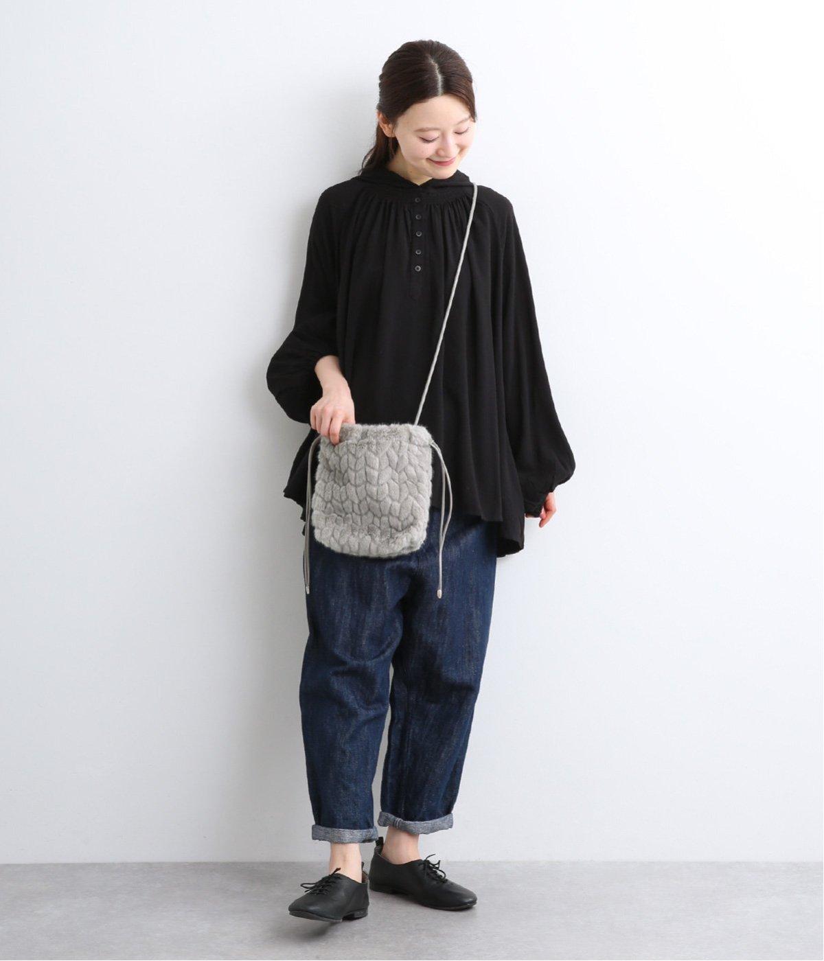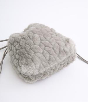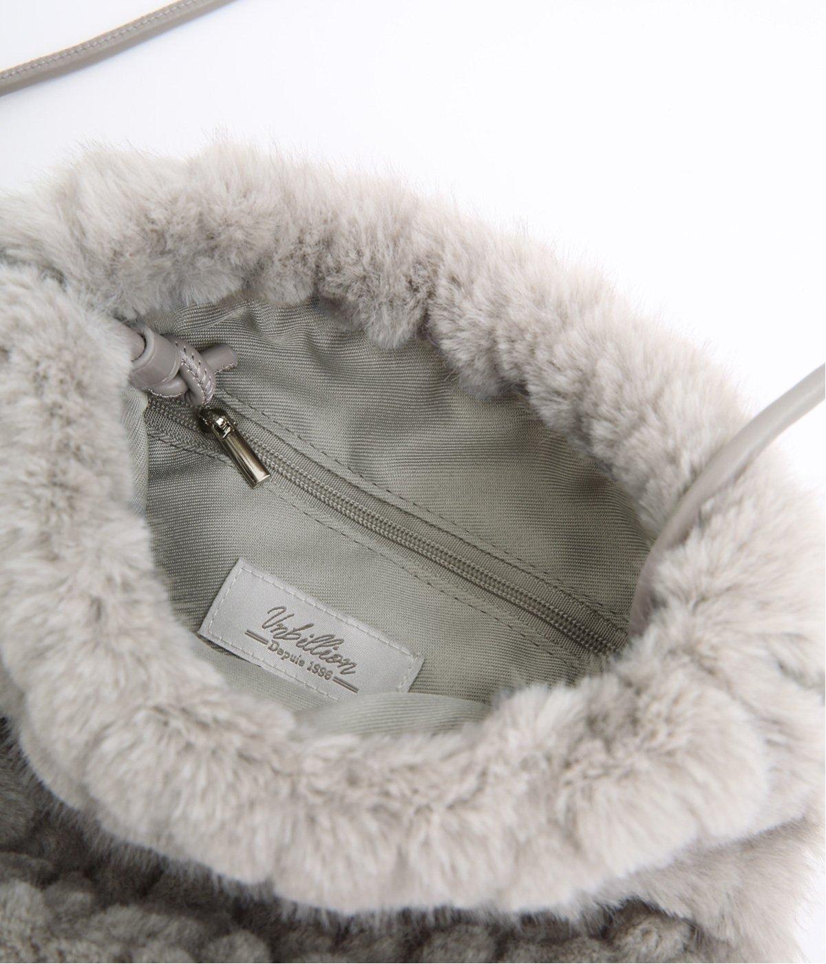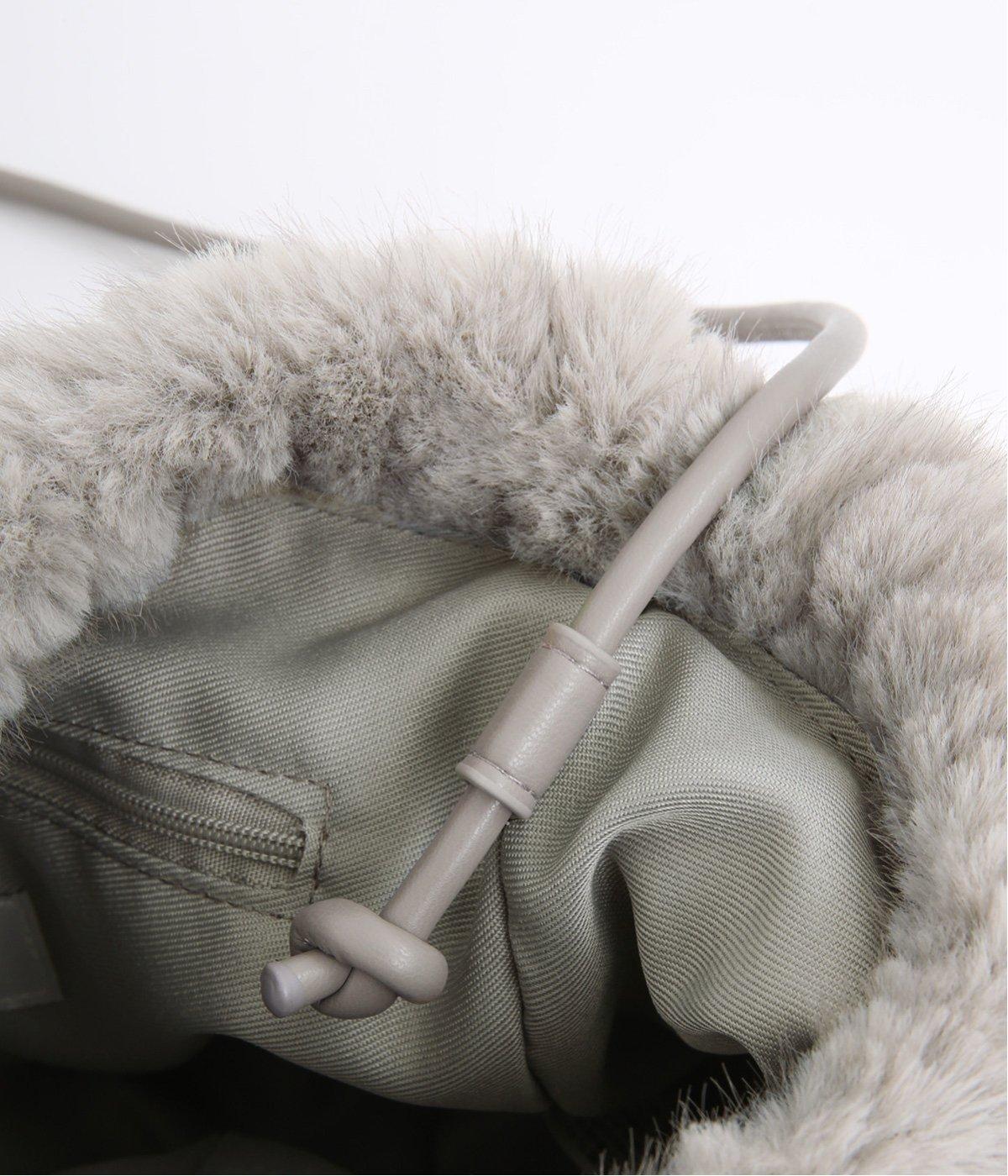 形はシンプルながらファーにカット加工を入れて、ヘリンボーン風の柄を表現し、高級感のある仕上がりです。ショルダーの長さは内側の結び目部分で微調整ができます。巾着タイプでころんとしたフォルムも◎。ショルダーも丸コードも品のいい印象です。