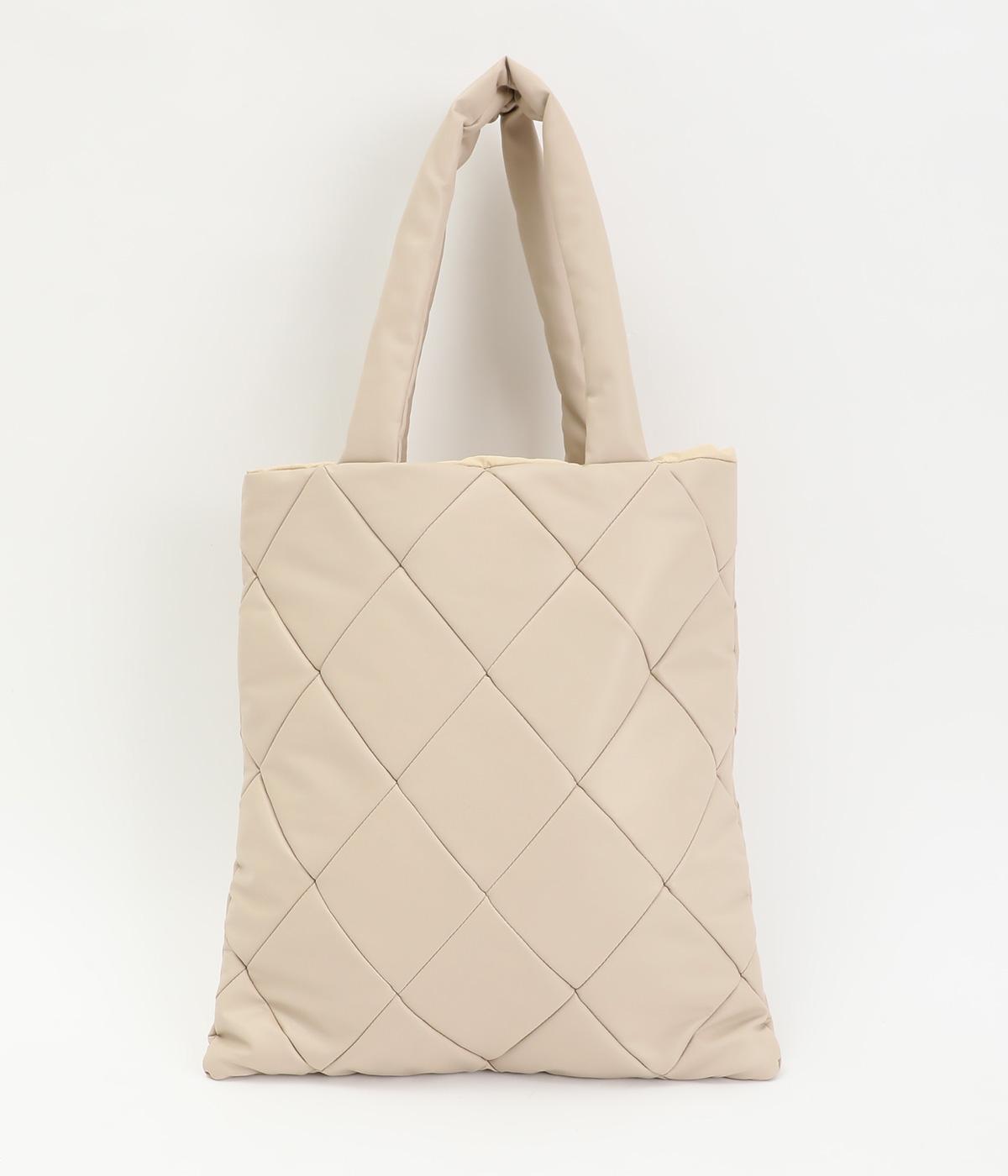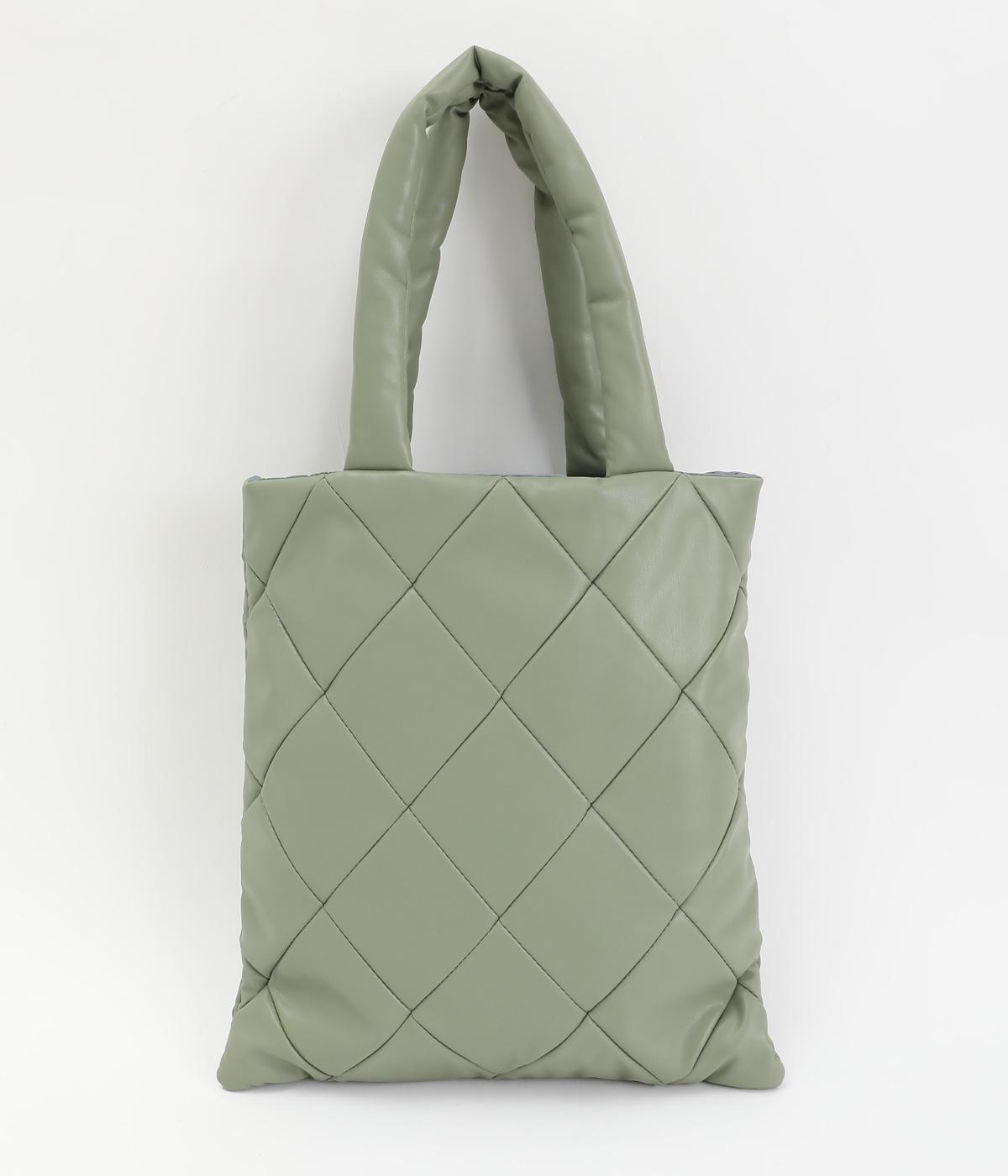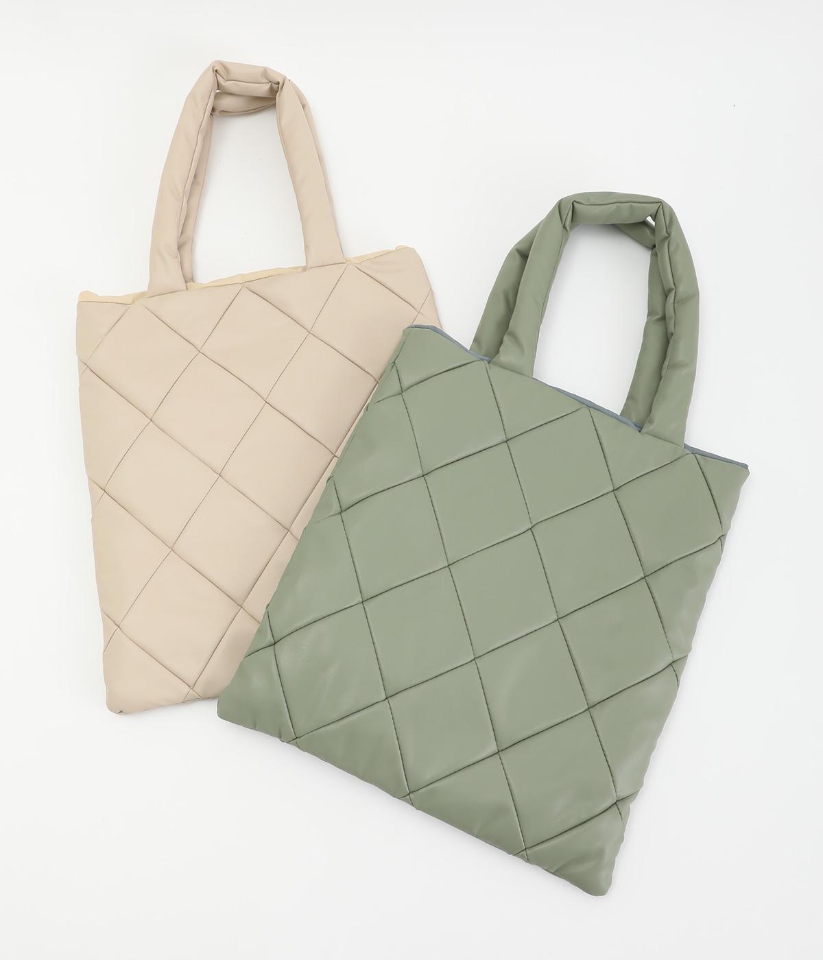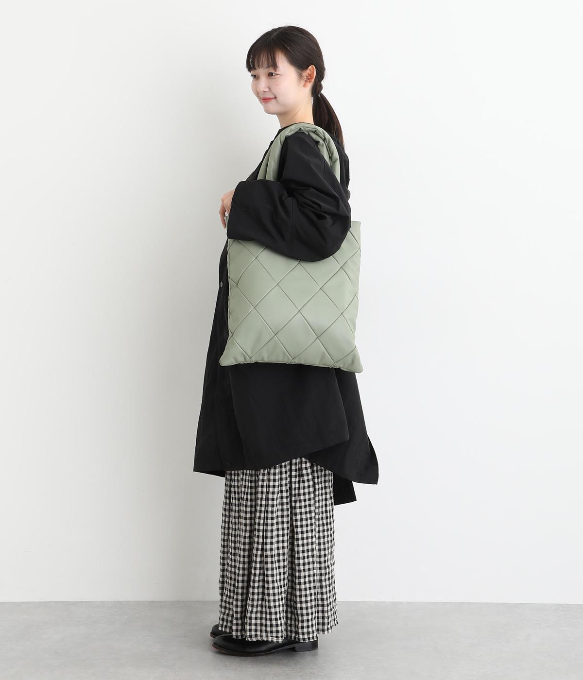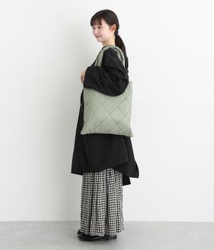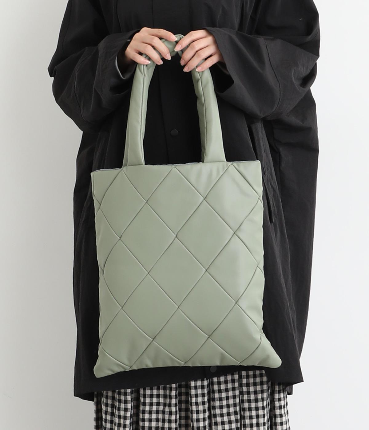 合皮とナイロンのリバーシブルトートバッグ。合皮面はパテッドされたキルティング加工、ナイロン面はシンプルで大きいポケットがポイントです。