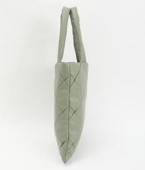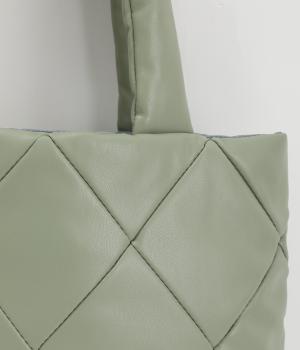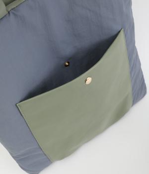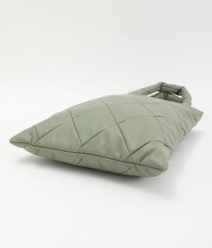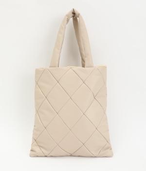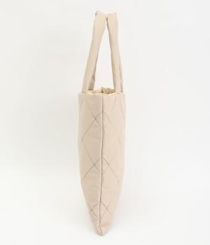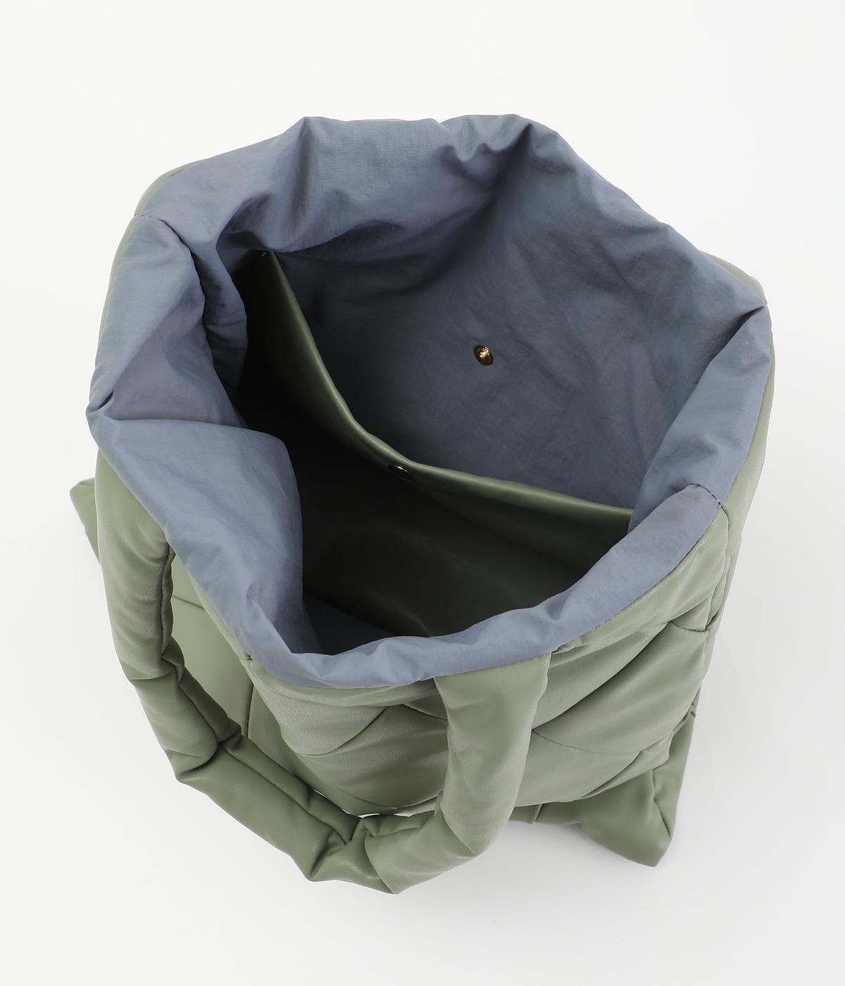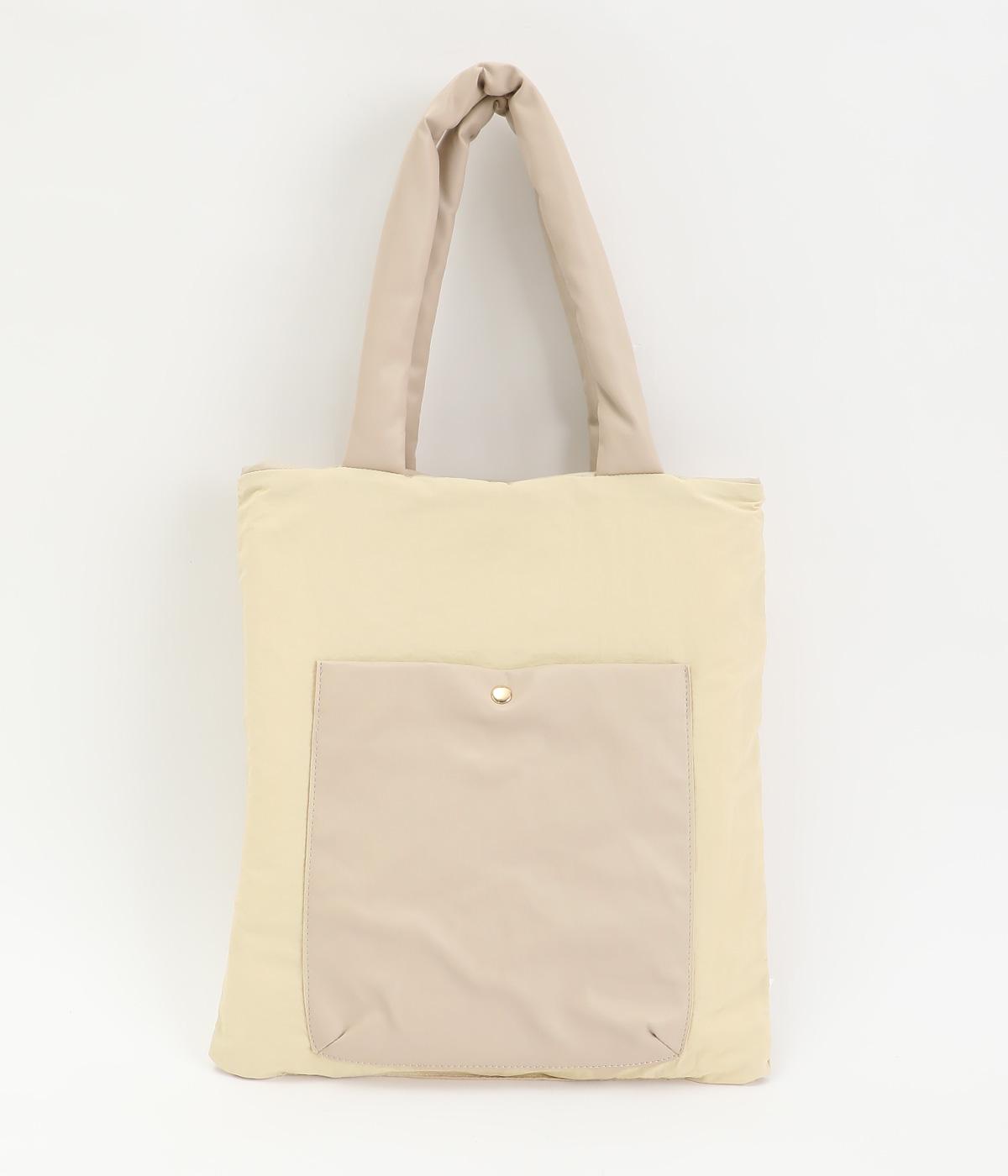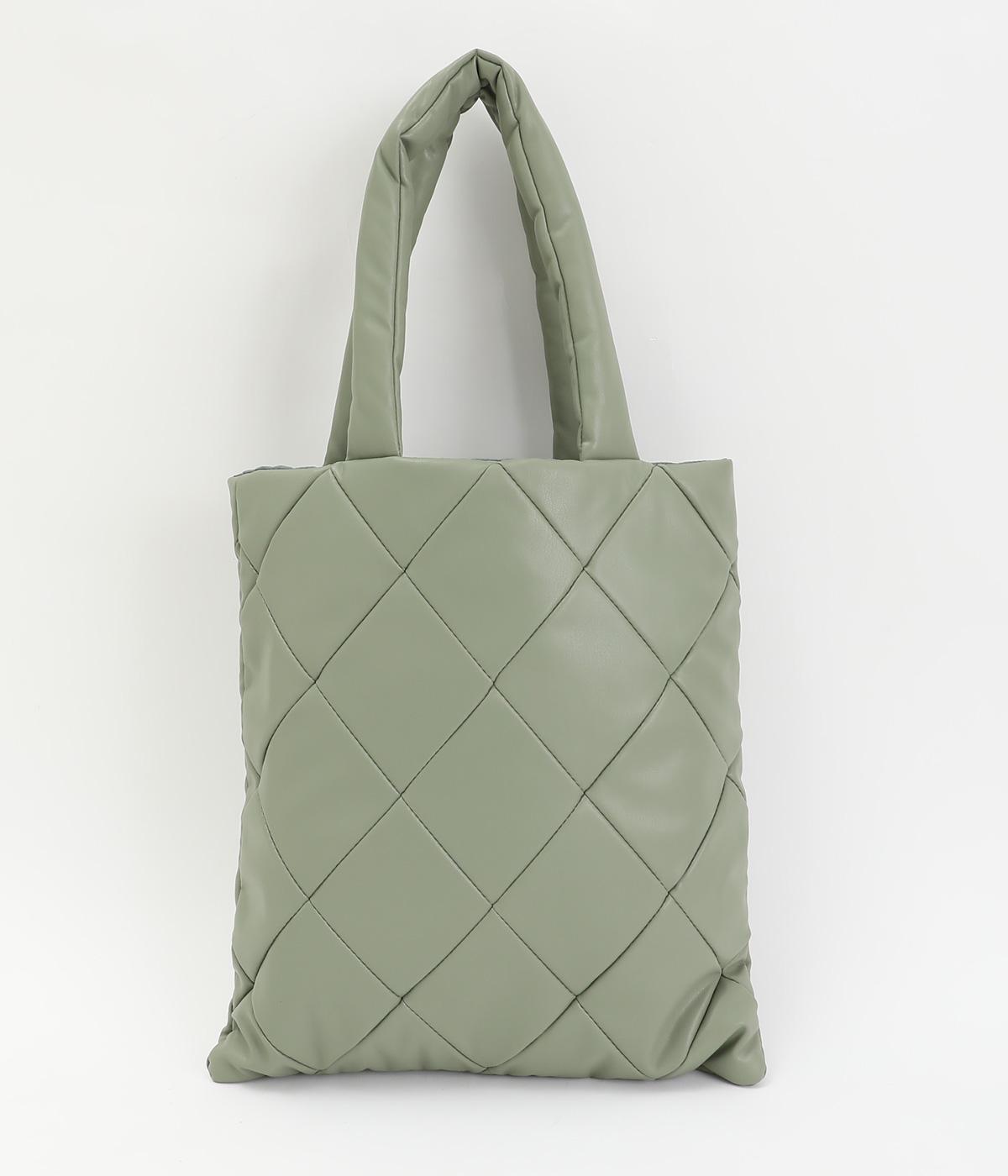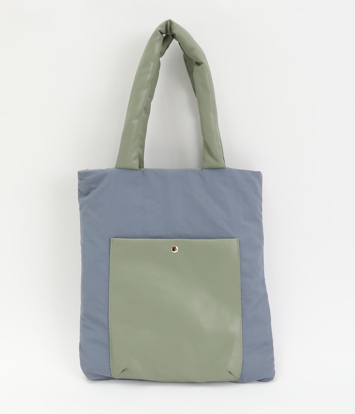 合皮とナイロンのリバーシブルトートバッグ。合皮面はパテッドされたキルティング加工、ナイロン面はシンプルで大きいポケットがポイントです。