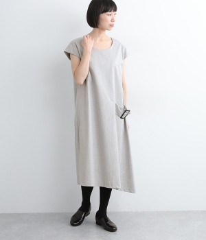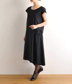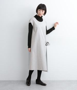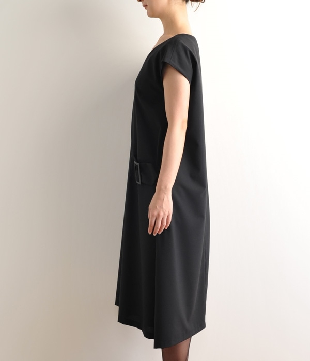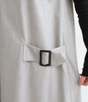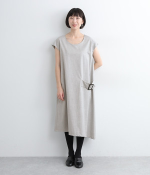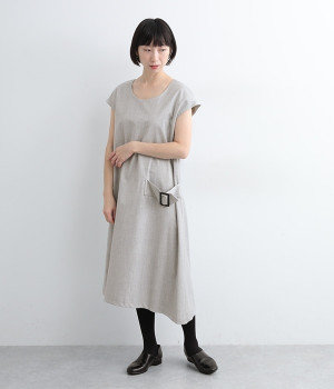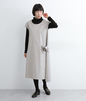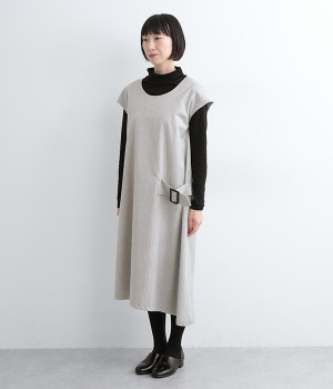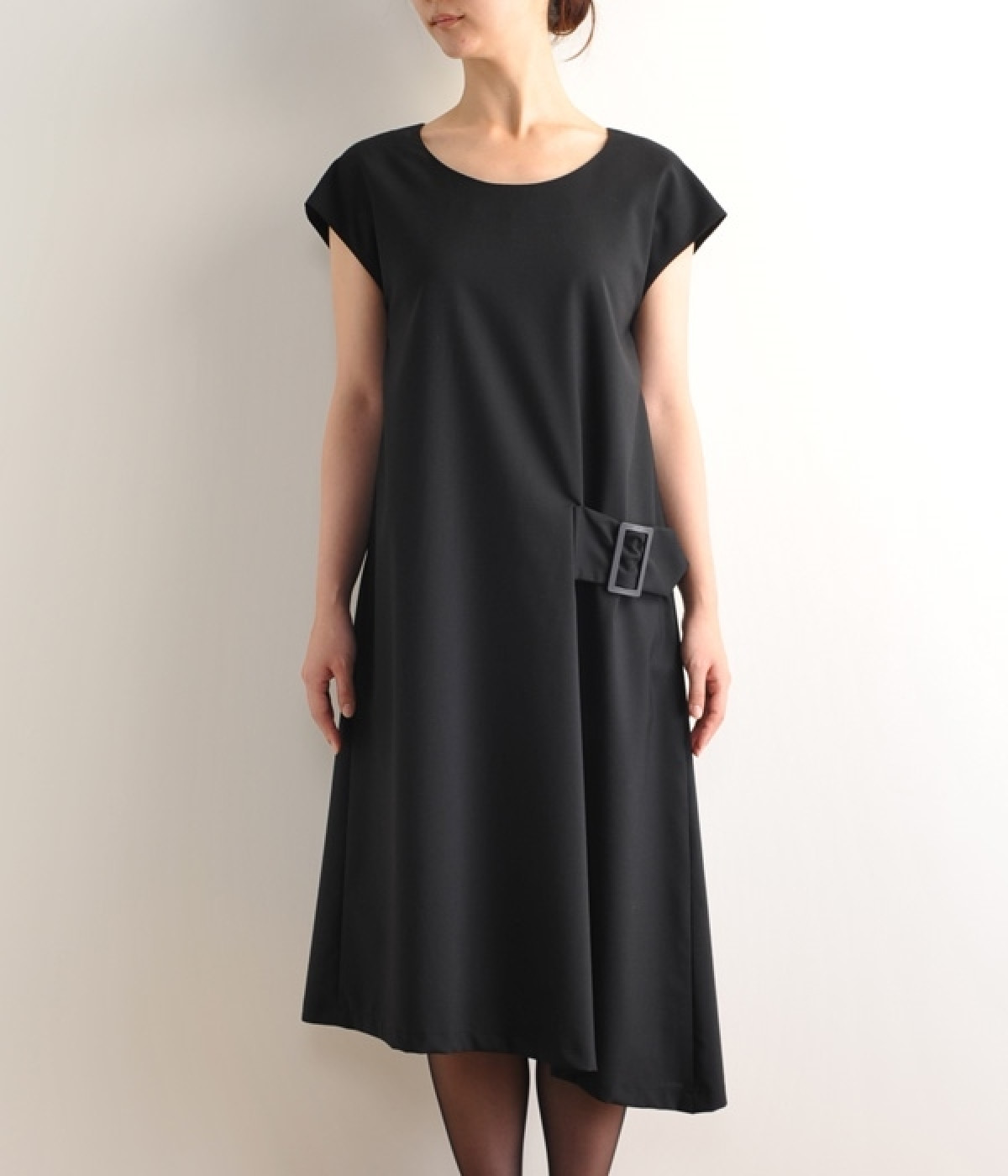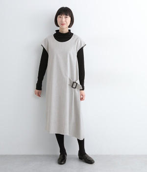 左サイドにあしらった大きなバックルデザインが上品なアクセントになる、ナチュラン別注のワンピースです。さらっとしたキレイめな素材感で、デイリー使いからオケージョンまで幅広く対応できます。斜めになったアシンメトリーの裾がニュアンスのあるシルエットを作り出します。
