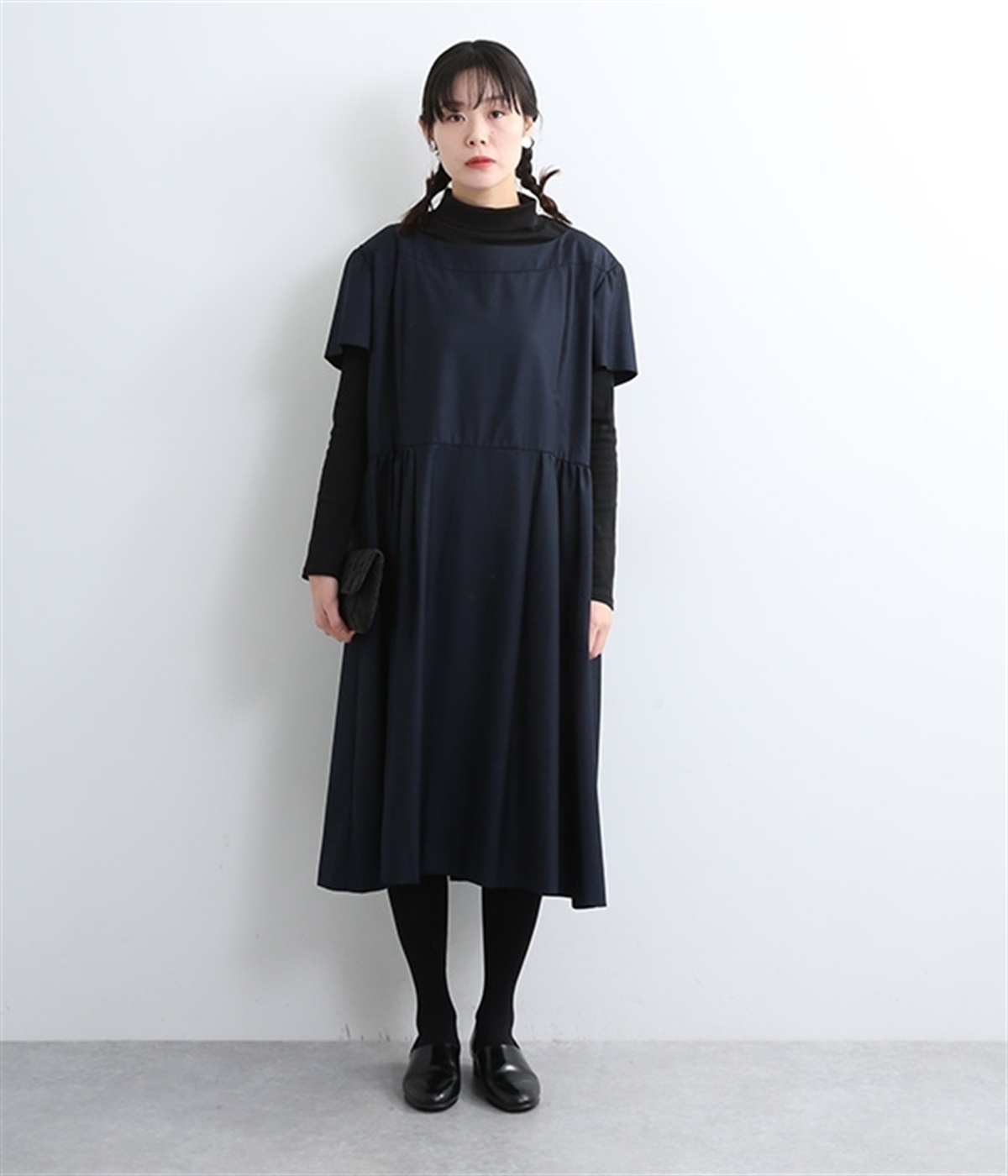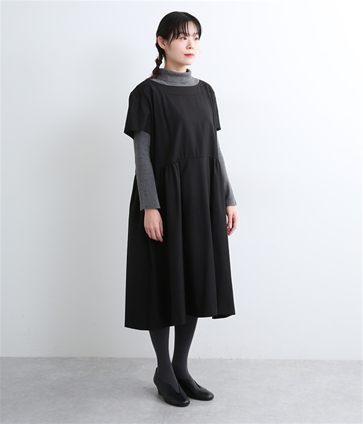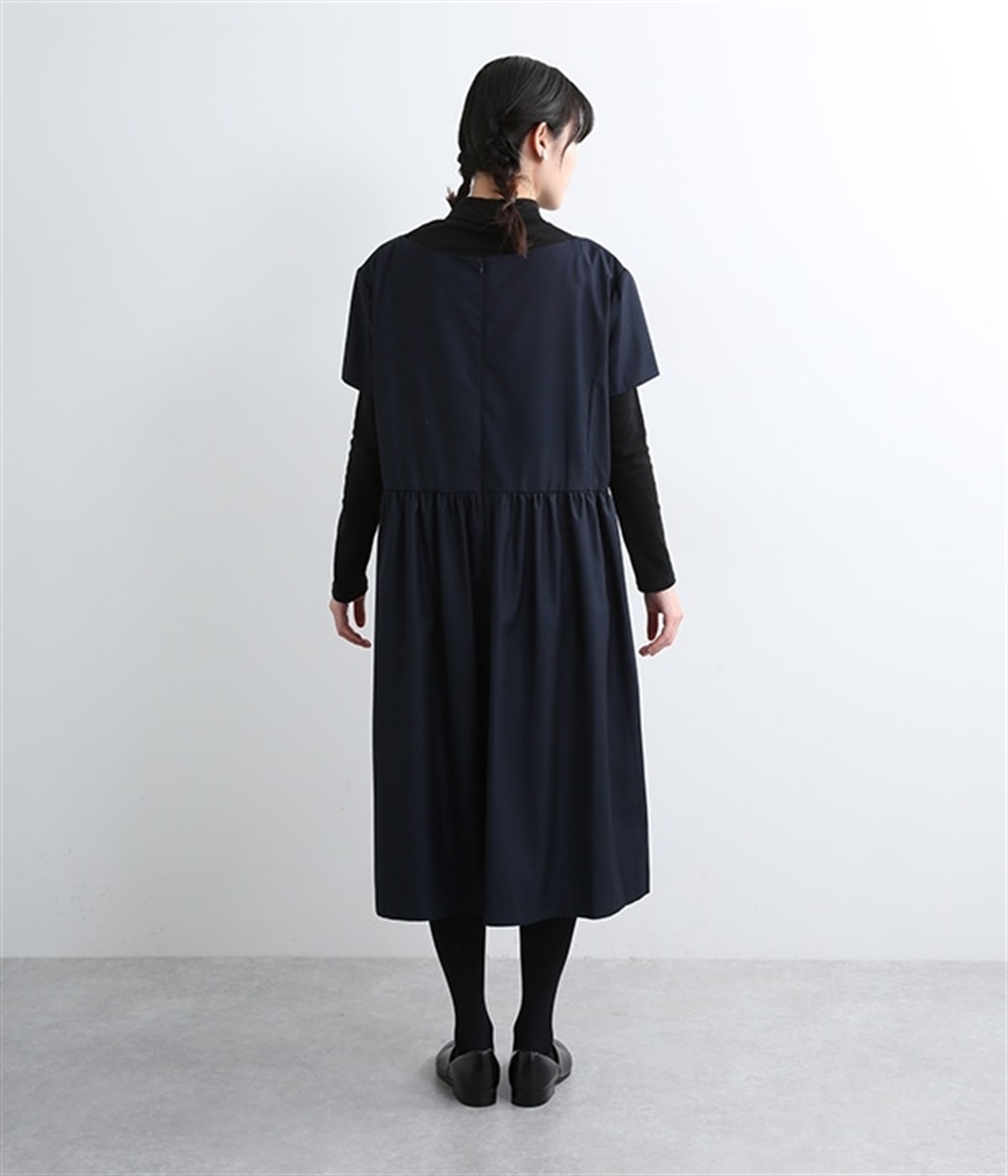 ヨークの切替が上品さを引き立てるワンピース。高めの位置のウエスト切替えからはほどよくギャザーが入り、広がりすぎない美しいラインを表現しています。後ろネックはジップ仕様で、着脱のしやすさも◎。二の腕をカバーする、計算されたサイジングが魅力の一枚。シンプルで洗練されたデザインで、パールやヒールなどの小物使いが生えるアイテムです。