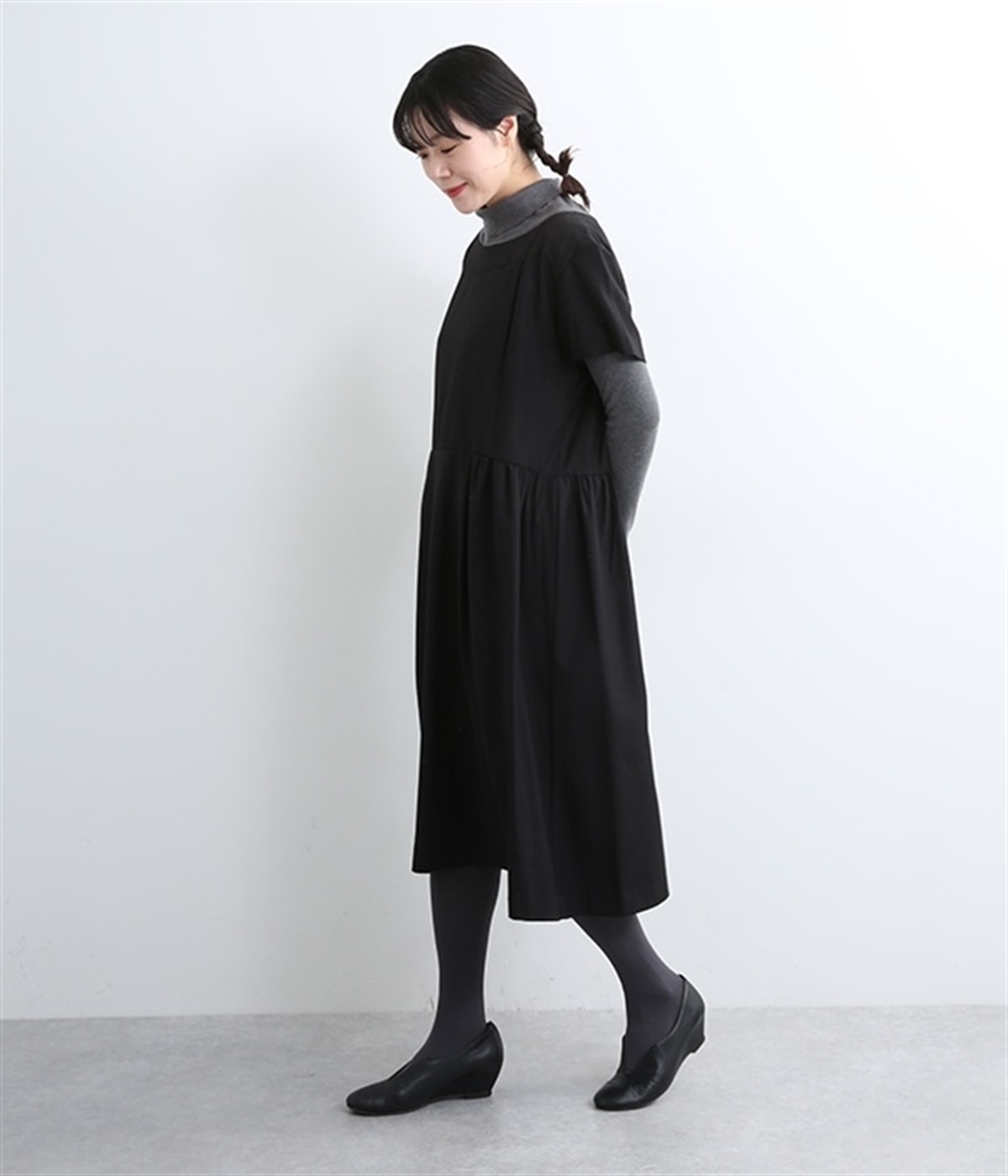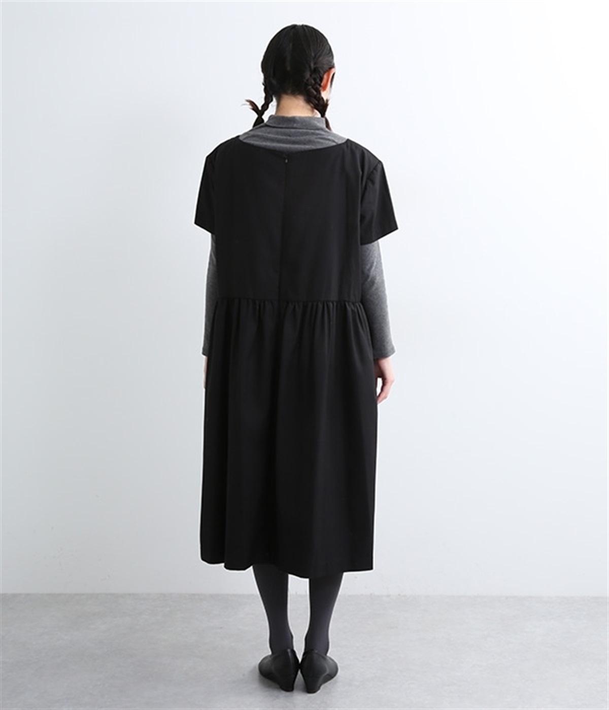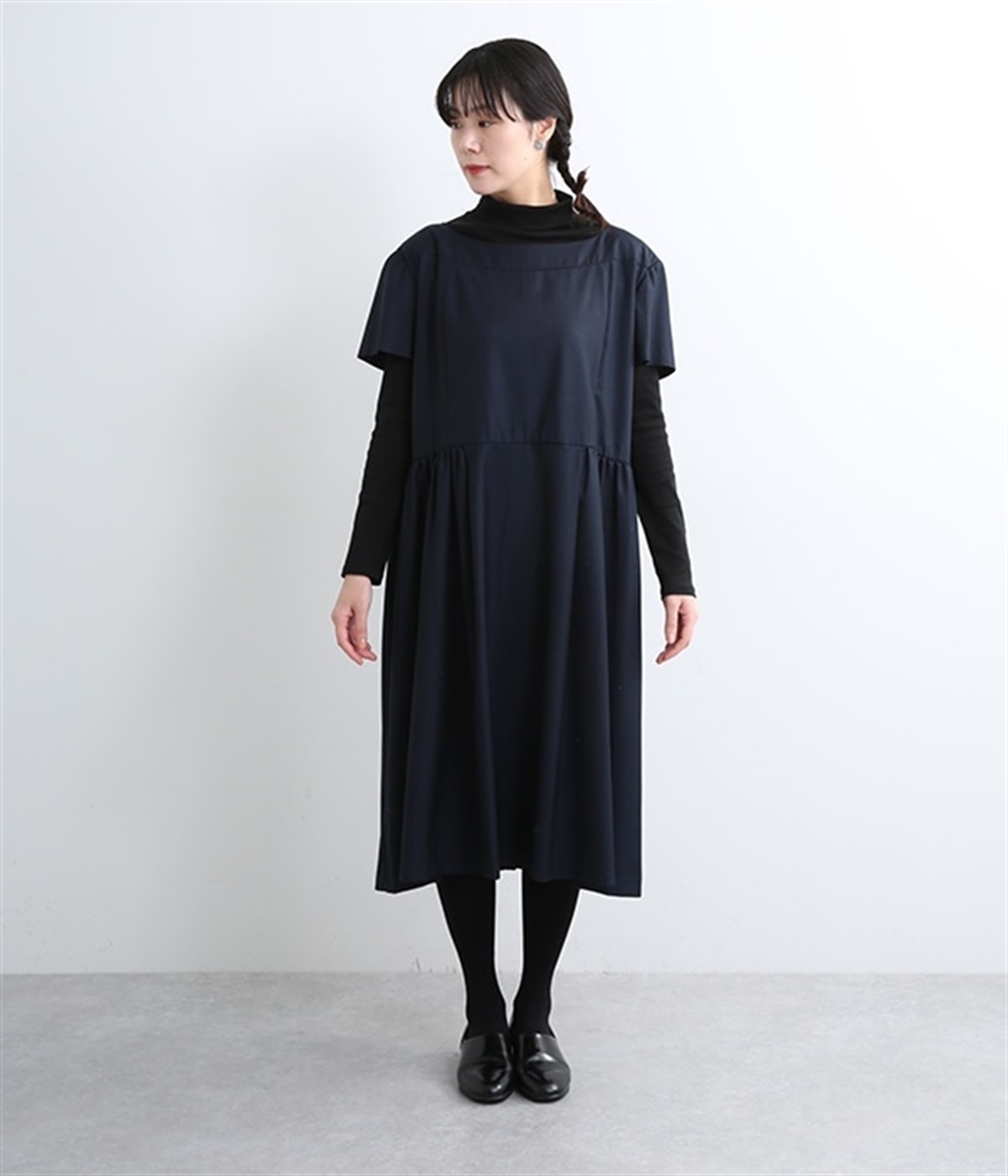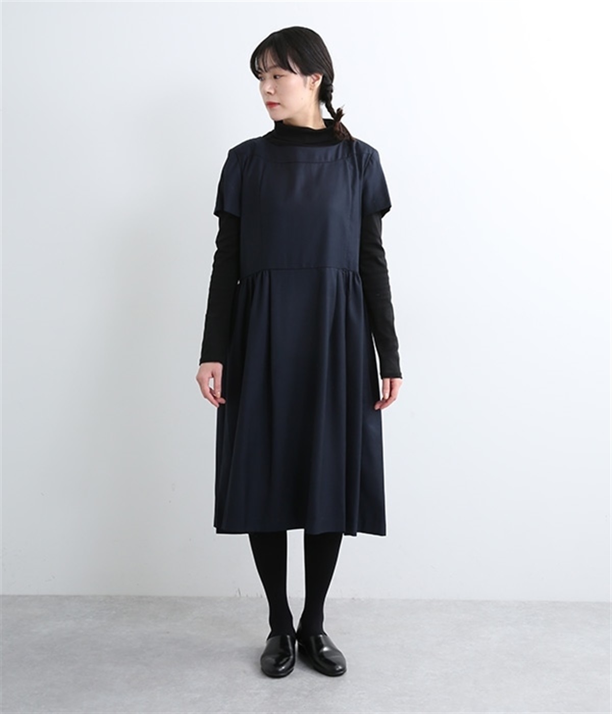 ヨークの切替が上品さを引き立てるワンピース。高めの位置のウエスト切替えからはほどよくギャザーが入り、広がりすぎない美しいラインを表現しています。後ろネックはジップ仕様で、着脱のしやすさも◎。二の腕をカバーする、計算されたサイジングが魅力の一枚。シンプルで洗練されたデザインで、パールやヒールなどの小物使いが生えるアイテムです。