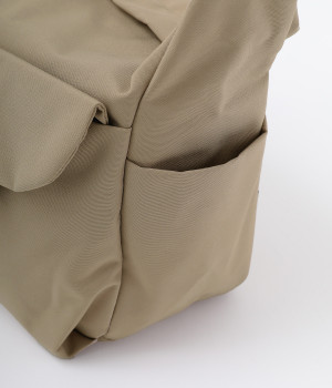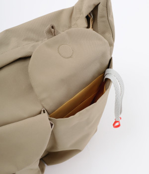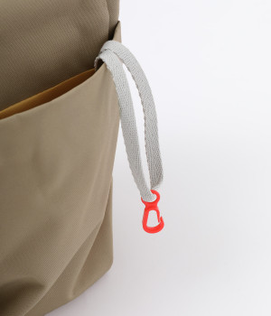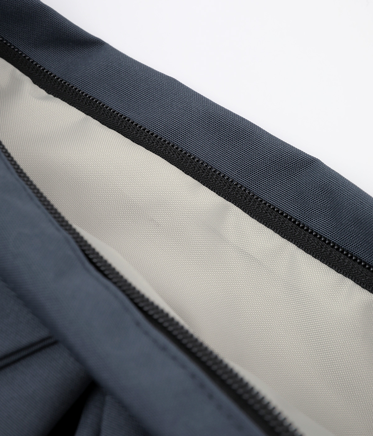 環境に配慮したリサイクルポリエステルを使用しています。タフな生地感にセミマットな表情でアクティブシーンに活躍します。軽量も高ポイントです。