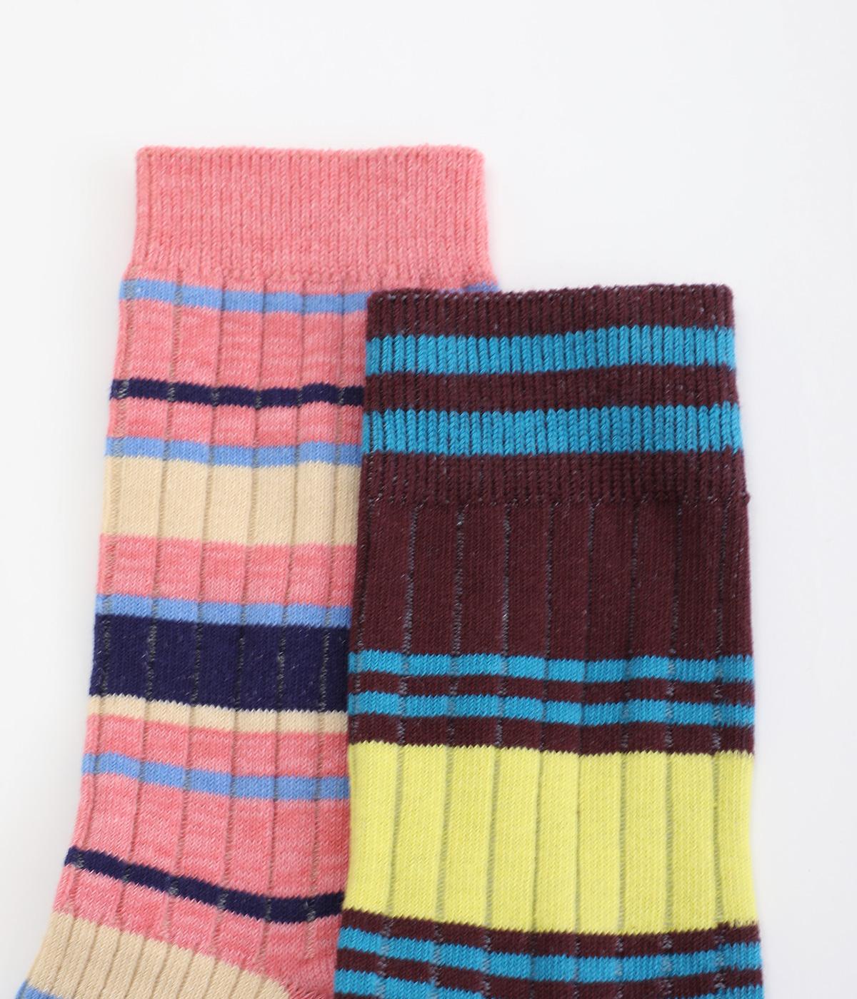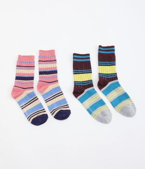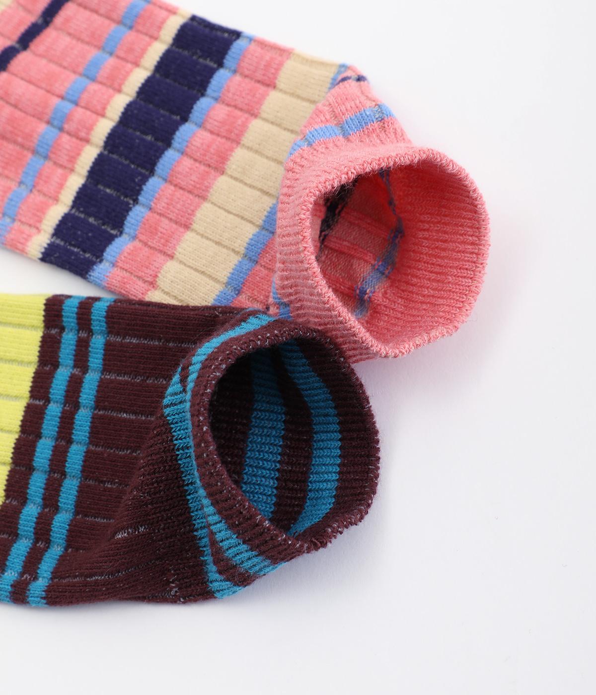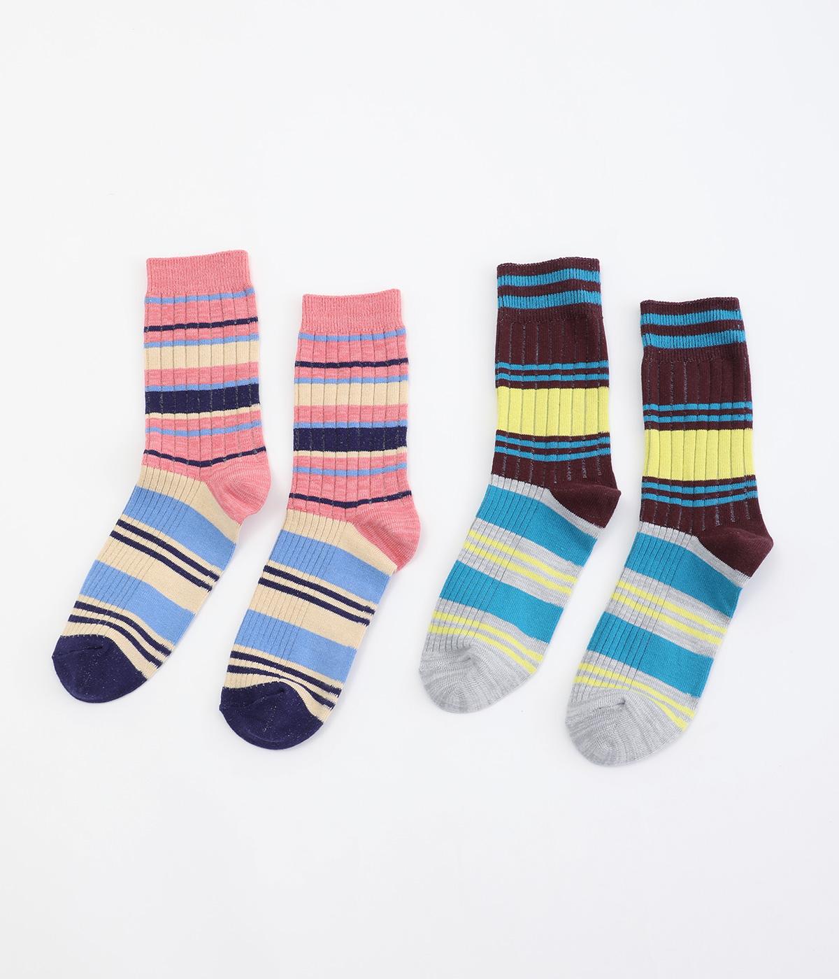 なんだかなつかしさを感じるレトロ配色のマルチボーダー柄が特徴的なソックス2足セット。足首と甲の部分でリブ幅に変化をつけています。はき口からつま先までボーダー柄がたのしめるので、スポーツサンダルなど広くあいたシューズ合わせもおすすめ。