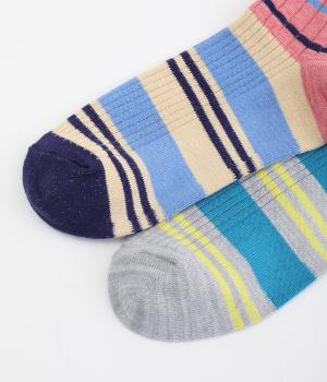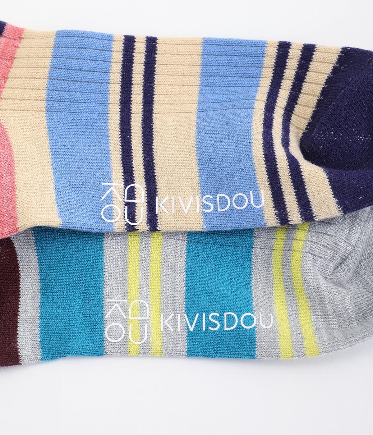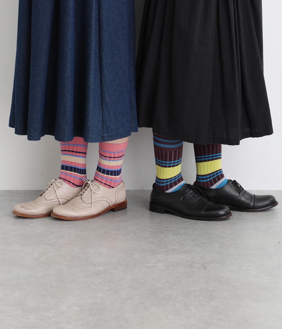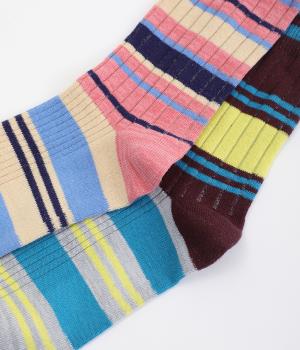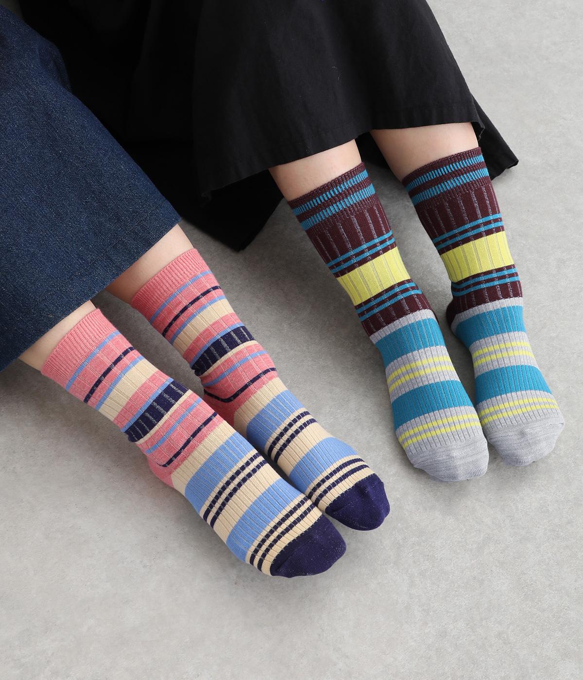 なんだかなつかしさを感じるレトロ配色のマルチボーダー柄が特徴的なソックス2足セット。足首と甲の部分でリブ幅に変化をつけています。はき口からつま先までボーダー柄がたのしめるので、スポーツサンダルなど広くあいたシューズ合わせもおすすめ。
