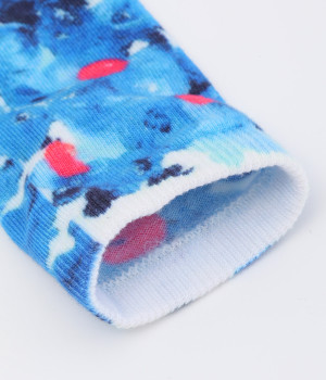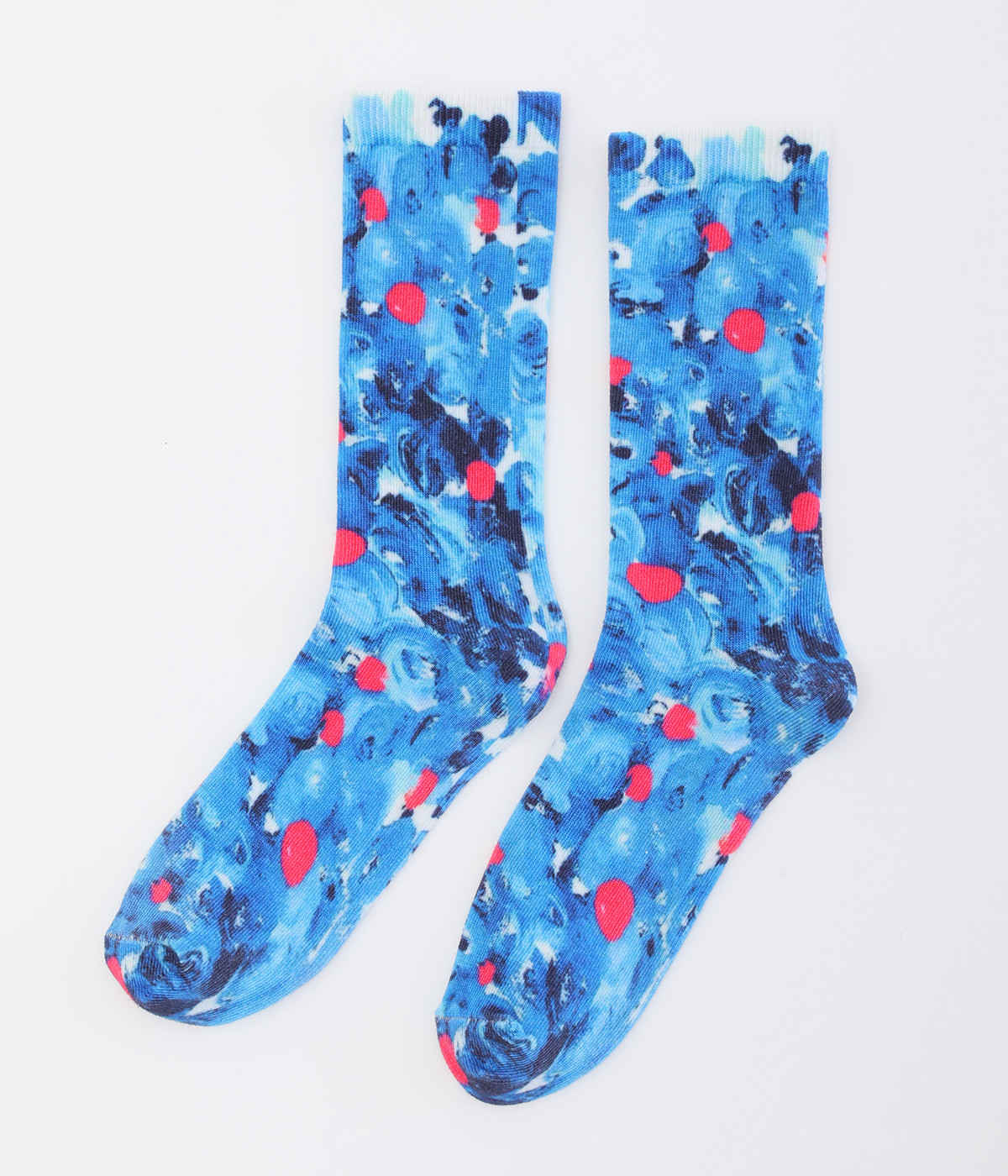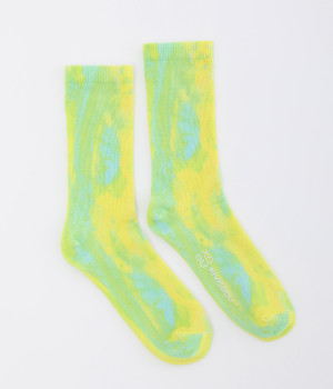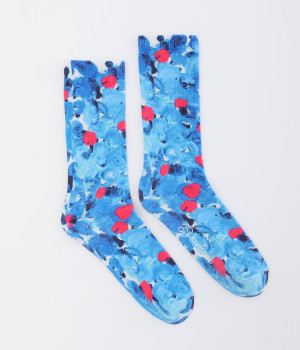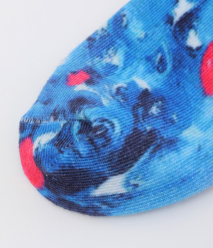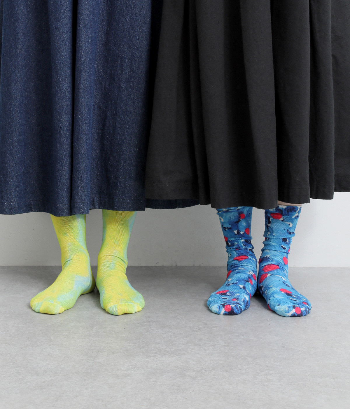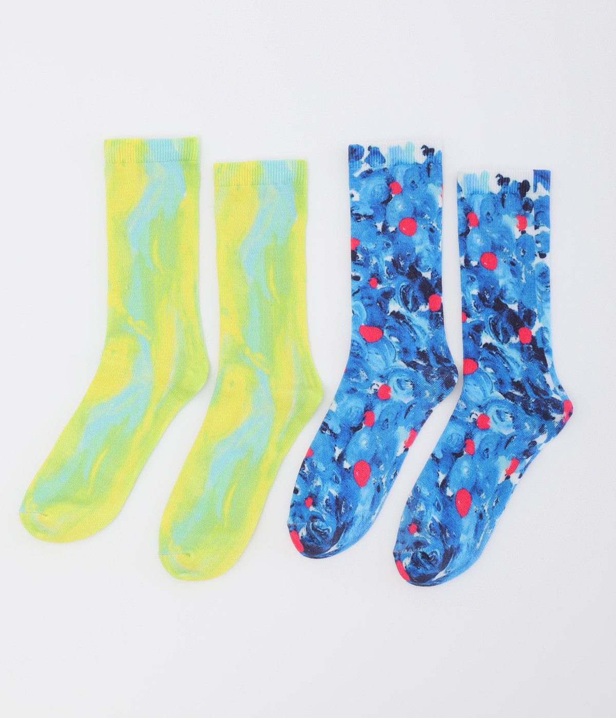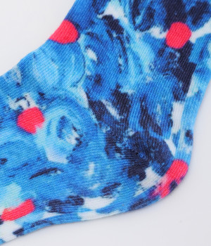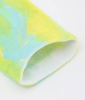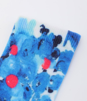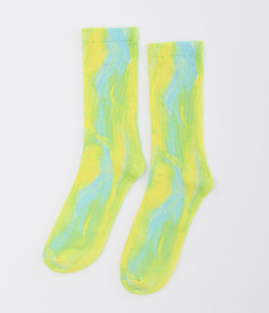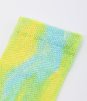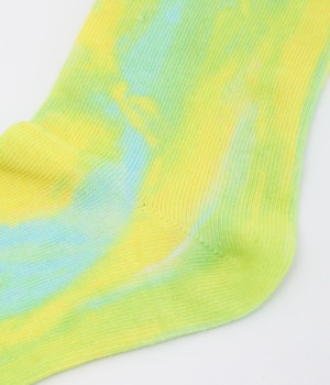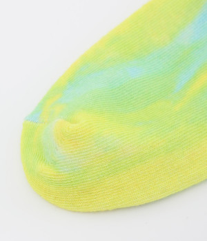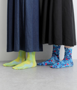 明るいイエロー系とブルー系のアーティスティックなプリント柄が、印象的な足元を演出するソックス。ロールアップしたパンツの裾から、ちらりとのぞかせるスタイリングもおすすめです。お得な二足組。