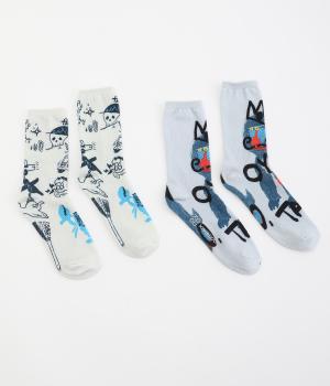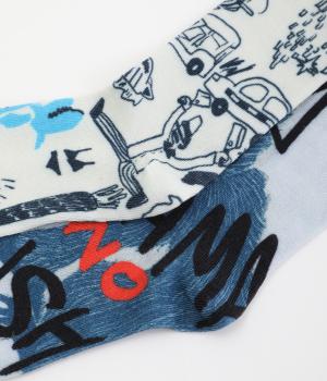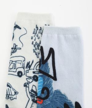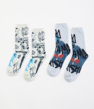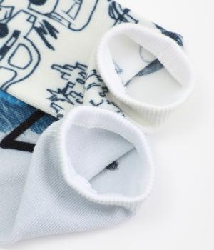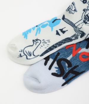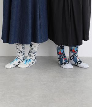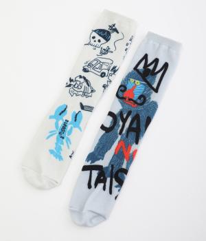 編み柄ではなくオールプリントで仕上げたカジュアルなソックスです。ストリートラクガキのようなデザインと、マンドリル柄の印象の異なる2種類でバリュー感があります。マンドリルには「OYAMA NO TAISYOU」と書かれたユーモアたっぷりな一足。