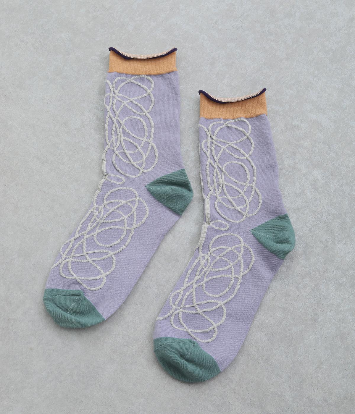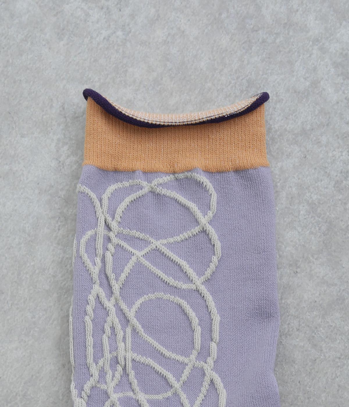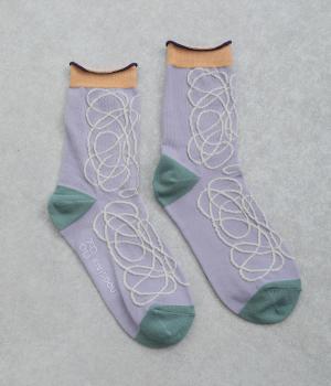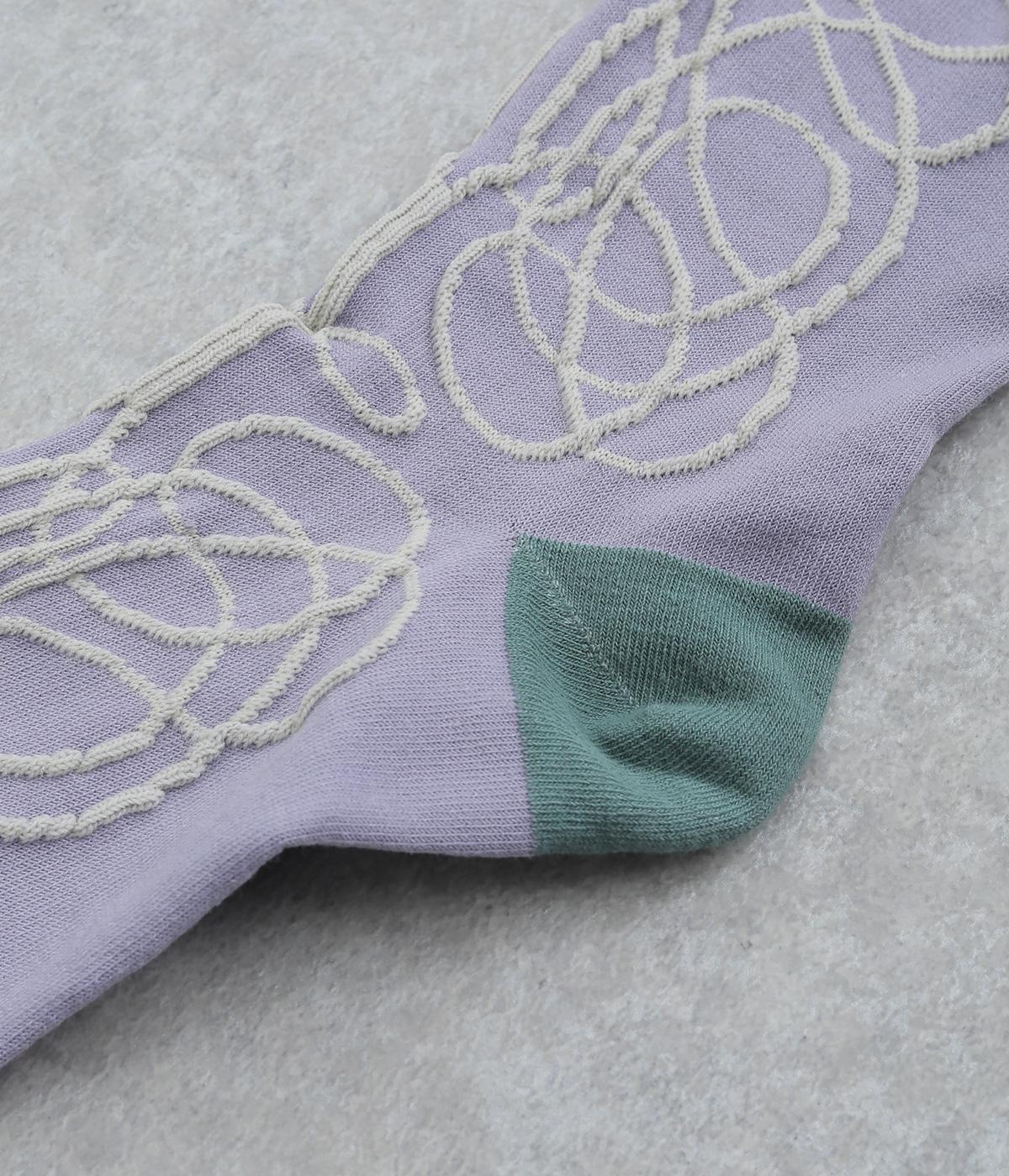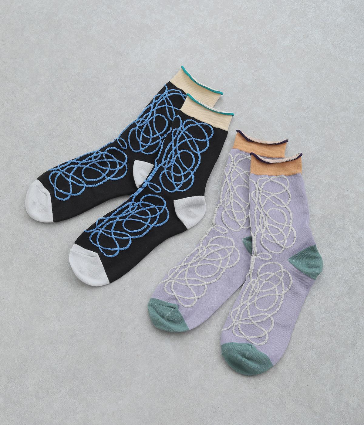 パステルカラーをベースに、ぐるぐるとしたロープ模様をフロート編みで立体的に表現したソックス2足セット。やわらかな色合いに遊び心のある柄が映えるデザインです。