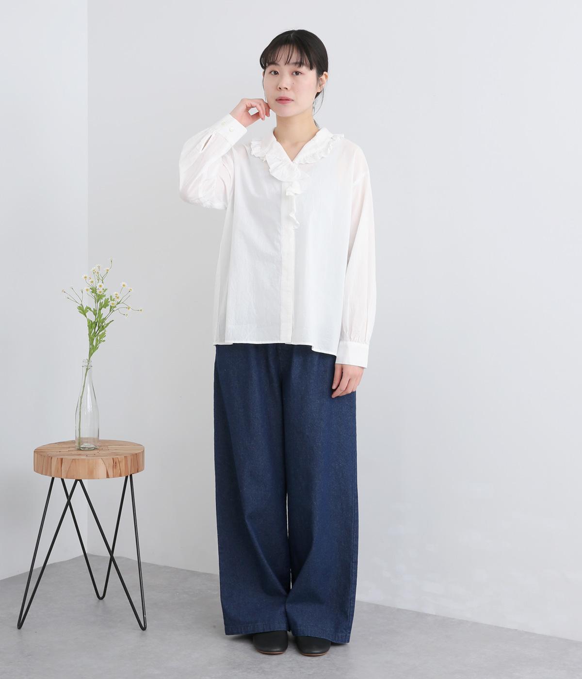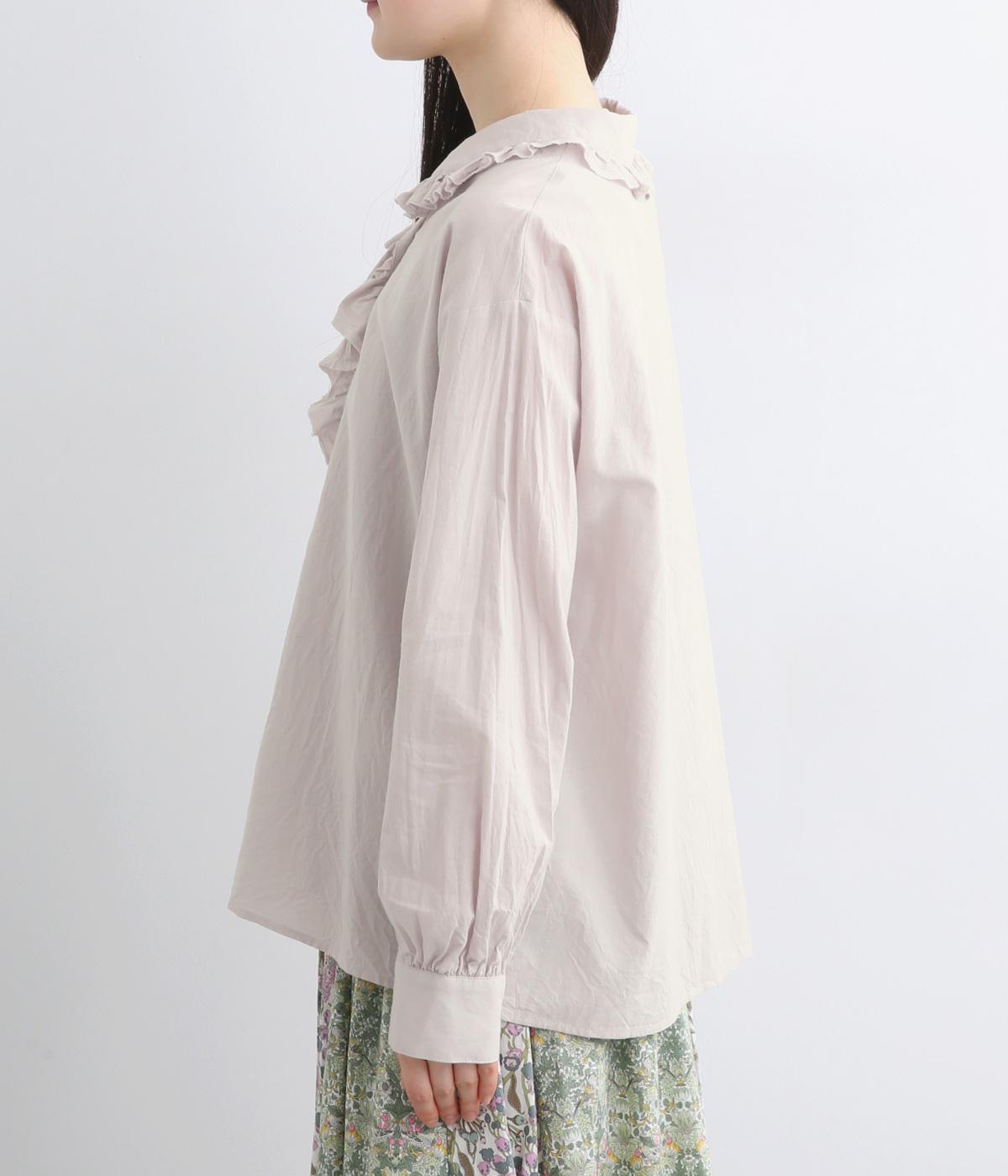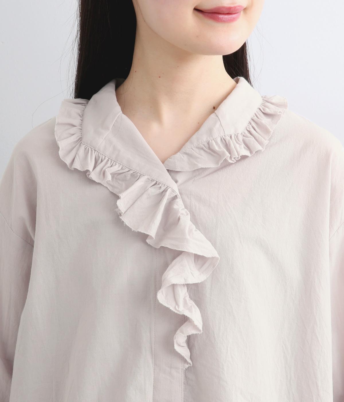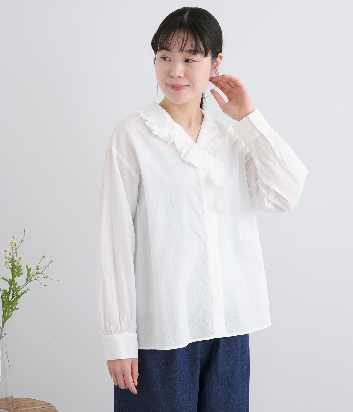 やわらかな生地が華やかさを引き立てるフリルシャツ。Vネックとフリルカラーが顔まわりを華やかに、すっきりと見せます。デニムと合わせたカジュアルコーディネートから、ビジネスやセレモニーなどきちんとした場まで、幅広く着まわせる一枚です。