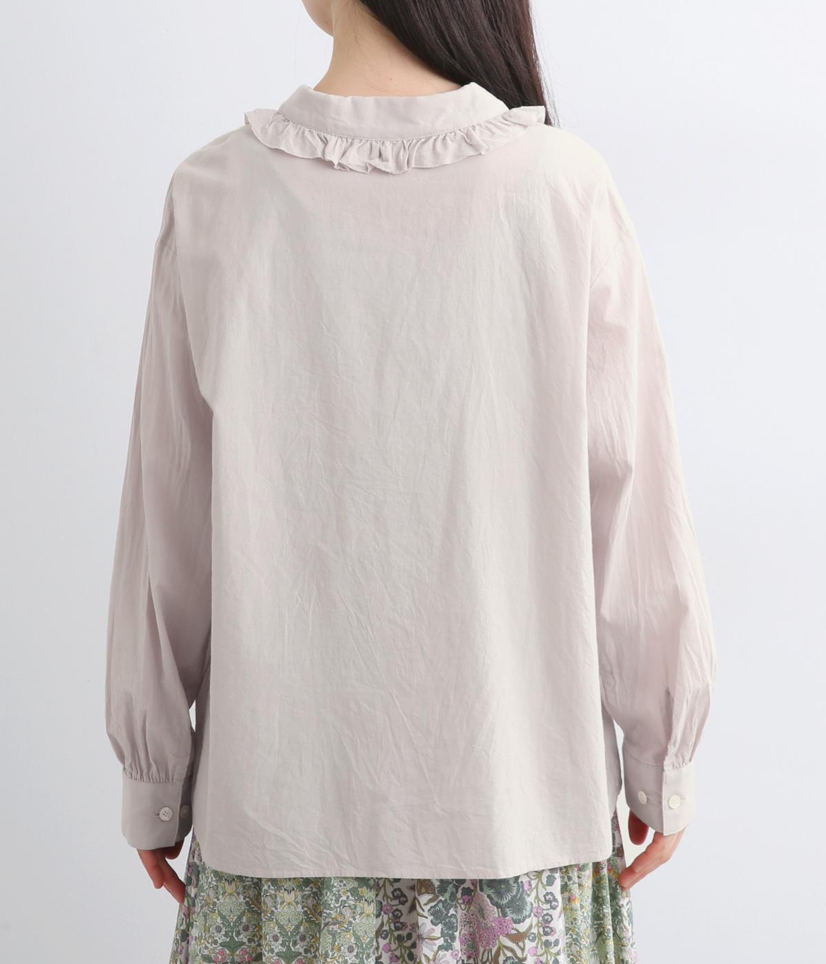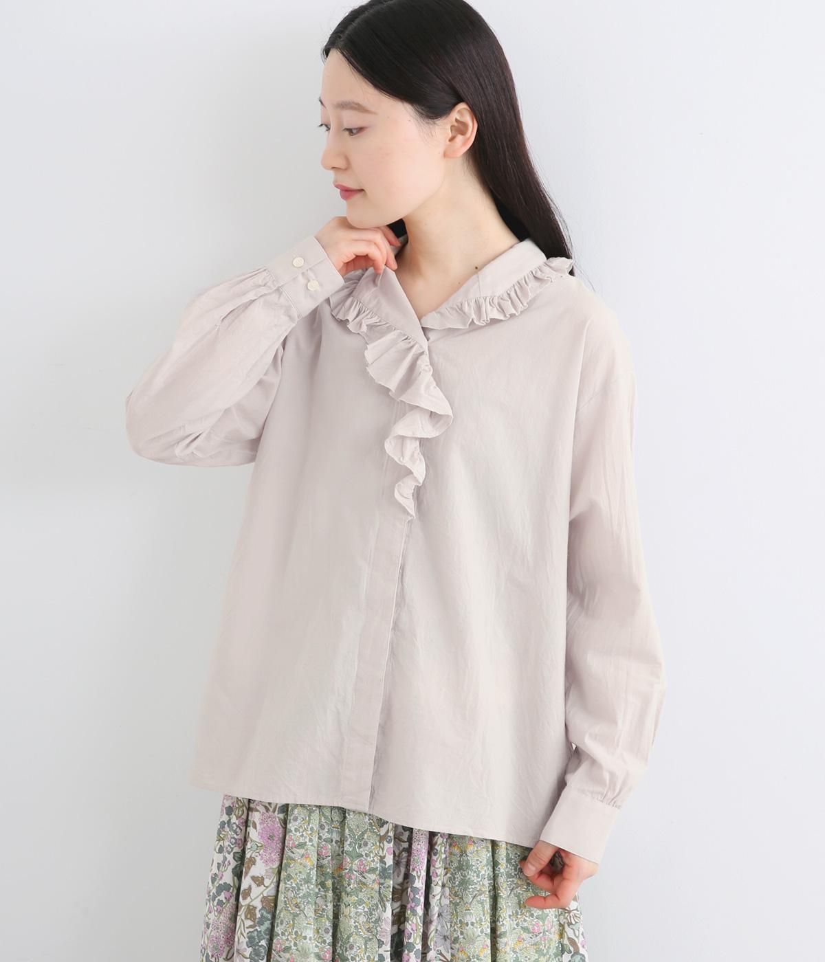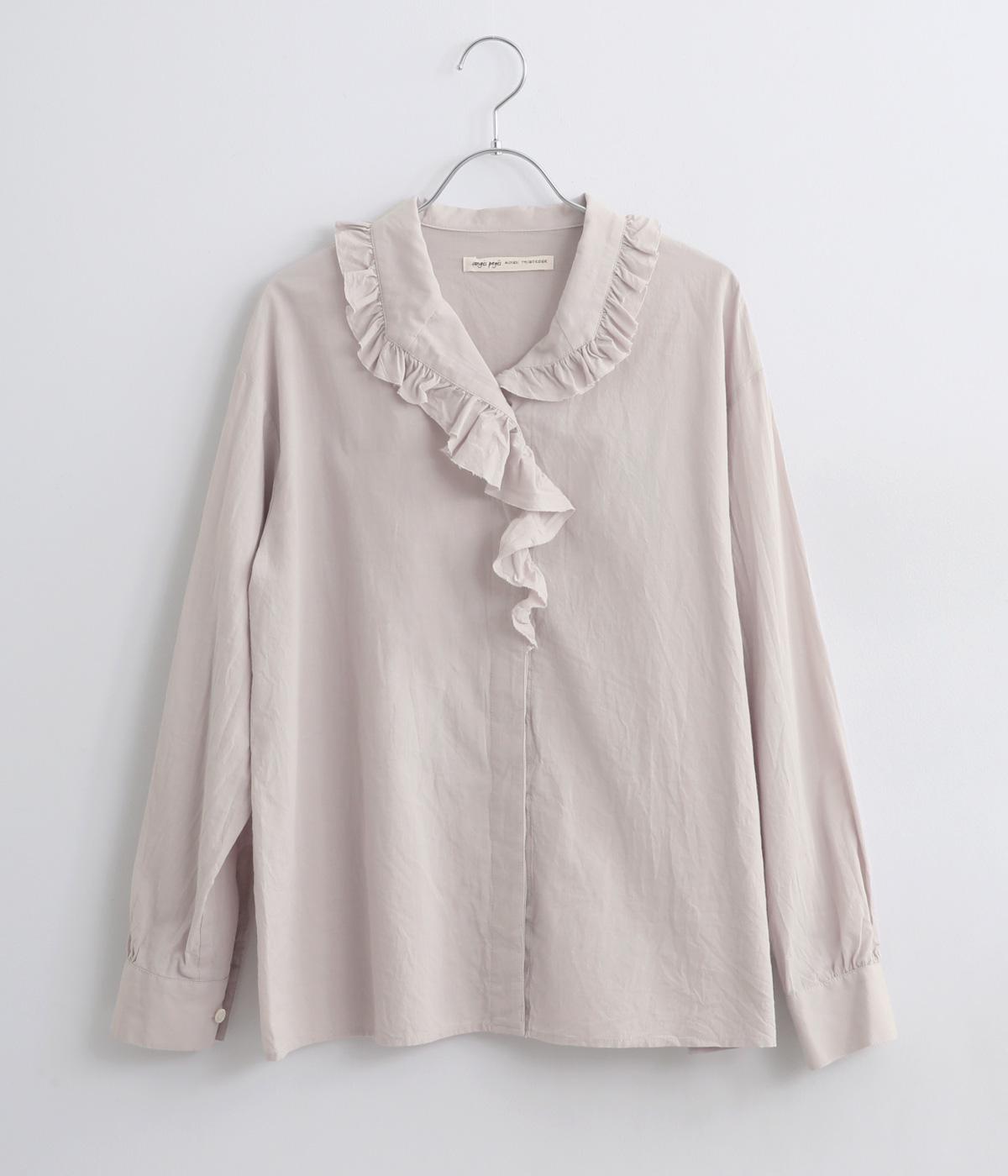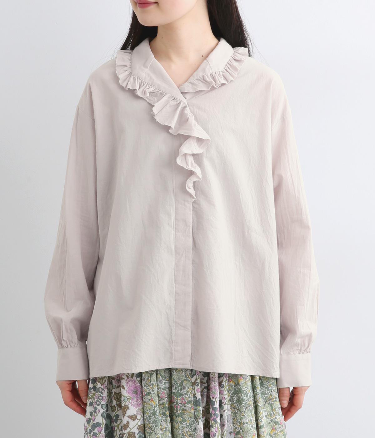 やわらかな生地が華やかさを引き立てるフリルシャツ。Vネックとフリルカラーが顔まわりを華やかに、すっきりと見せます。デニムと合わせたカジュアルコーディネートから、ビジネスやセレモニーなどきちんとした場まで、幅広く着まわせる一枚です。
