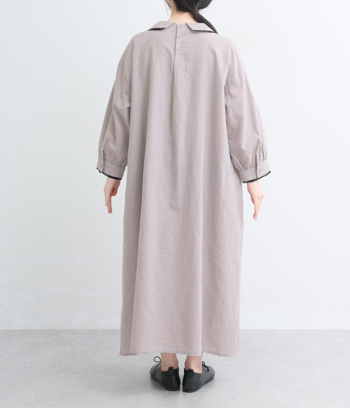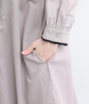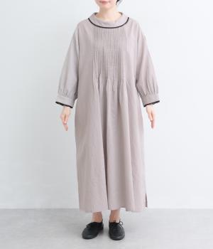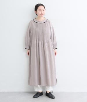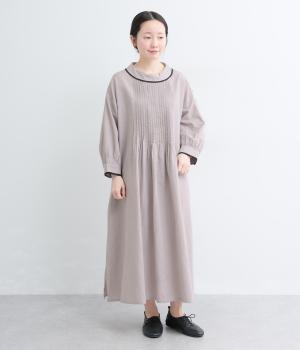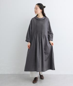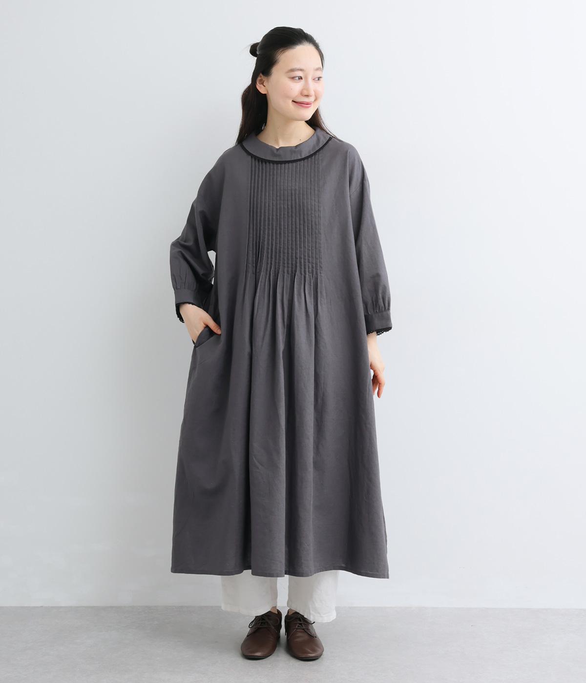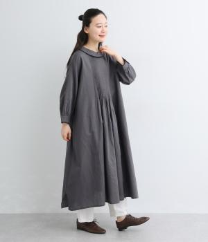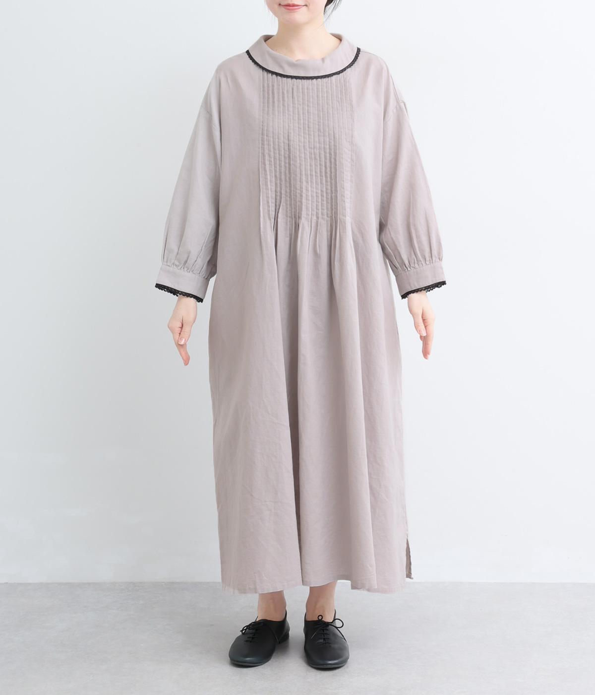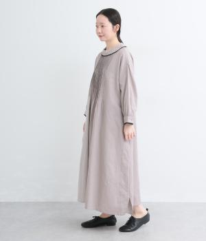 胸元にたっぷり入れたピンタックやターンカラーがクラシカルでガーリーテイストなワンピース。襟や袖に配色レースをさり気なくあしらってメリハリをきかせています。ゆったりとしたフレアシルエットにナチュラル素材で着心地も快適です。