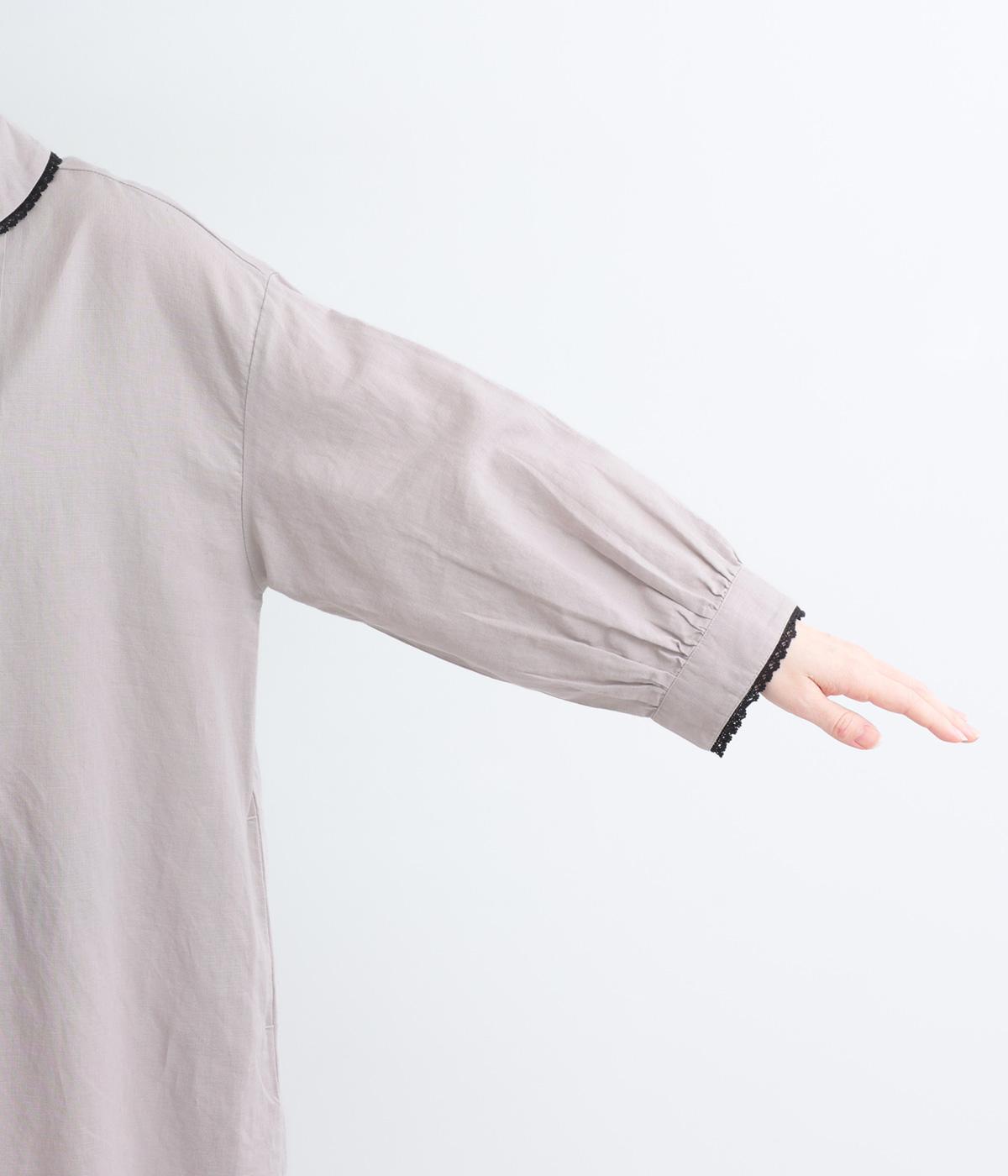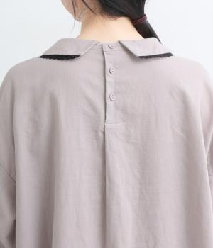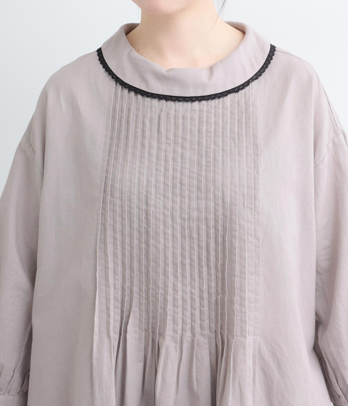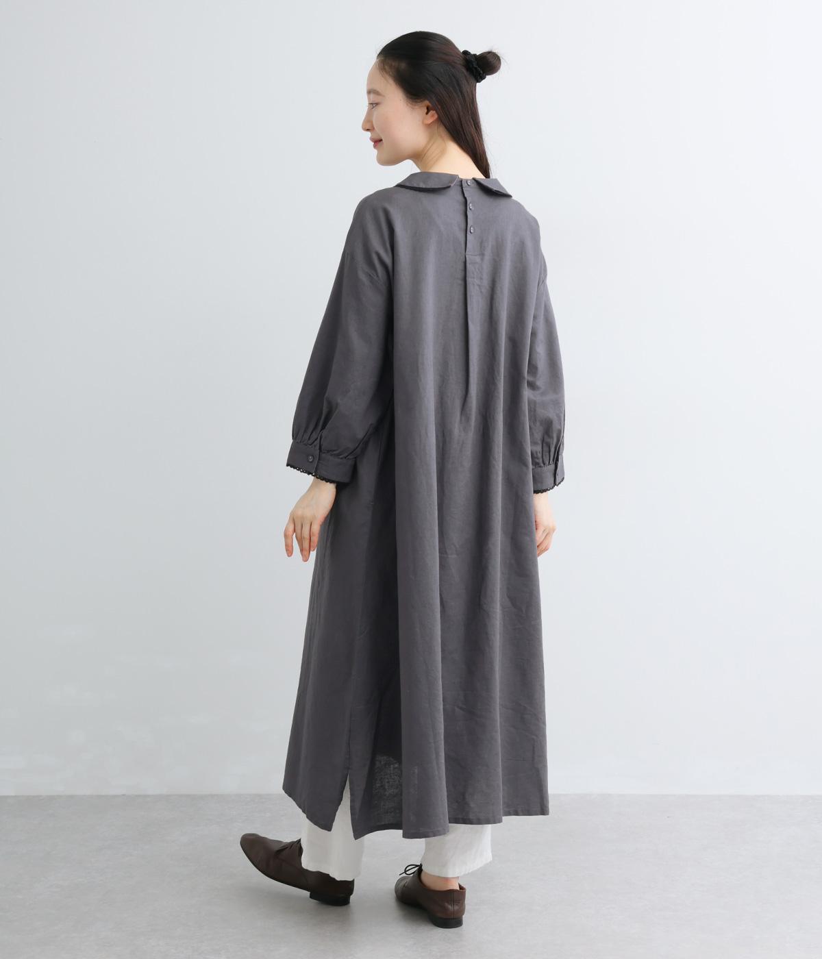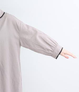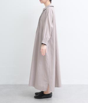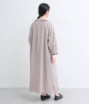 胸元にたっぷり入れたピンタックやターンカラーがクラシカルでガーリーテイストなワンピース。襟や袖に配色レースをさり気なくあしらってメリハリをきかせています。ゆったりとしたフレアシルエットにナチュラル素材で着心地も快適です。