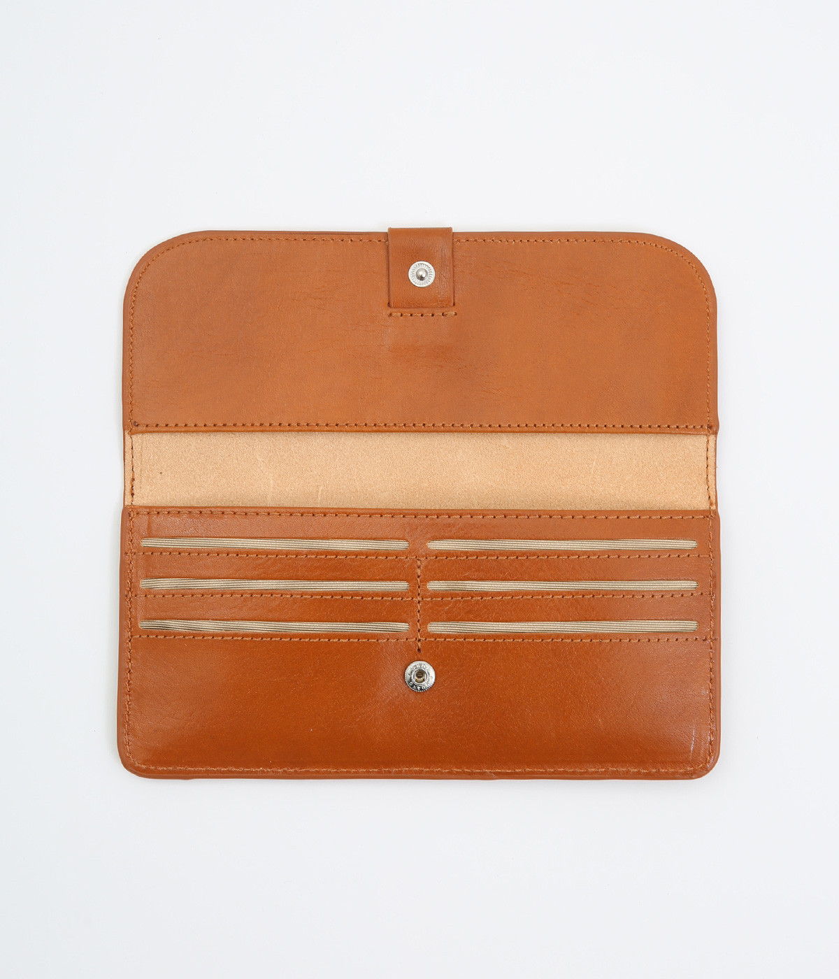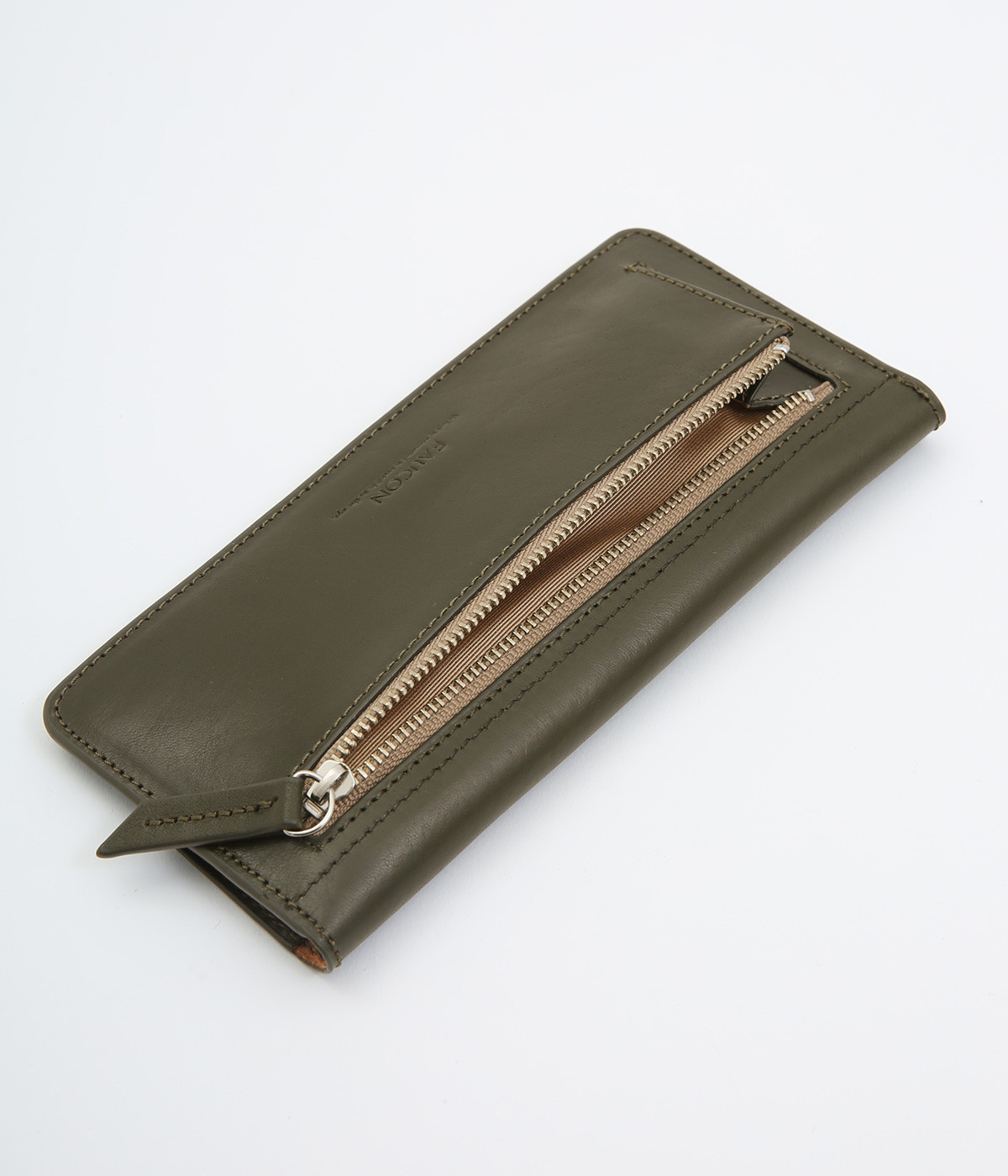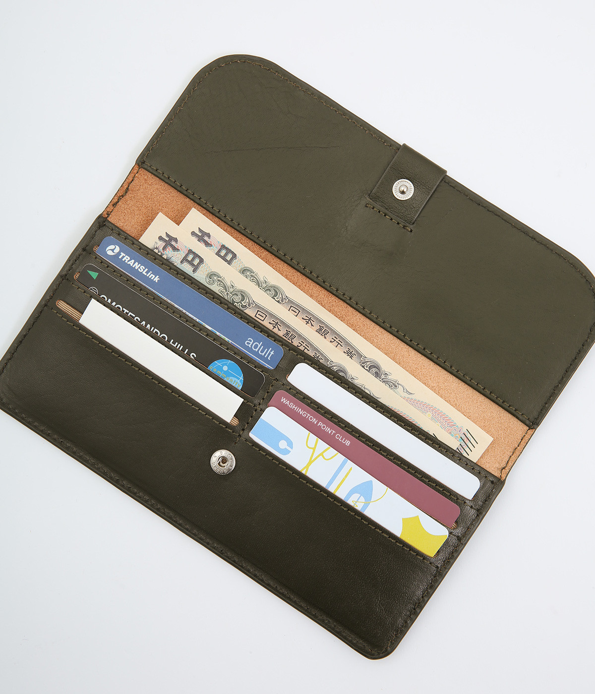 マチのない薄型でもカード入れに2枚づつ入る大容量のロングウォレットです。背面の小銭入れはマチがあるので大きく開口し、小銭の出し入れもスムーズ。札入れは仕切りをつけて薄型でも仕分けしてすっきり収納できます。