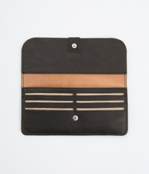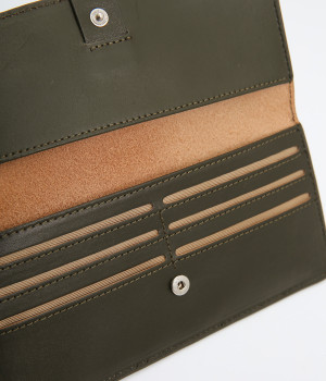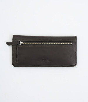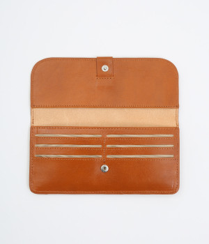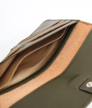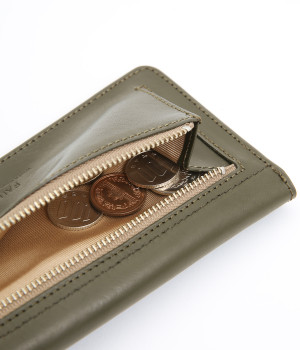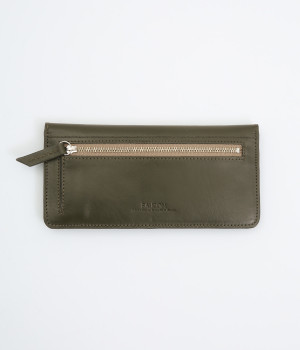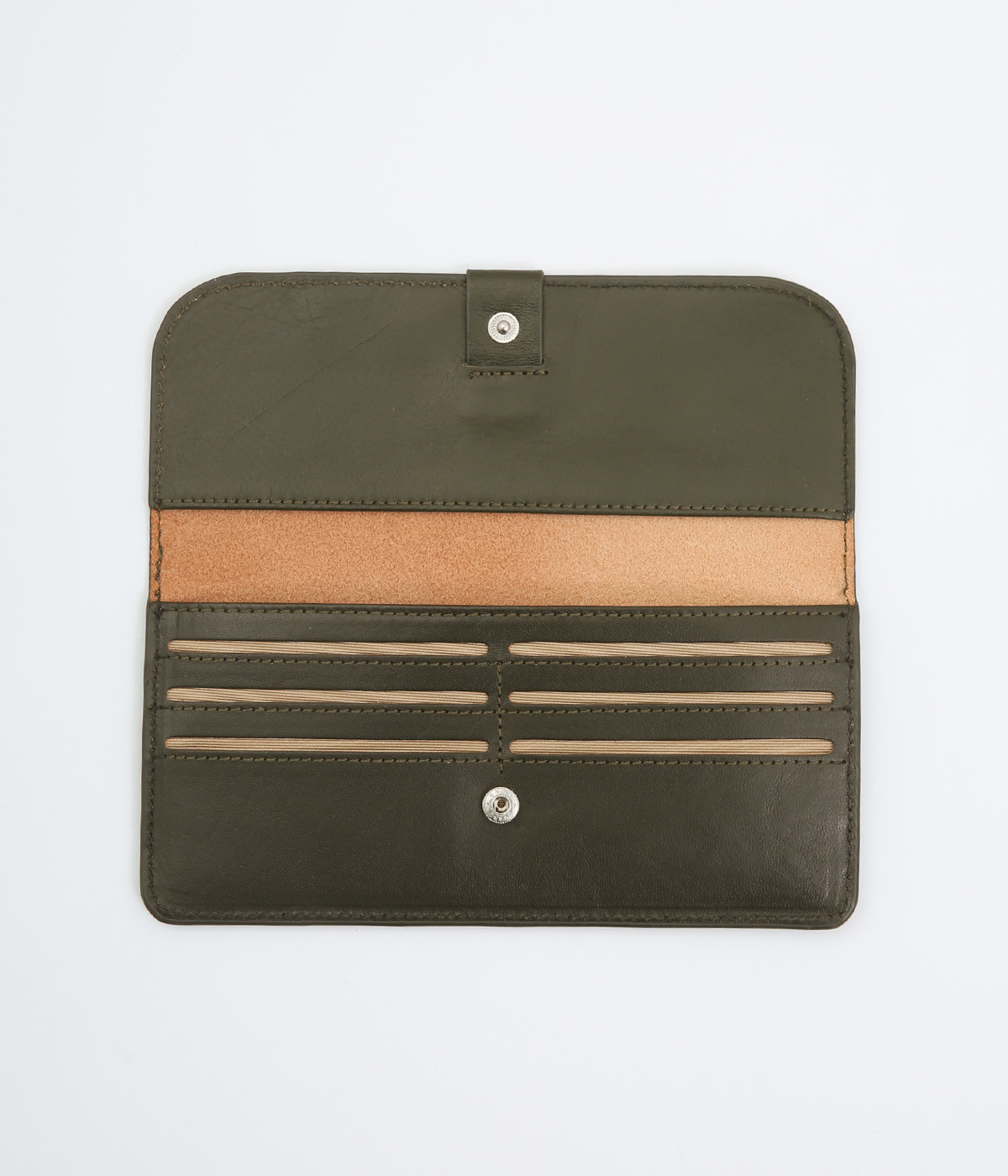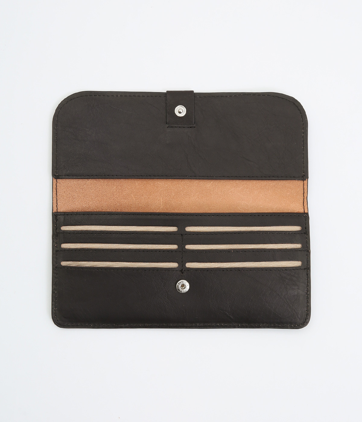 マチのない薄型でもカード入れに2枚づつ入る大容量のロングウォレットです。背面の小銭入れはマチがあるので大きく開口し、小銭の出し入れもスムーズ。札入れは仕切りをつけて薄型でも仕分けしてすっきり収納できます。