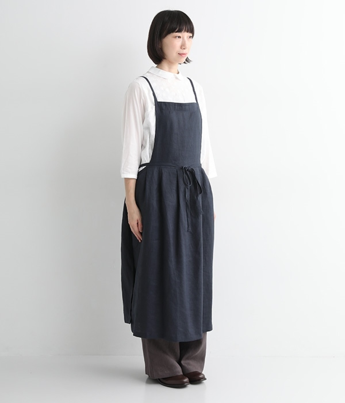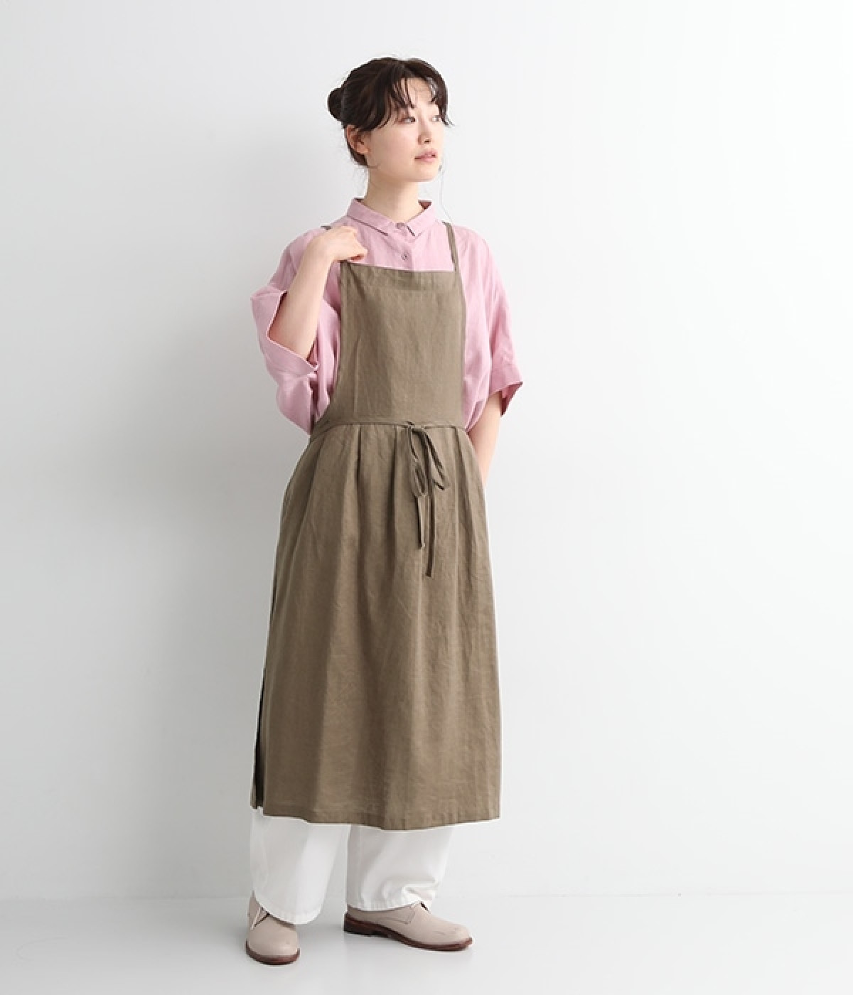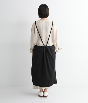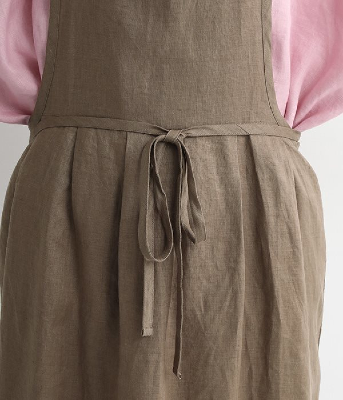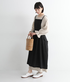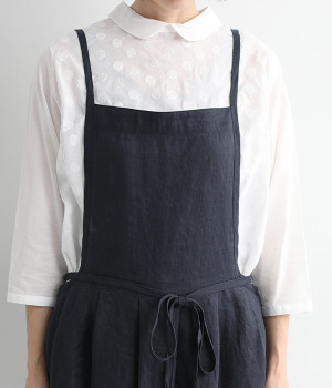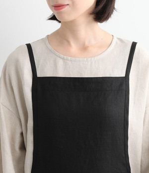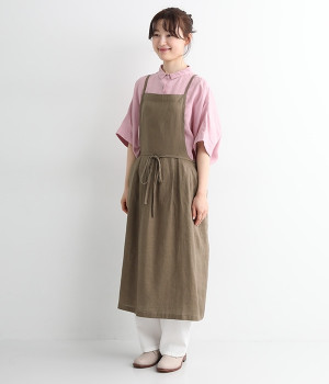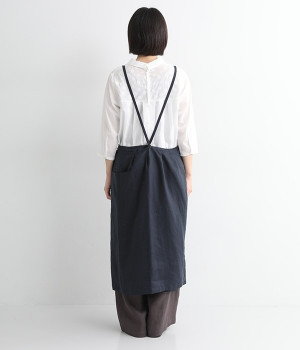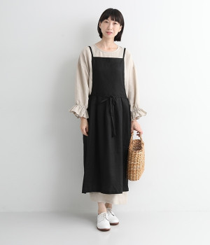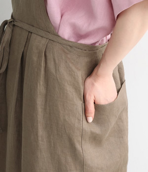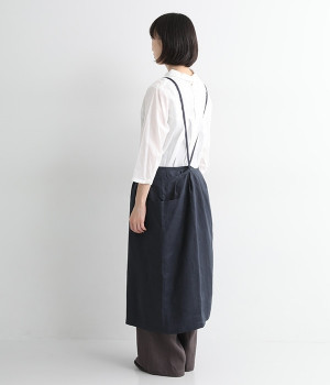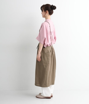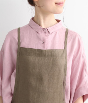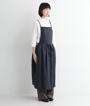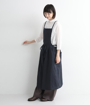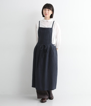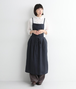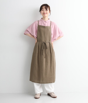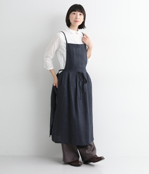 さらっとナチュラルな風合いのリネンで仕立てたおしゃれなエプロンです。胸あてをあえて細めにすることで、大人っぽく着られるエプロンを目指しました。すっきりとしたシルエットに、タックの分量も控えめにして広がりすぎないようデザイン。ワンピースなどと重ね着をすると裾がちらりと見えて素敵です。ウエストひもの結ぶ位置や肩ひものボタンの付け方で何通りも着こなしが楽しめます。