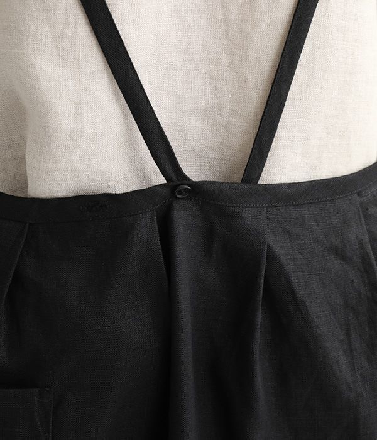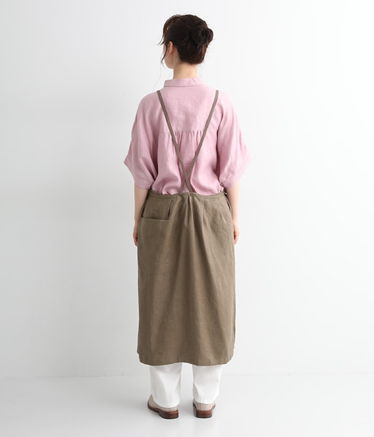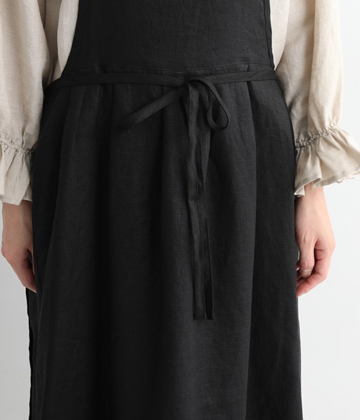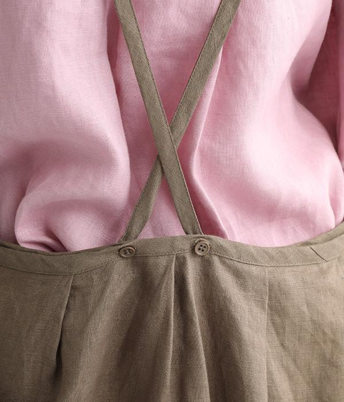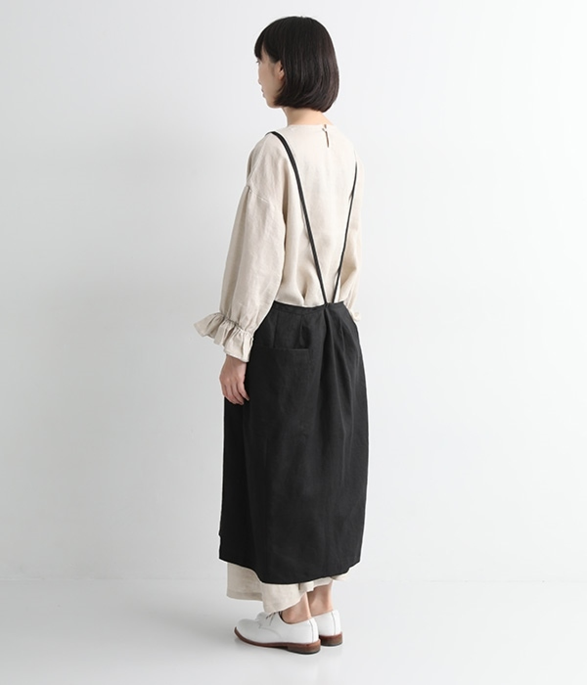 さらっとナチュラルな風合いのリネンで仕立てたおしゃれなエプロンです。胸あてをあえて細めにすることで、大人っぽく着られるエプロンを目指しました。すっきりとしたシルエットに、タックの分量も控えめにして広がりすぎないようデザイン。ワンピースなどと重ね着をすると裾がちらりと見えて素敵です。ウエストひもの結ぶ位置や肩ひものボタンの付け方で何通りも着こなしが楽しめます。