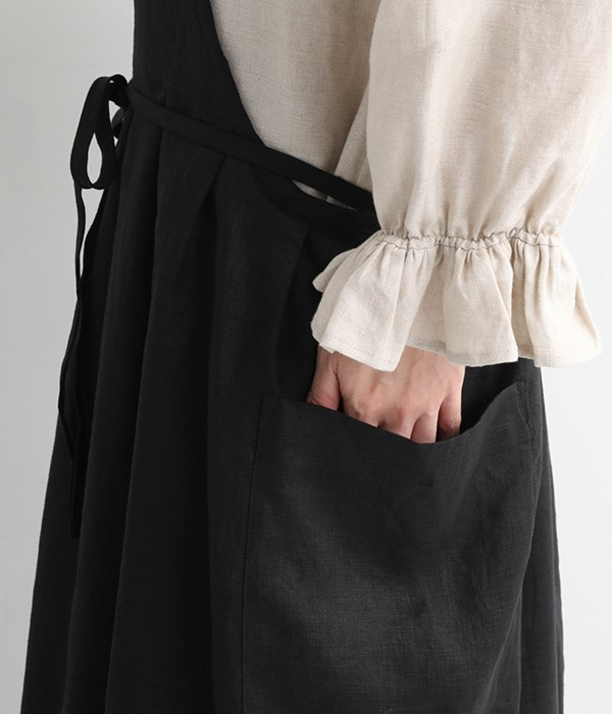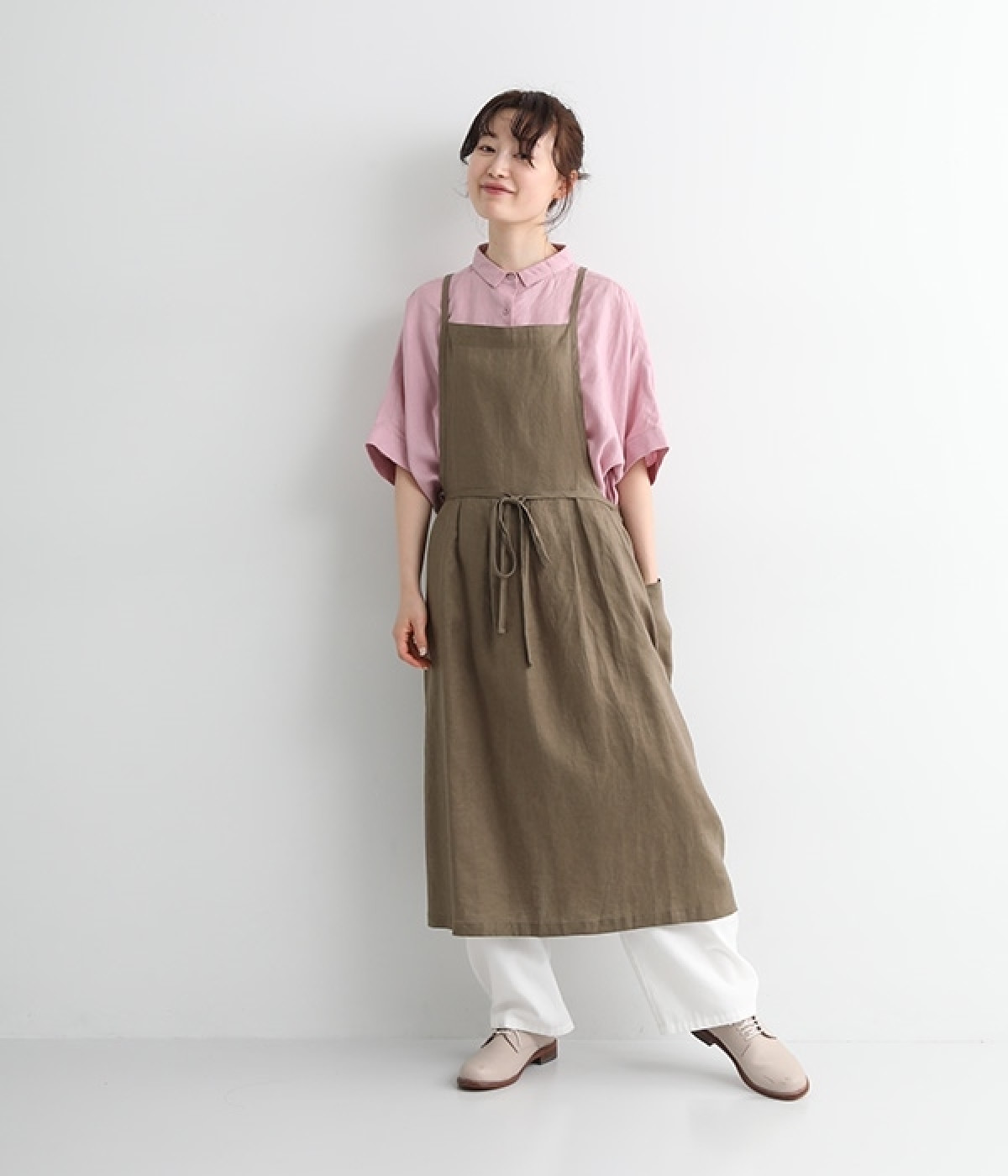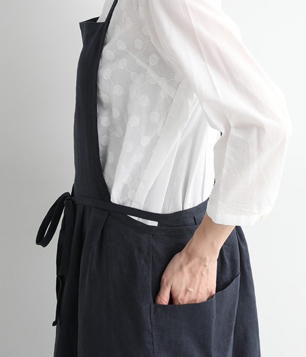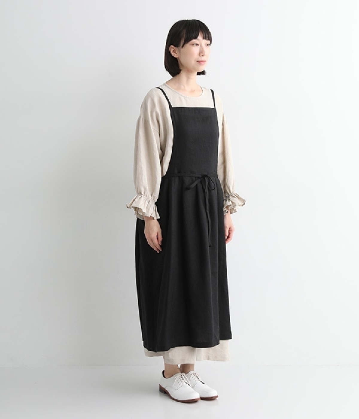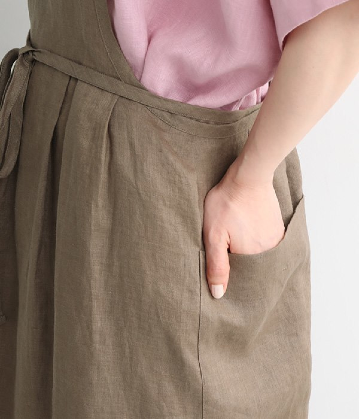 さらっとナチュラルな風合いのリネンで仕立てたおしゃれなエプロンです。胸あてをあえて細めにすることで、大人っぽく着られるエプロンを目指しました。すっきりとしたシルエットに、タックの分量も控えめにして広がりすぎないようデザイン。ワンピースなどと重ね着をすると裾がちらりと見えて素敵です。ウエストひもの結ぶ位置や肩ひものボタンの付け方で何通りも着こなしが楽しめます。