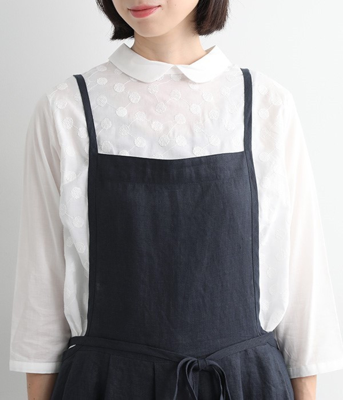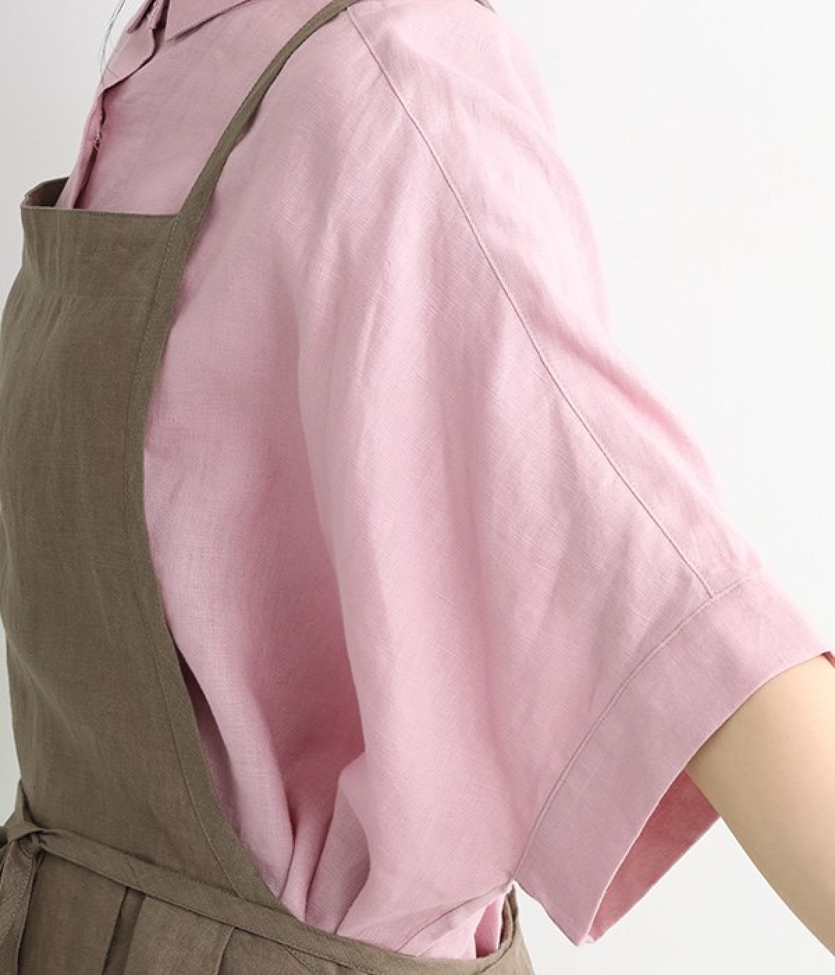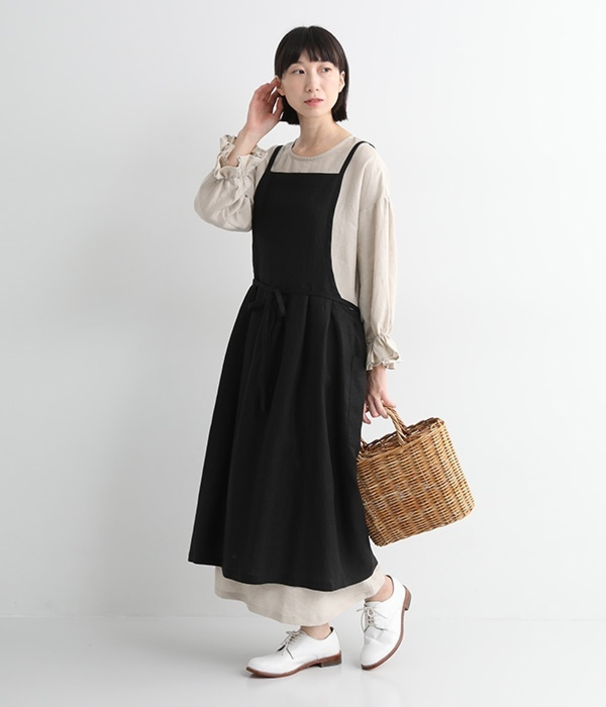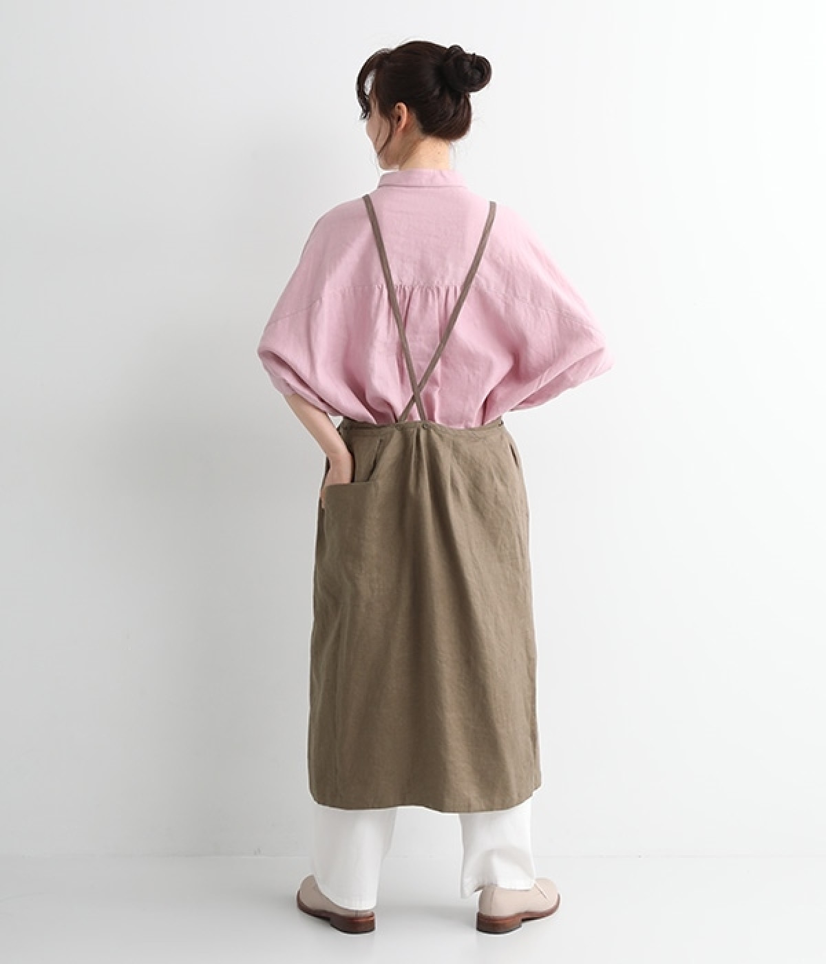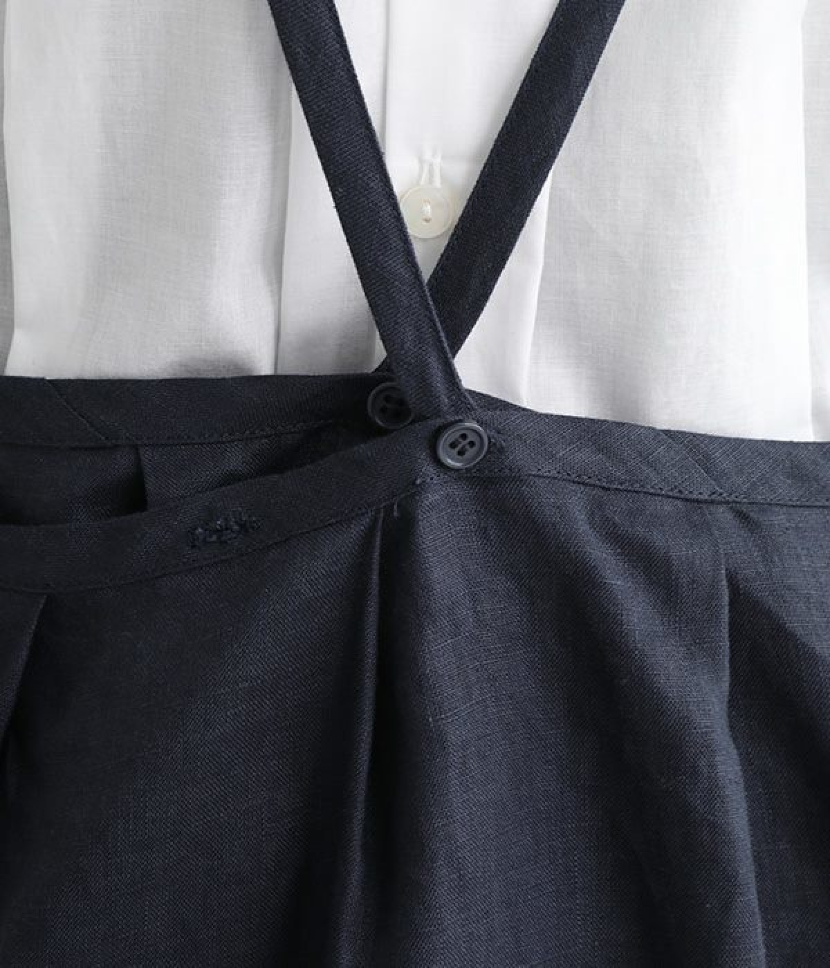 さらっとナチュラルな風合いのリネンで仕立てたおしゃれなエプロンです。胸あてをあえて細めにすることで、大人っぽく着られるエプロンを目指しました。すっきりとしたシルエットに、タックの分量も控えめにして広がりすぎないようデザイン。ワンピースなどと重ね着をすると裾がちらりと見えて素敵です。ウエストひもの結ぶ位置や肩ひものボタンの付け方で何通りも着こなしが楽しめます。
