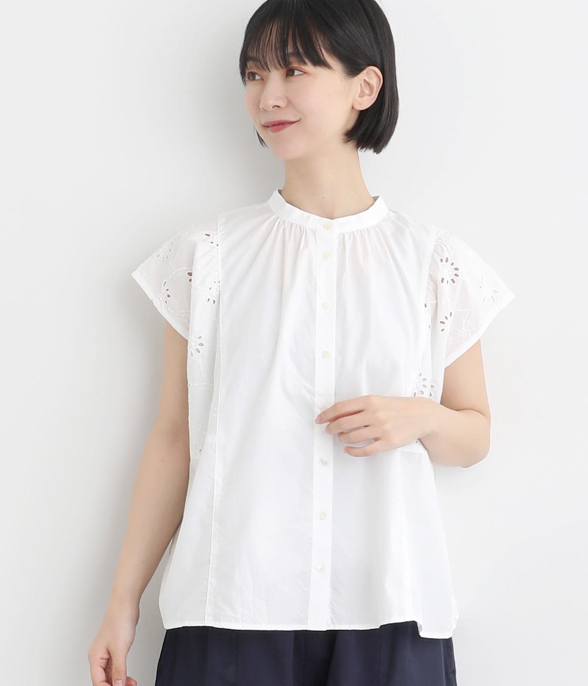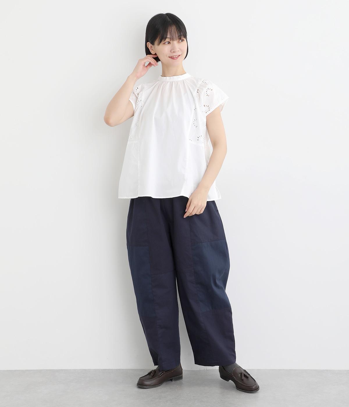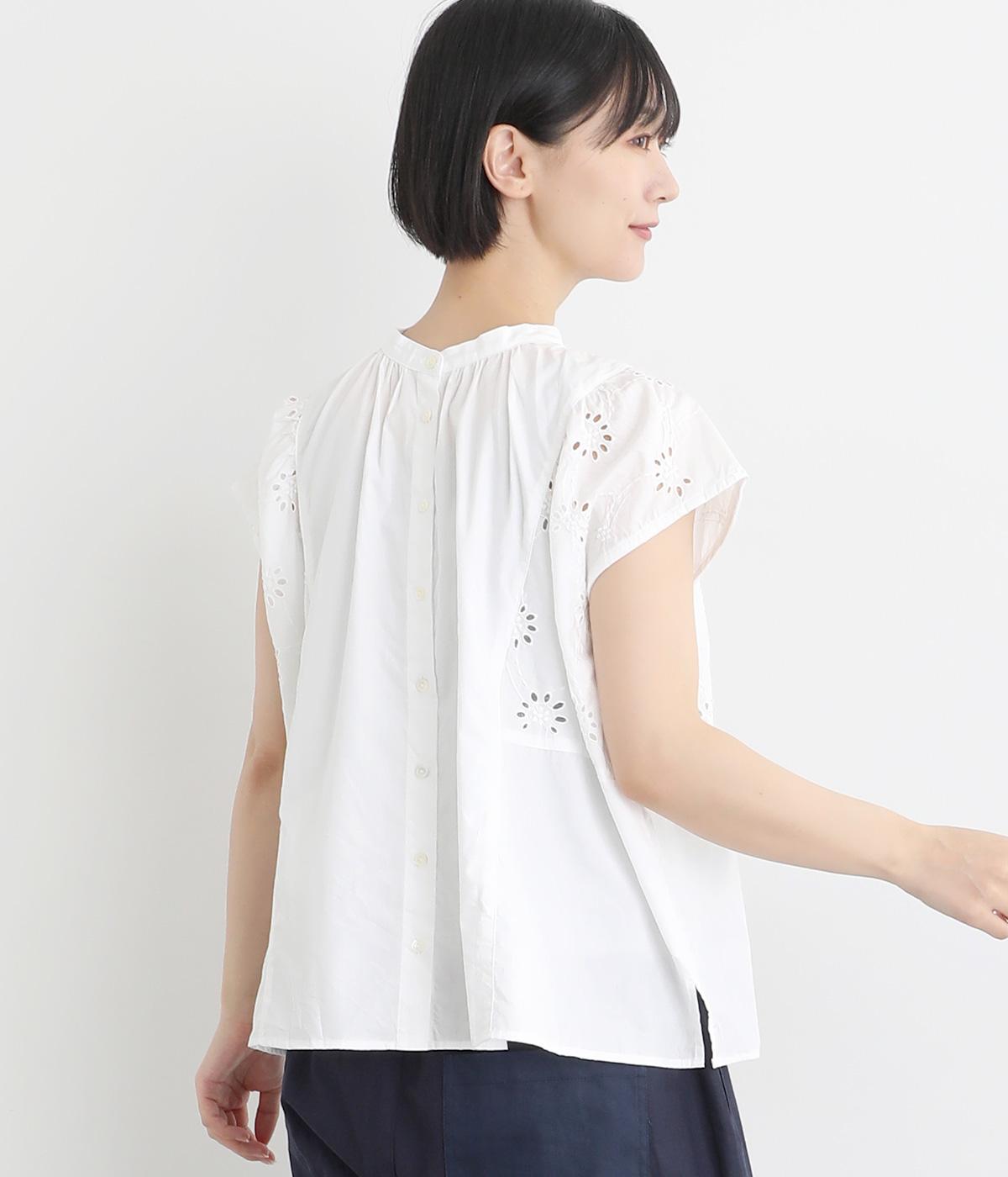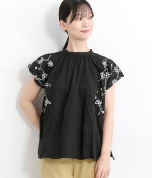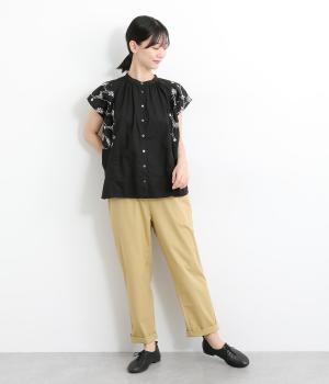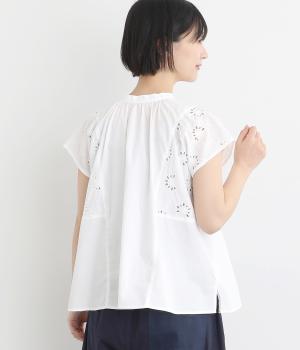 品のいい印象のコットンブラウスに刺しゅう生地を加えて華やかさをプラスしました。襟ぐりギャザーでゆとりのあるシルエットを描き、裾スリットでちょうどいい抜け感を。ボタン開きと前後2way仕様で、着こなしのバリエーションもさまざま。