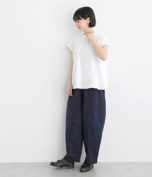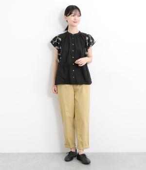 丈夫で耐久性の高いコットンブロード生地で仕立てました。ほのかに光沢があり、ふだん使いしやすくきちんと見えも叶えてくれます。袖まわりは刺しゅう生地に切り替えて変化をプラス。