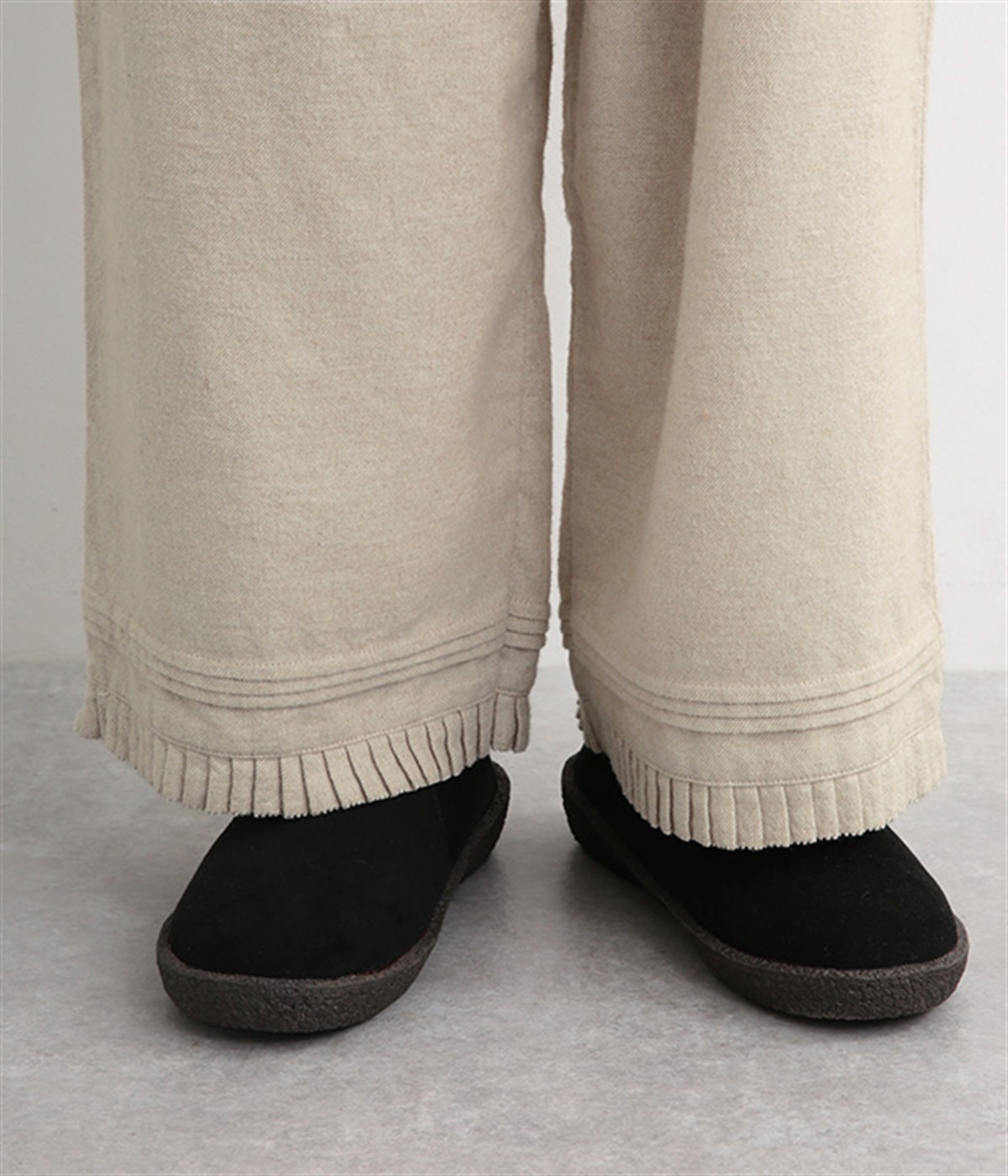 足元にかわいらしいニュアンスを与える裾のプリーツ&タック