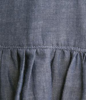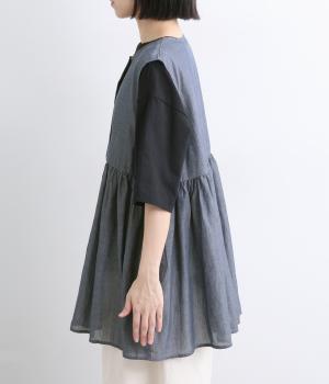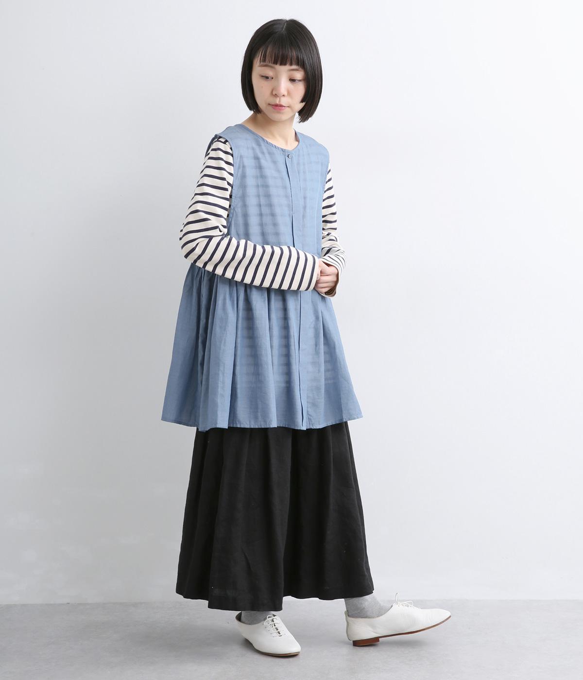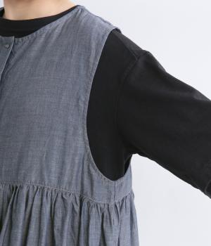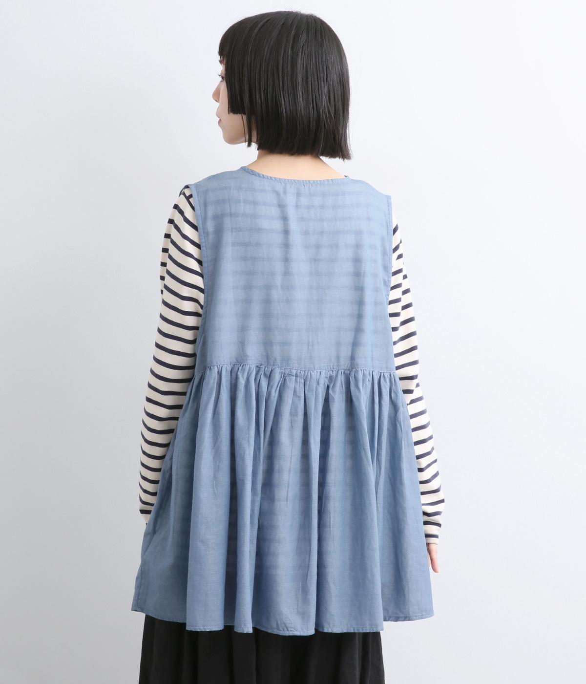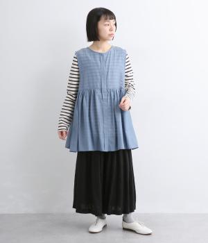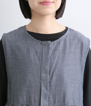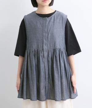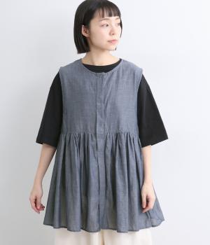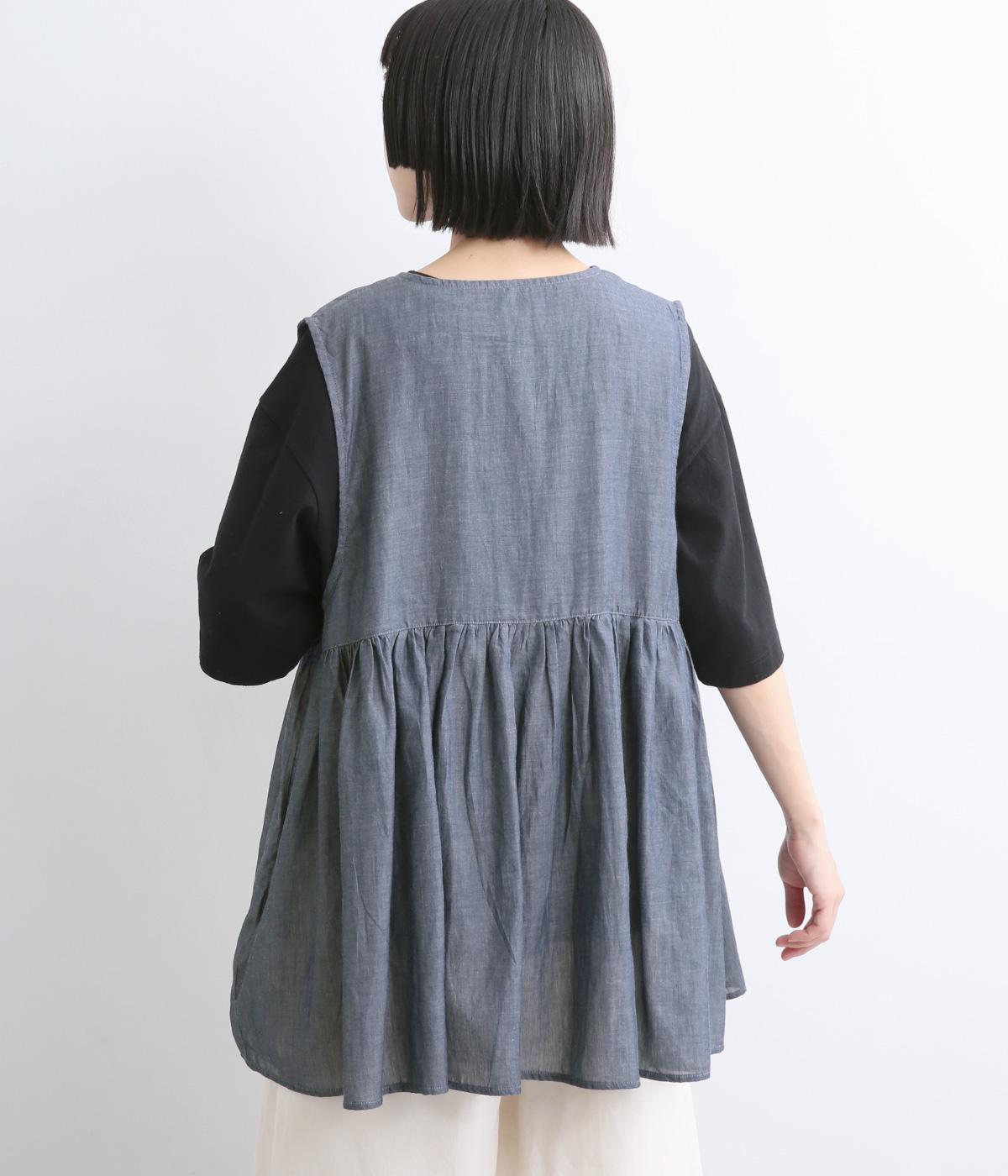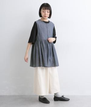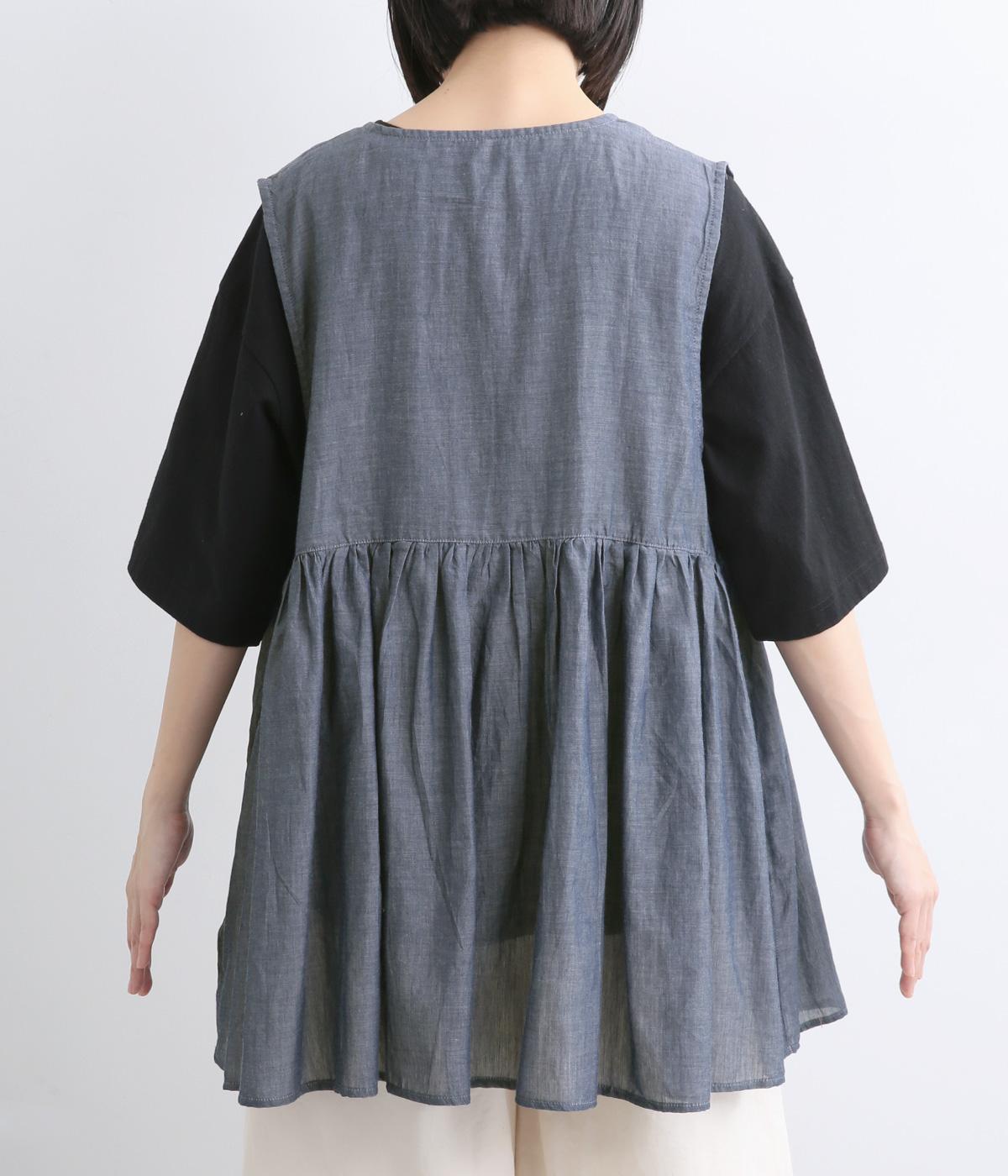 切り替えにギャザーを寄せてペプラム風シルエットに仕立てたベスト。フレアな可愛らしさと素材のもつさわやかさのバランスが良く、大人のナチュラルスタイルに取り入れやすい一枚。比翼仕立てでジレのように羽織っても◎。