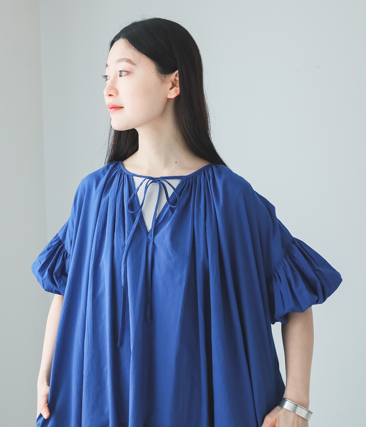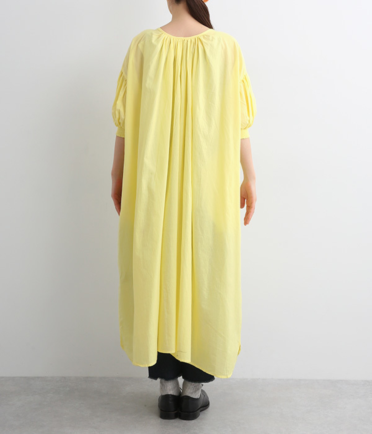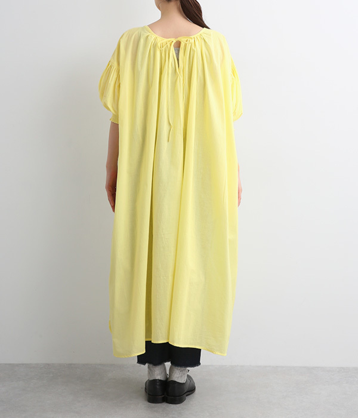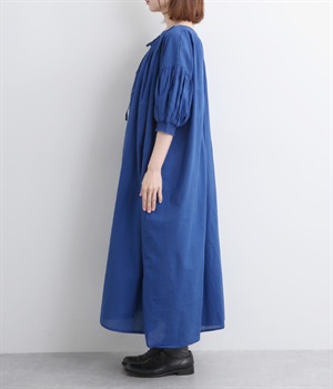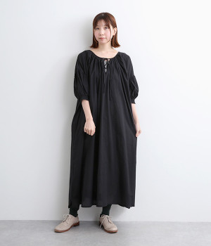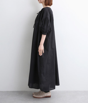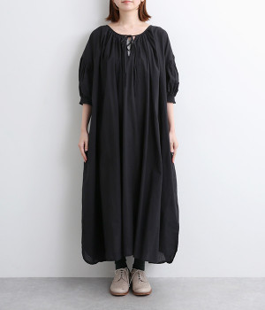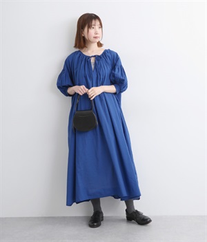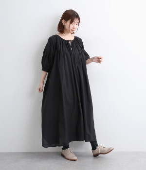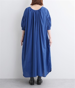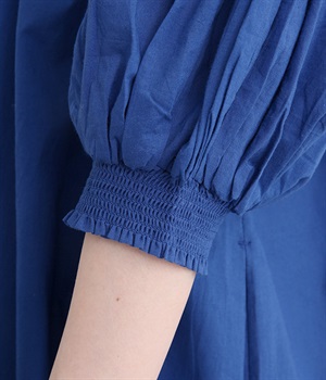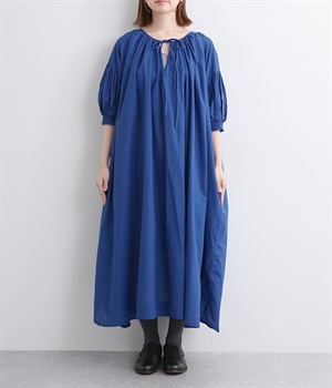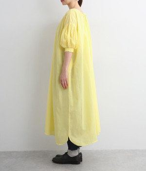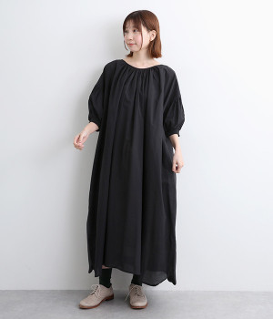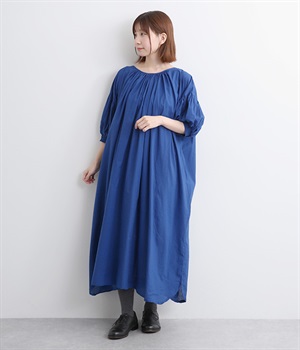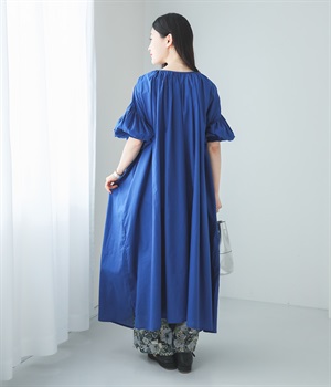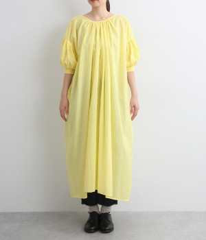 袖と首まわりに贅沢にギャザーをあしらったワンピースです。たっぷりと空気をはらみ、やわらかなボリューム感を表現。前後どちらでも着られる2way仕様で、コーディネートの幅も広がります。袖口のシャーリングもアクセントに。