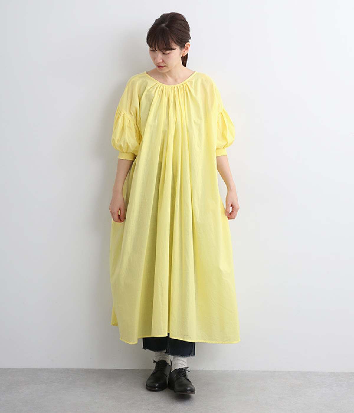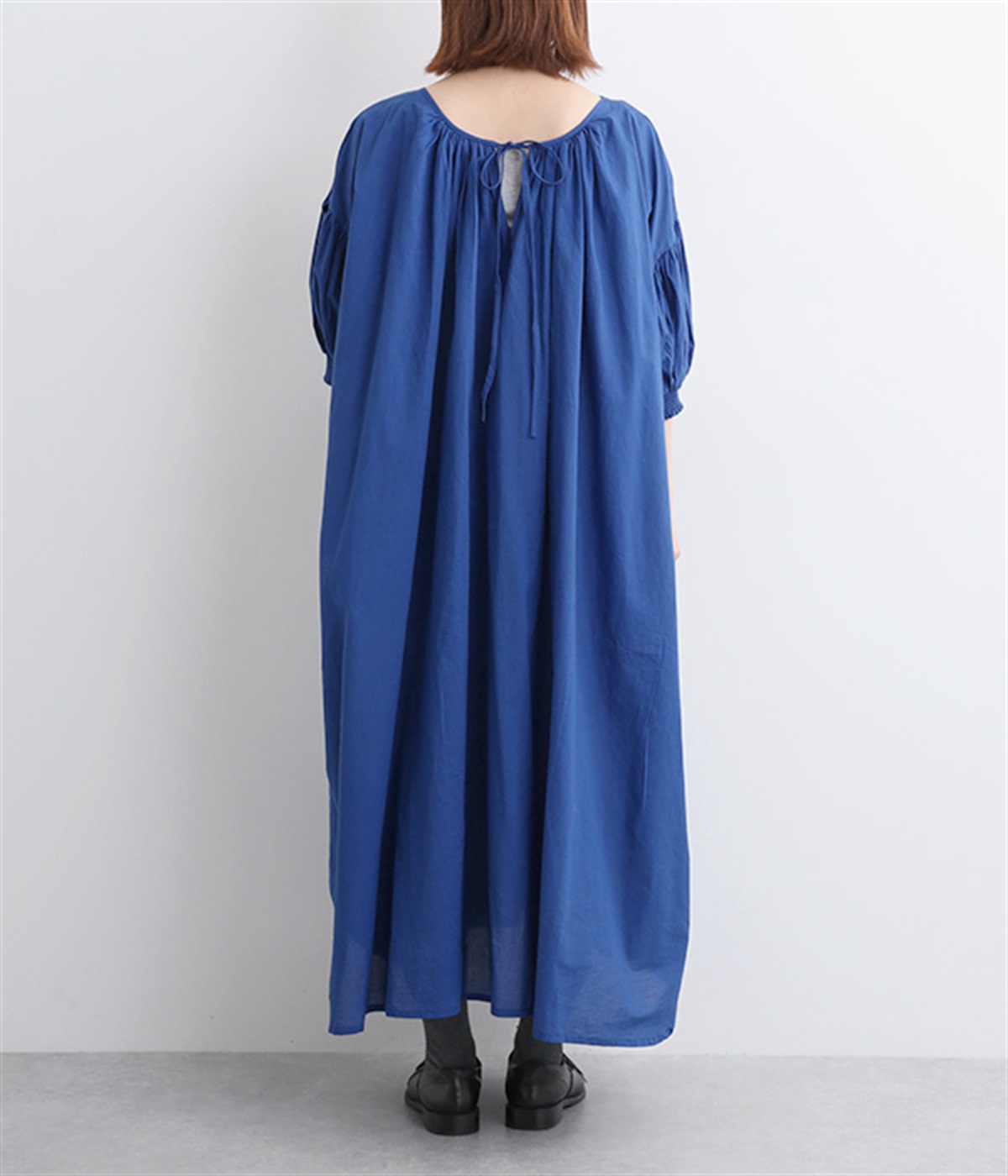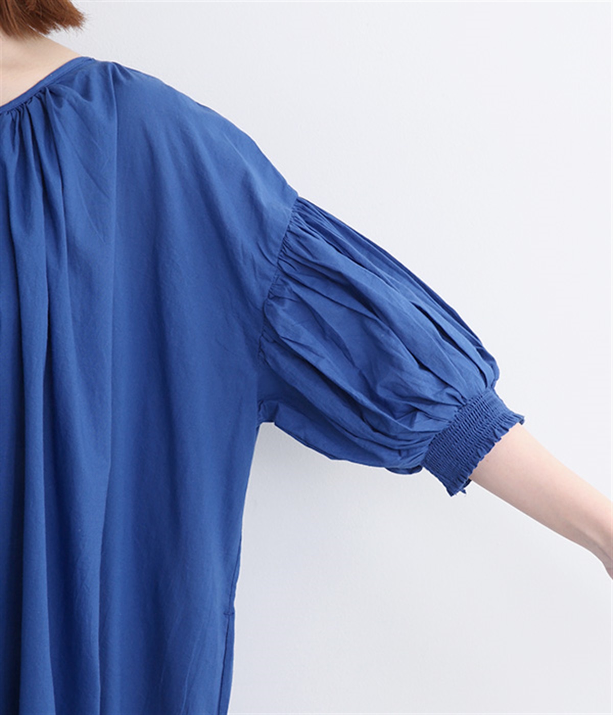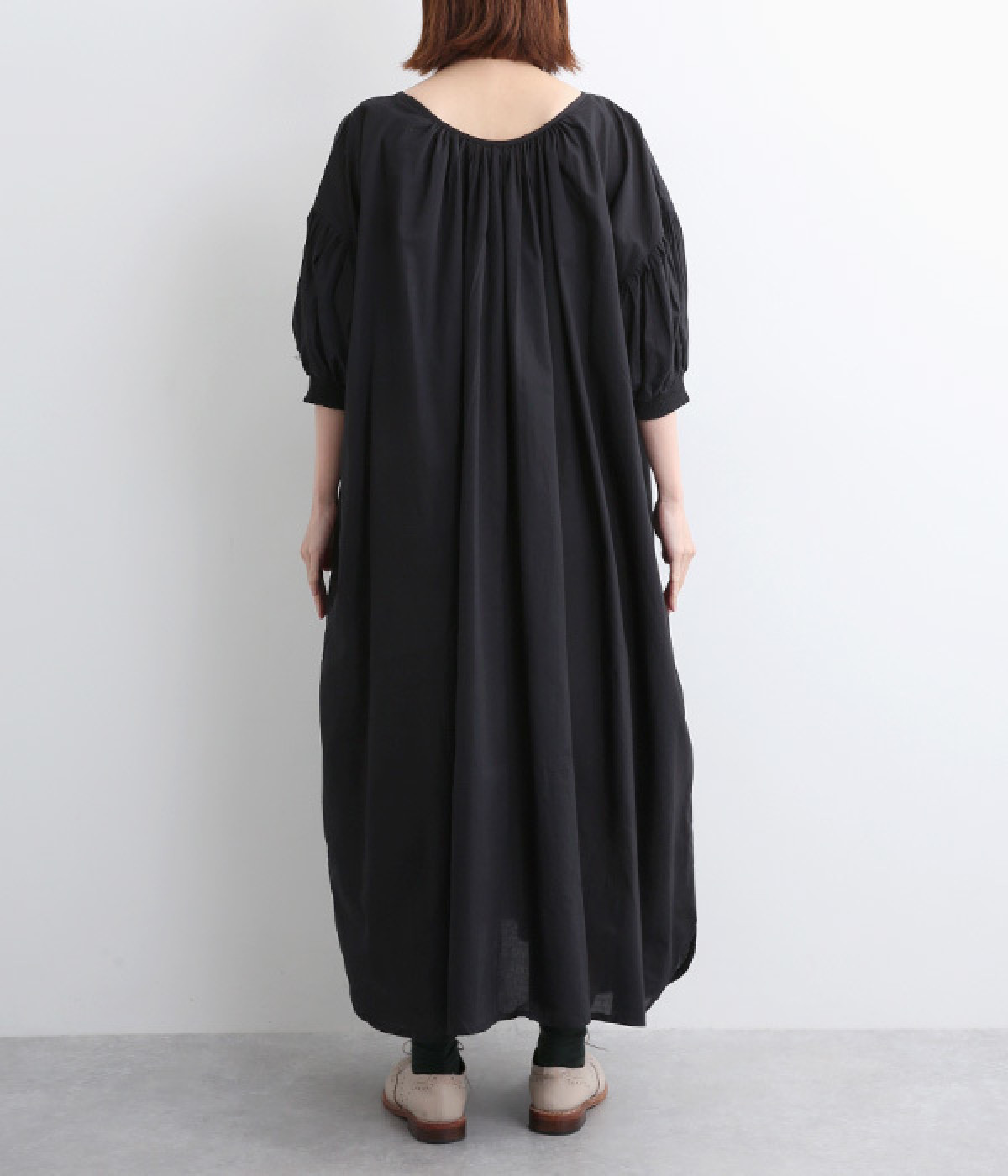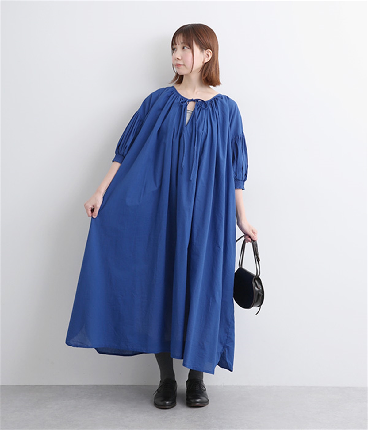 袖と首まわりに贅沢にギャザーをあしらったワンピースです。たっぷりと空気をはらみ、やわらかなボリューム感を表現。前後どちらでも着られる2way仕様で、コーディネートの幅も広がります。袖口のシャーリングもアクセントに。