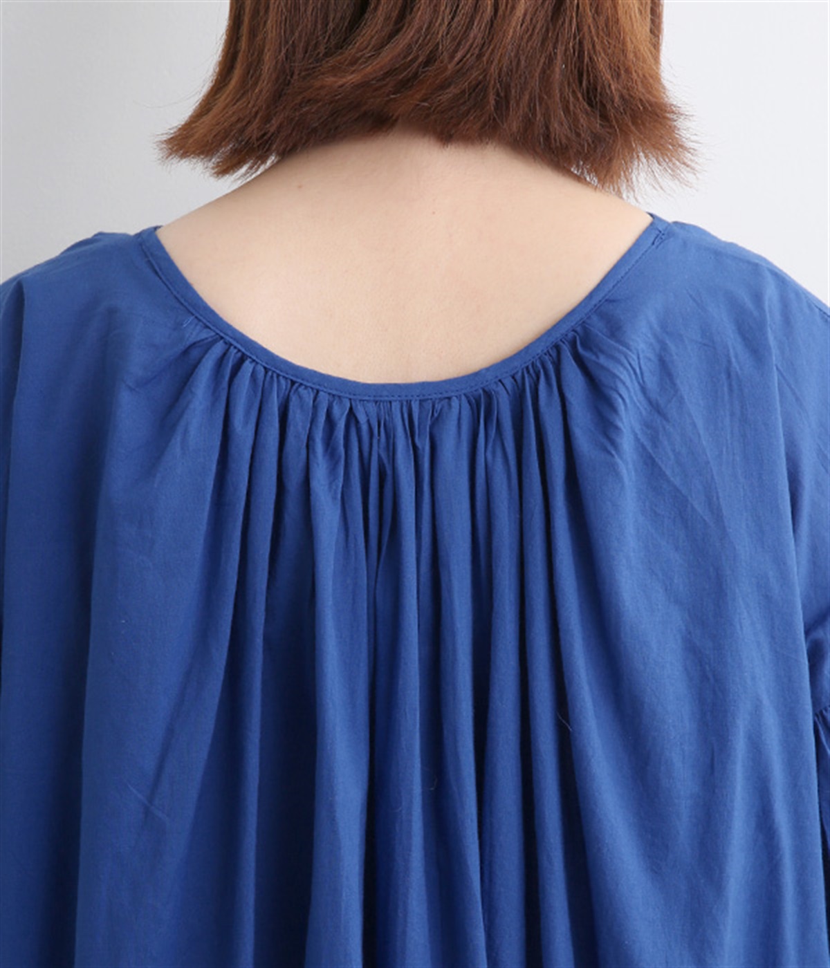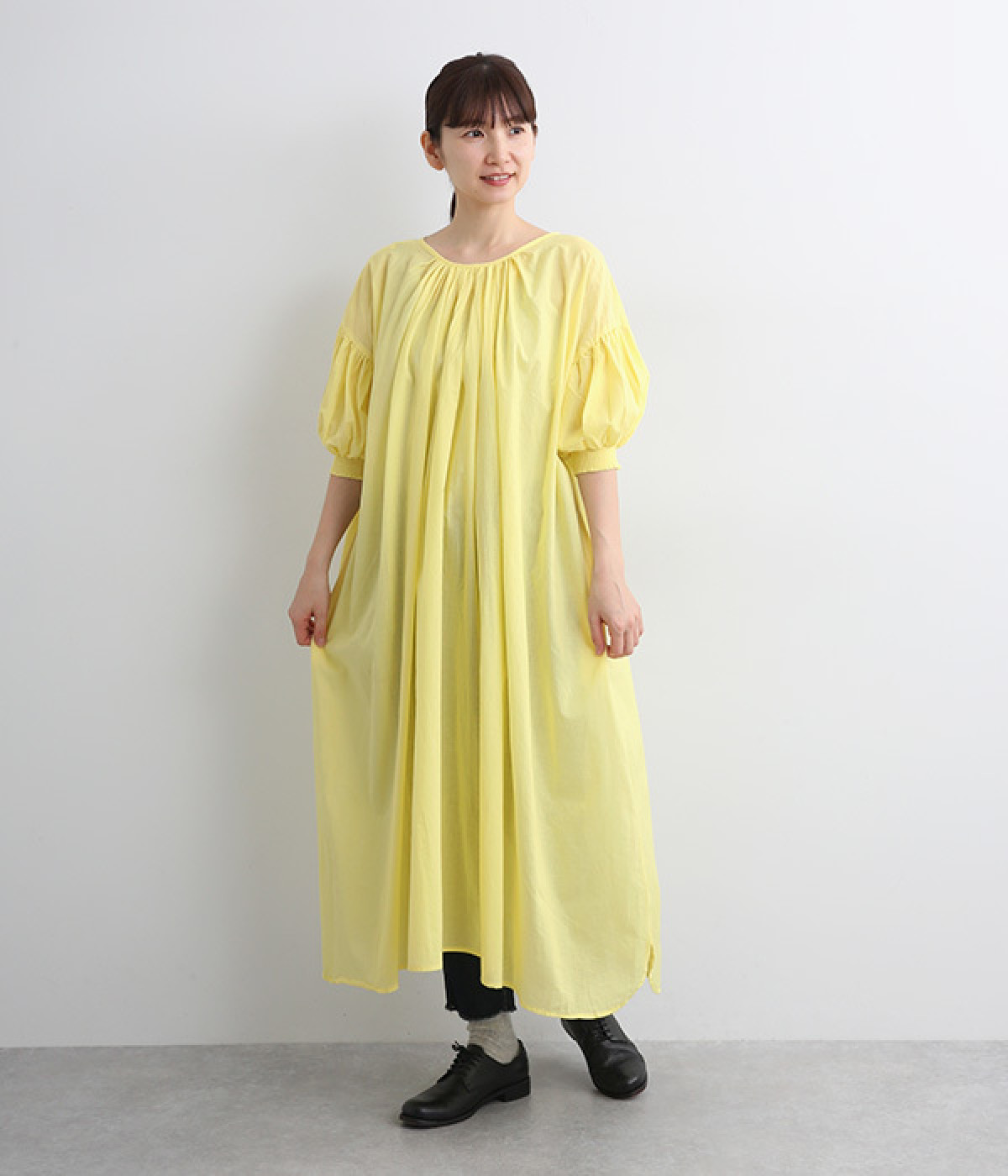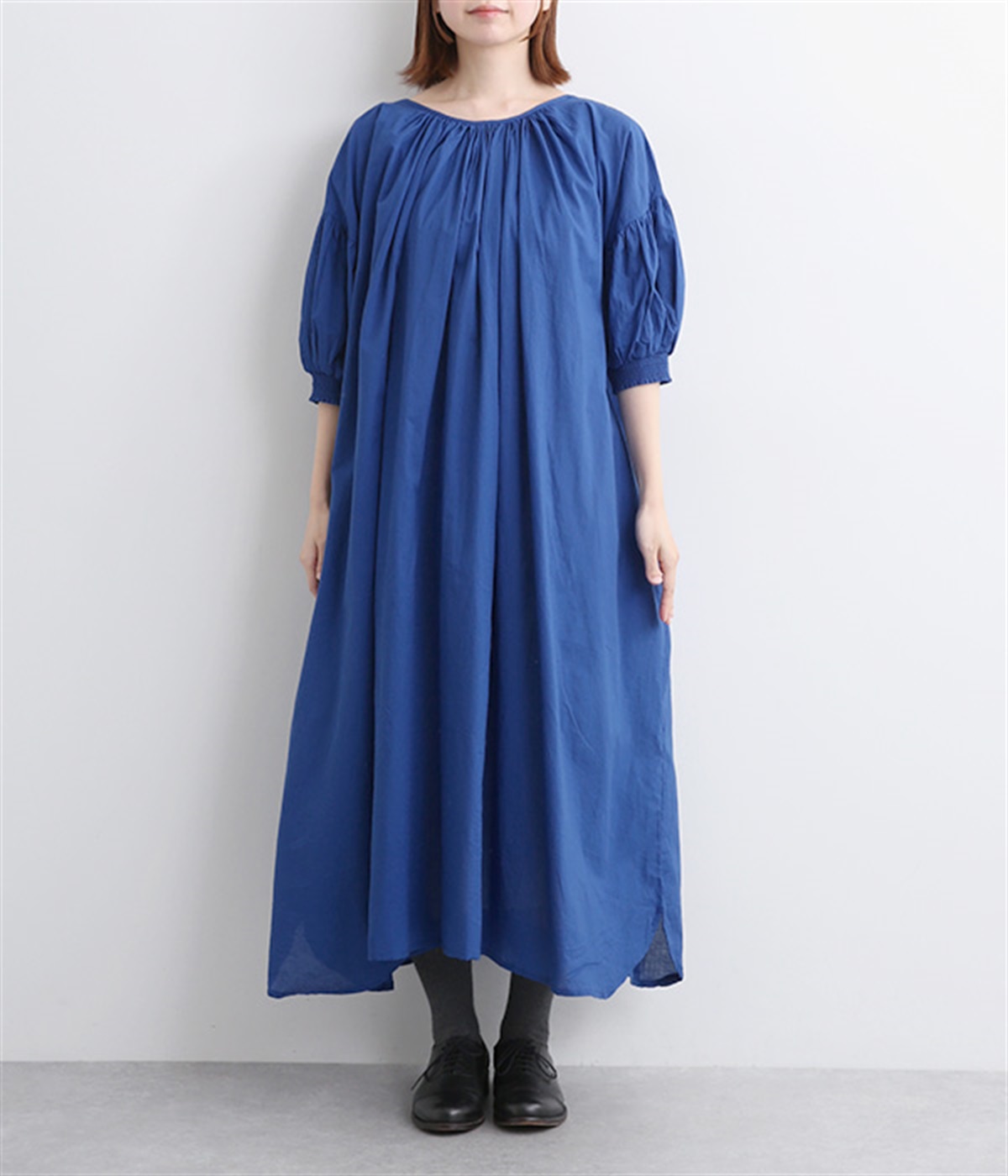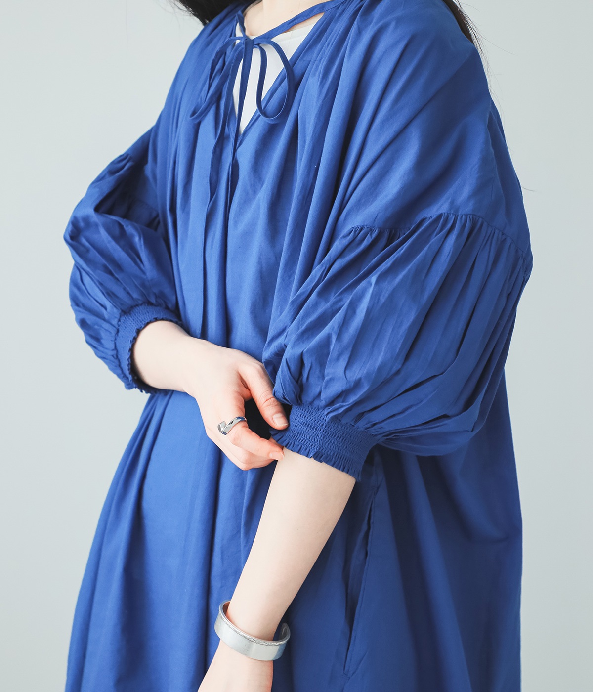 袖と首まわりに贅沢にギャザーをあしらったワンピースです。たっぷりと空気をはらみ、やわらかなボリューム感を表現。前後どちらでも着られる2way仕様で、コーディネートの幅も広がります。袖口のシャーリングもアクセントに。